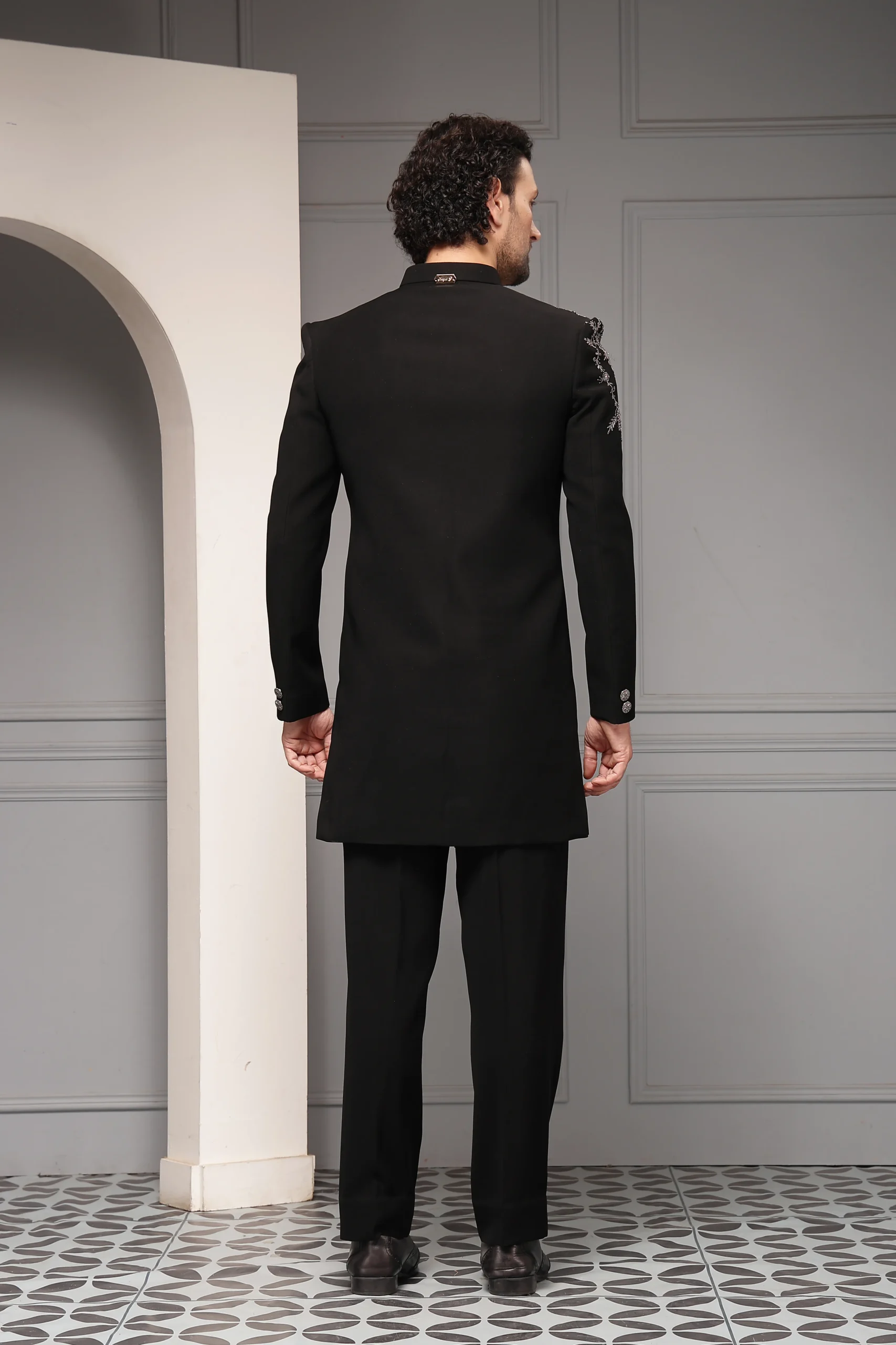 Contemporary black bandhgala set with tonal embellishments from Golden Muslin By Soniya G