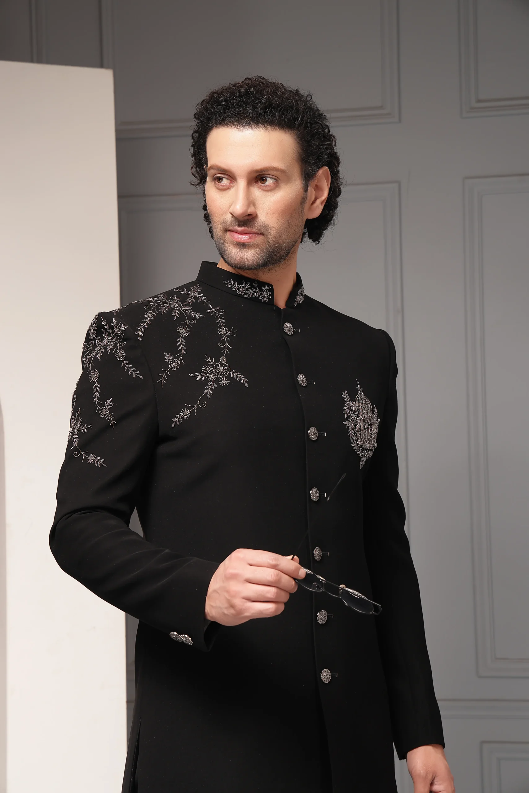 Refined black bandhgala set with metallic floral embroidery from Golden Muslin By Soniya G