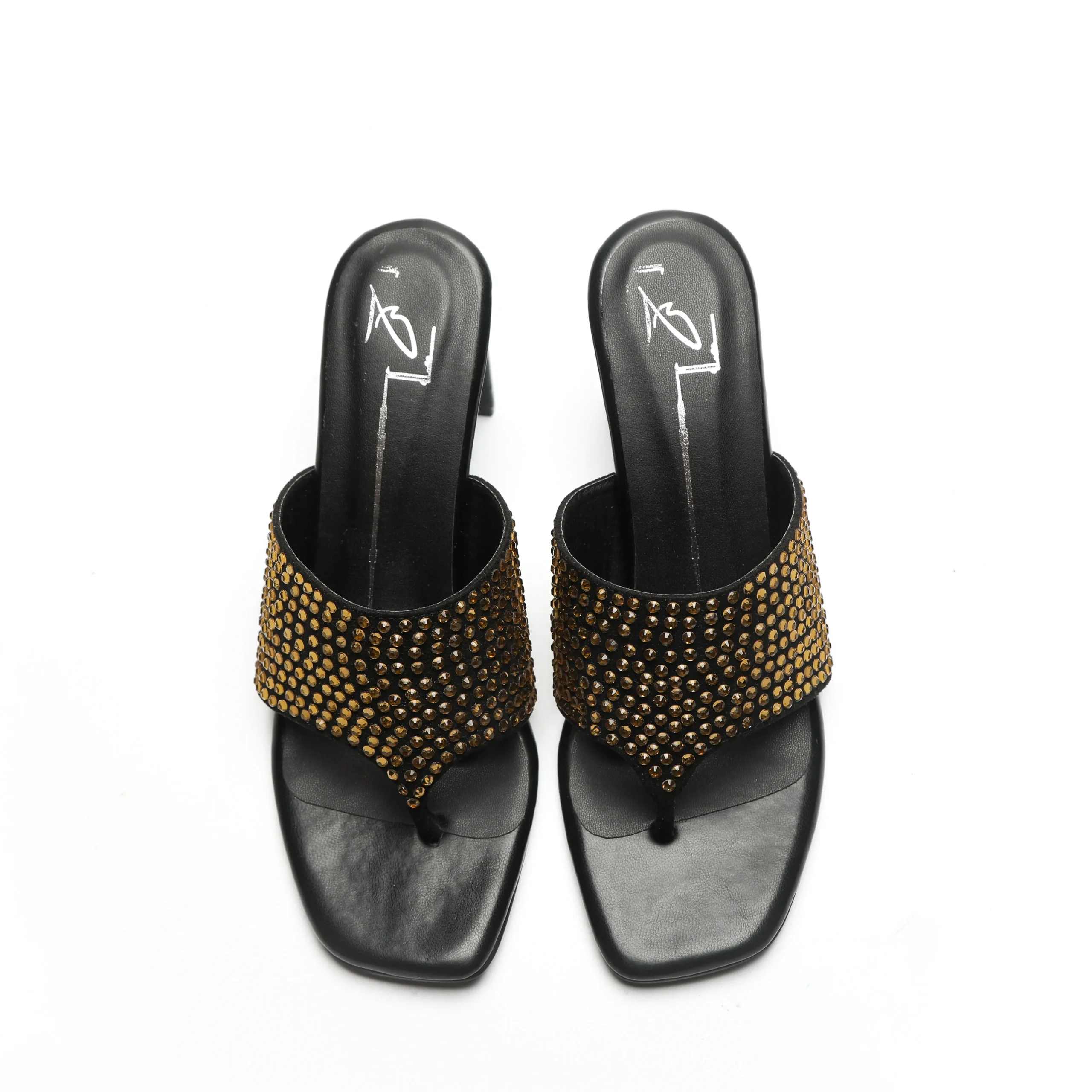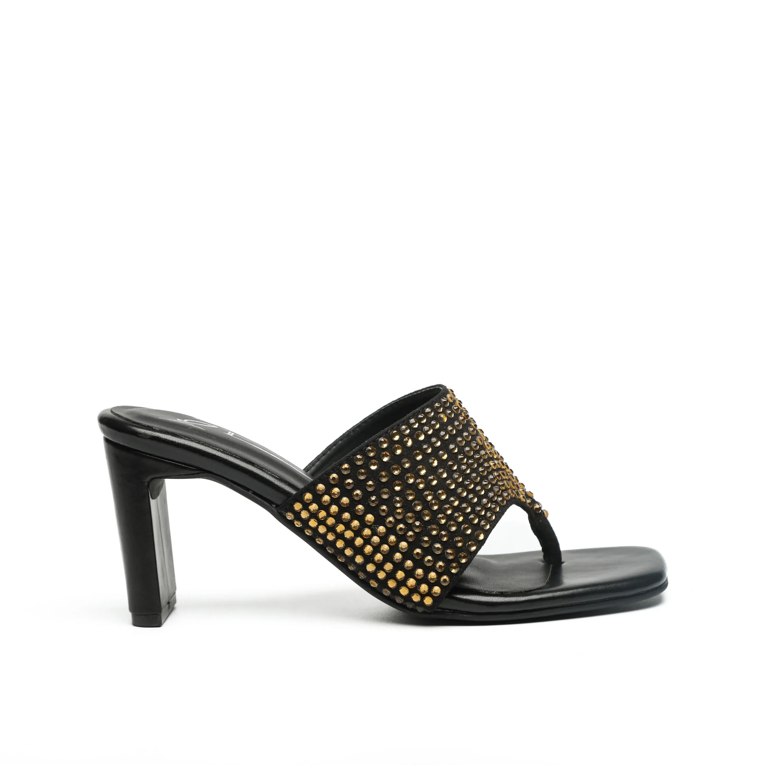 Style these black Swarovski embellished block heels with cocktail dresses, elegant sarees, or chic Indo-western outfits for evening occasions and parties. The shimmering crystal-studded upper adds a bold glamorous touch, while the comfortable block heel and gel cushioning make them perfect for extended wear during celebrations and social events.