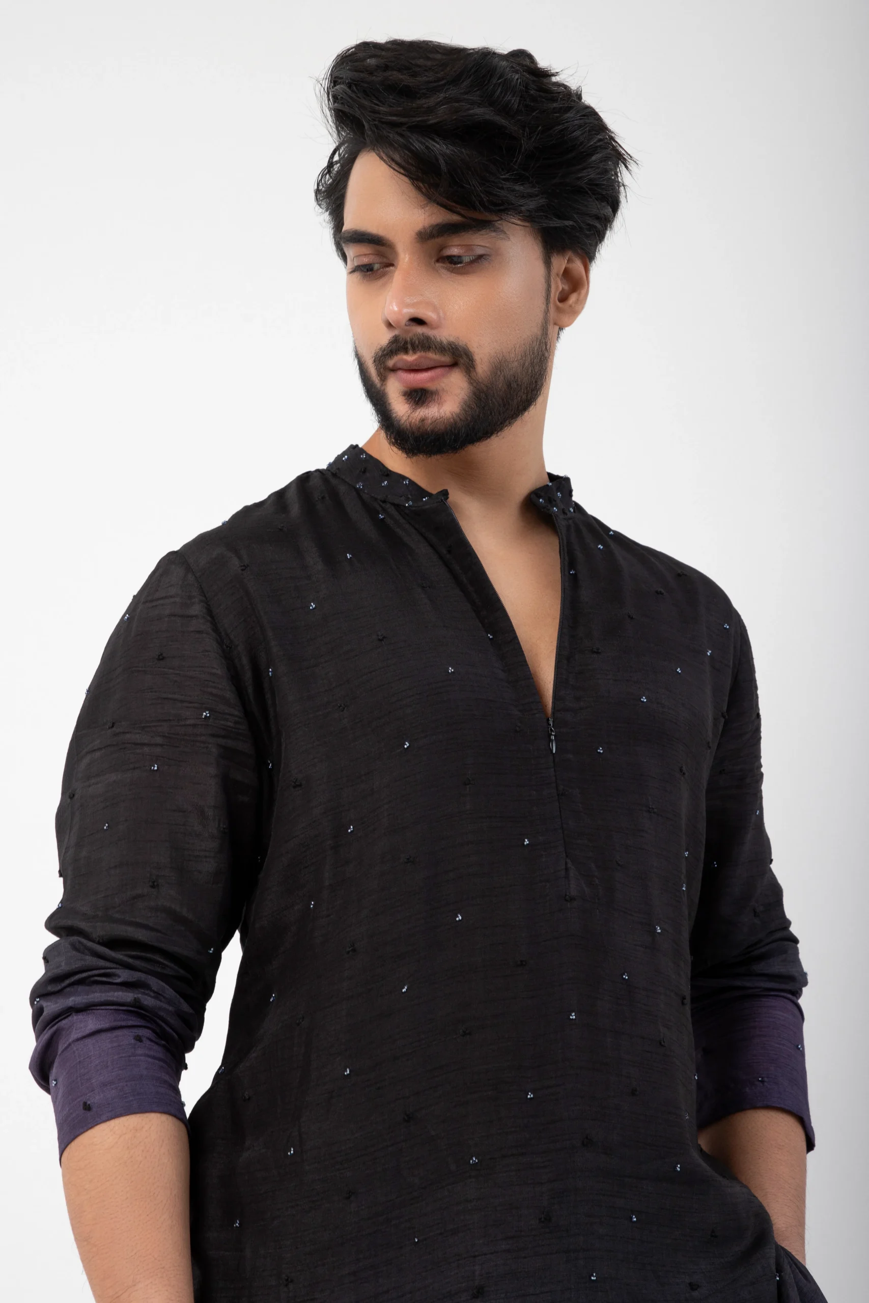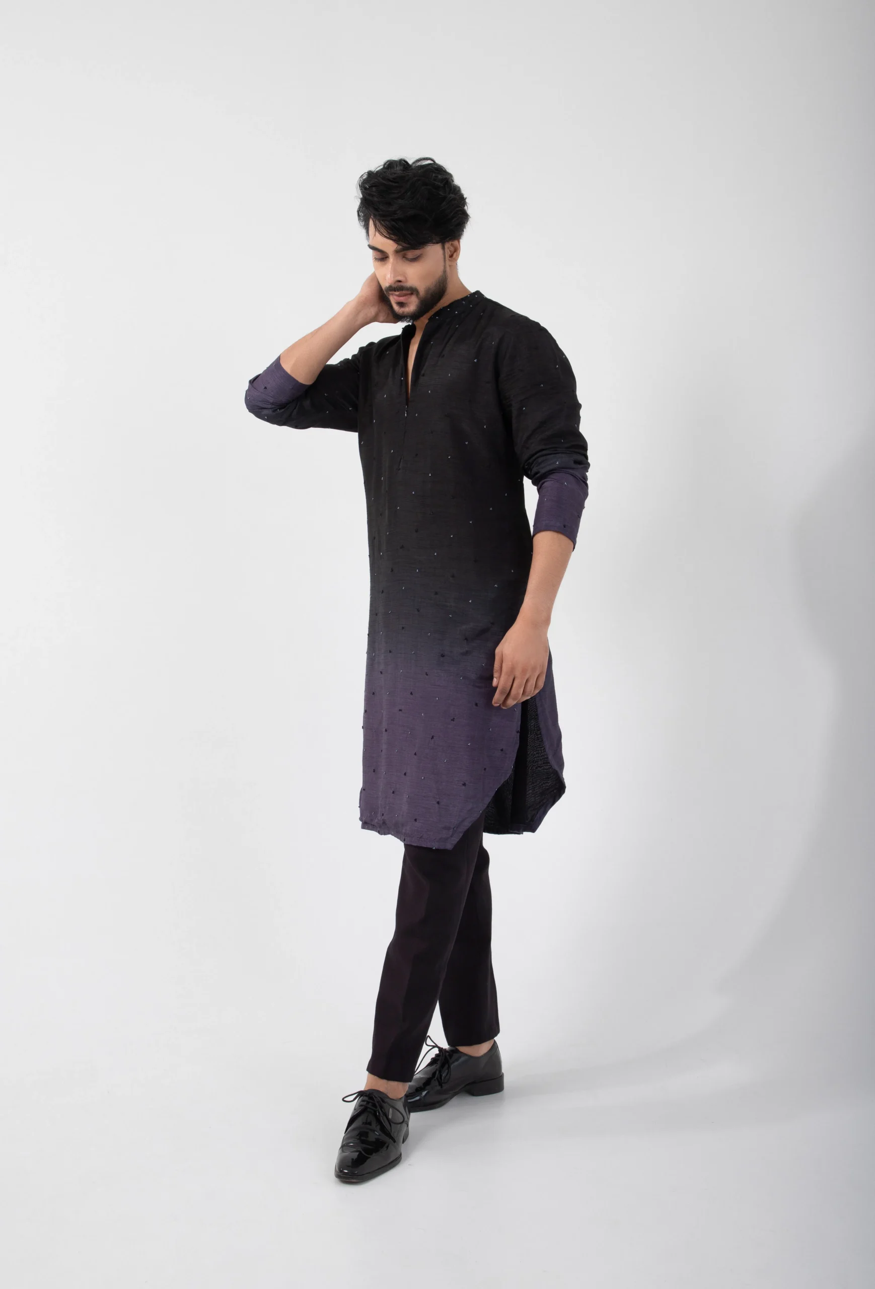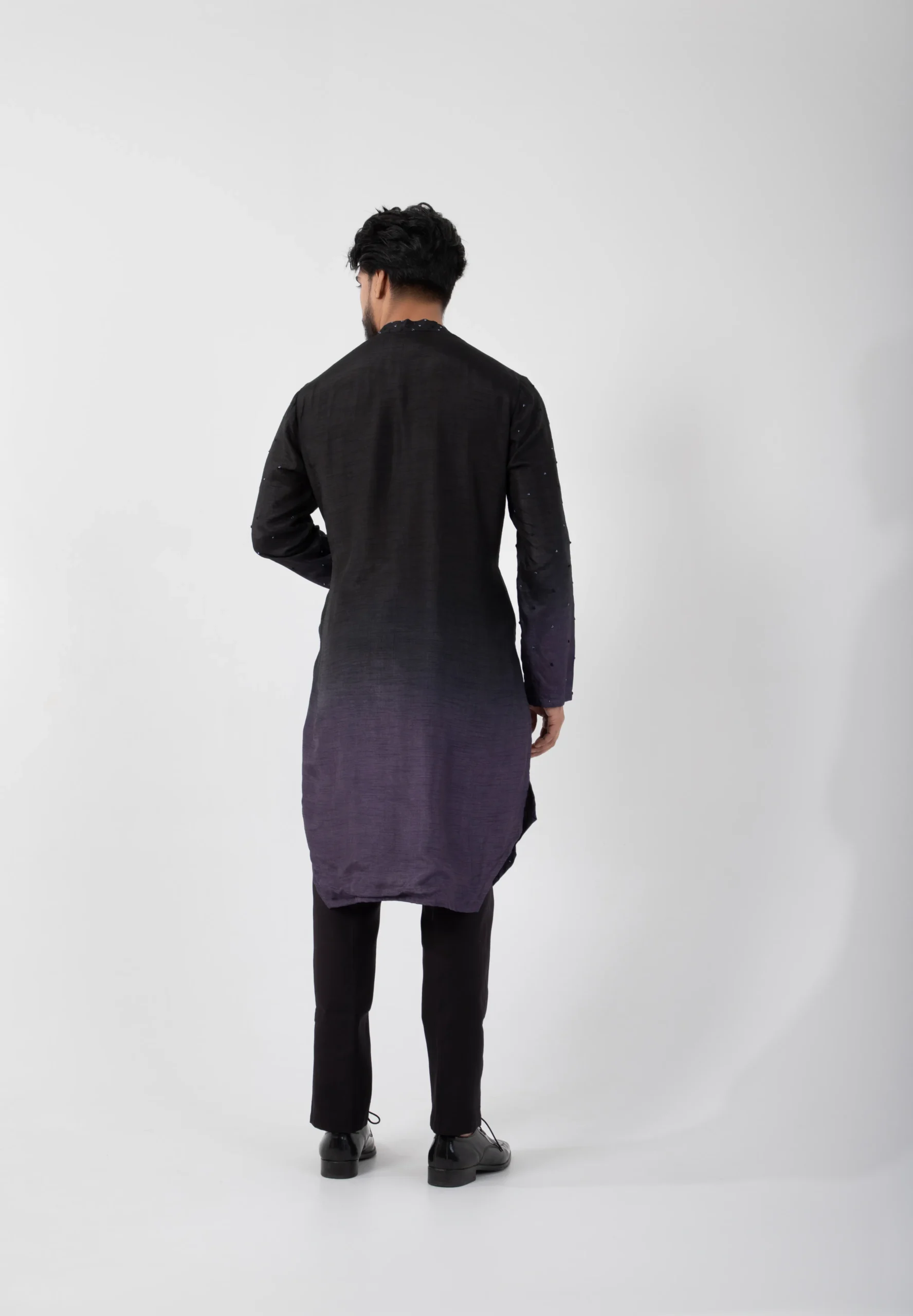 Introducing the Ombre Fusion Kurta Set, where traditional roots meet modern sophistication. This striking ensemble features a deep black kurta that seamlessly transitions into a rich purple gradient. Designed with a sleek mandarin collar and a refined V-neckline, it’s paired with tailored trousers for a sharp, contemporary silhouette. Perfect for making a bold statement at any celebration.
