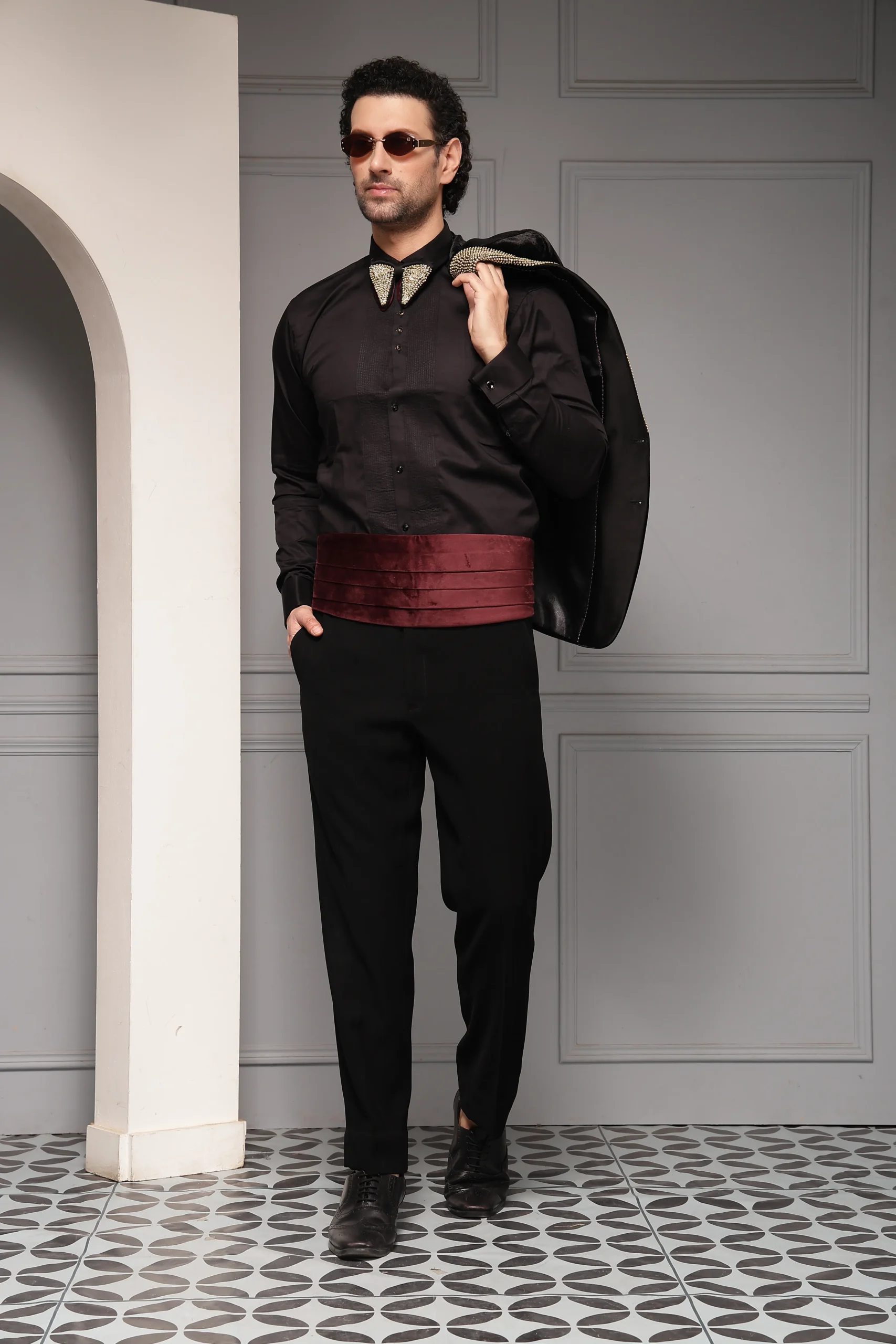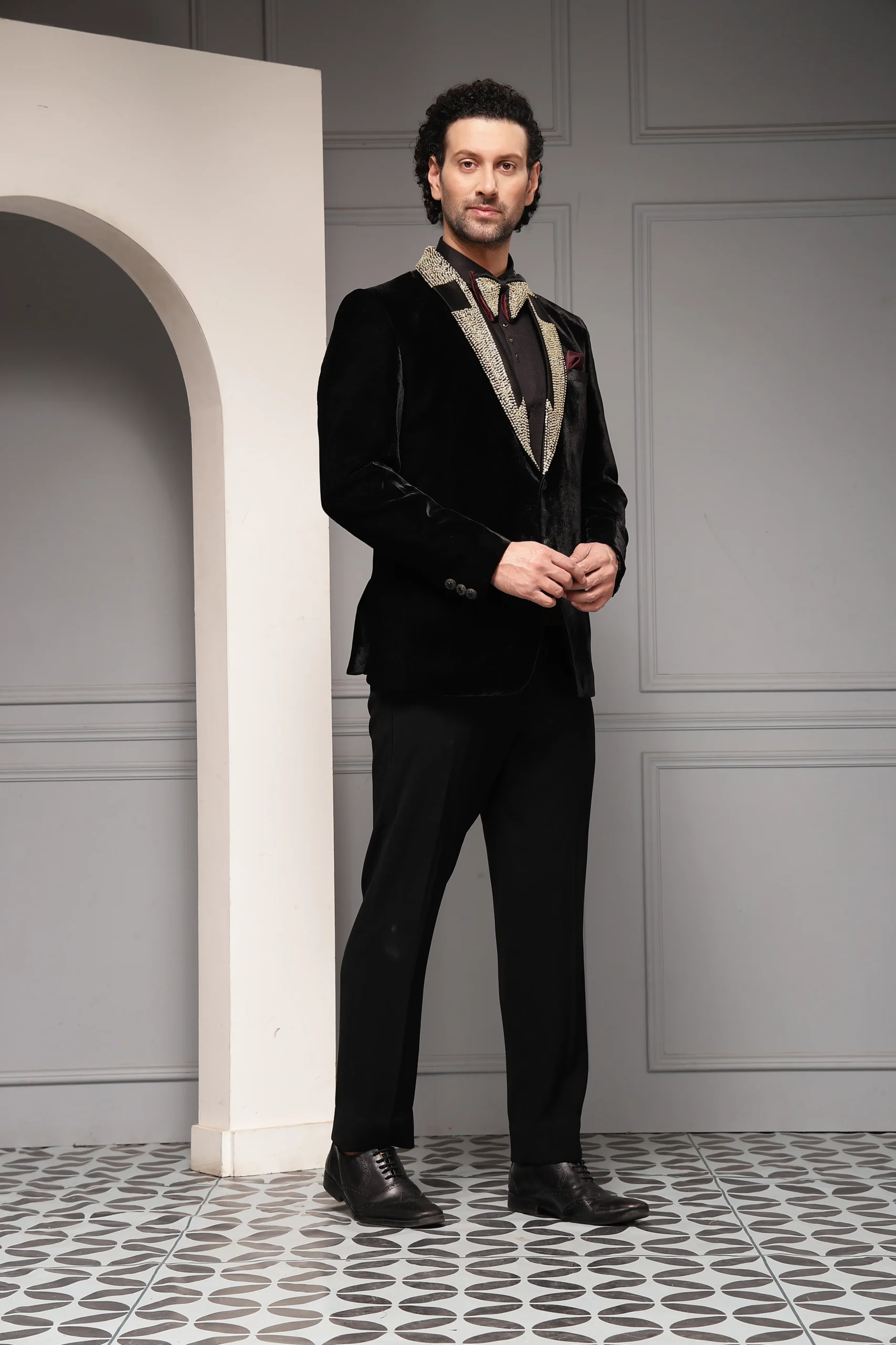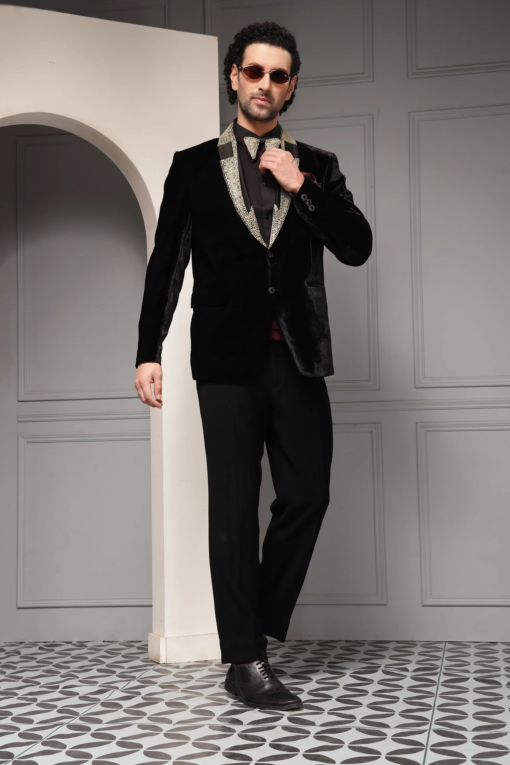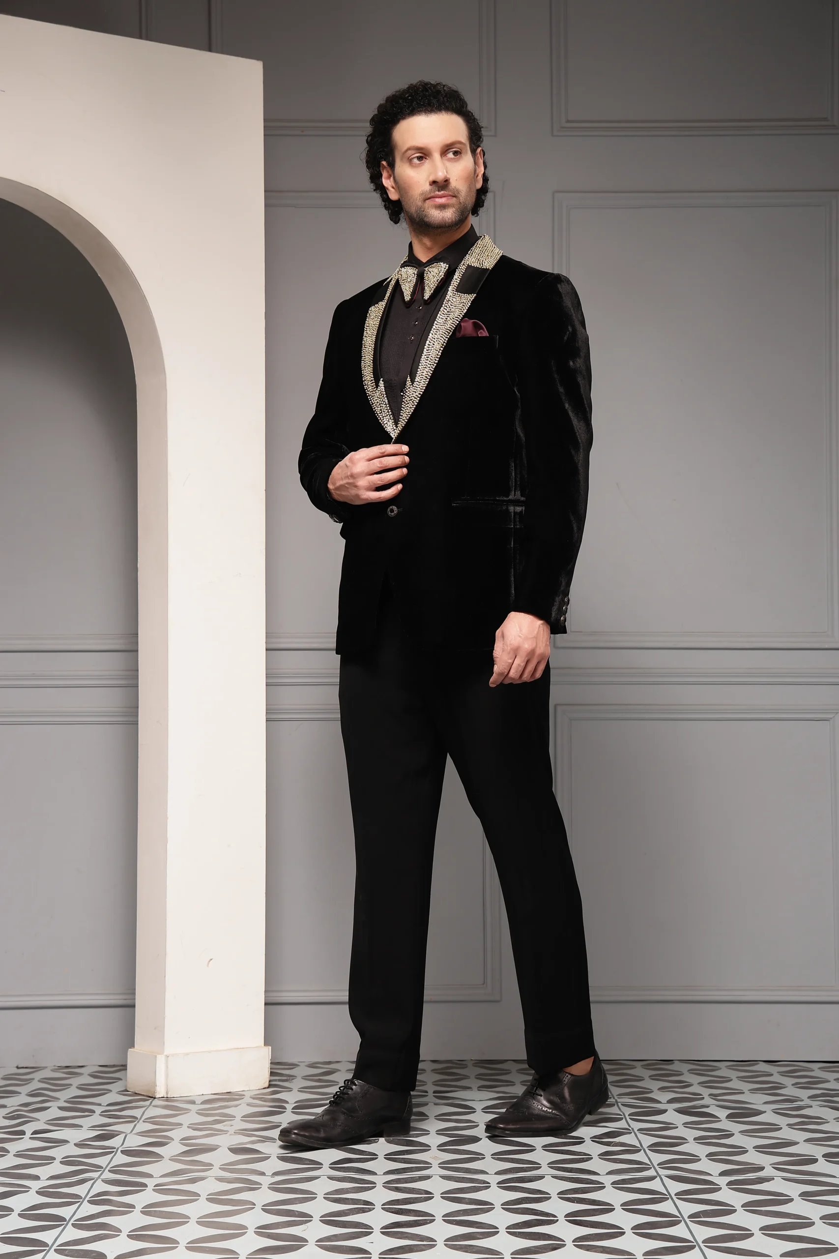 Introducing a statement black velvet tuxedo set crafted for elevated evening elegance. The velvet tuxedo blazer features a striking embellished shawl lapel, complemented by a coordinated bow tie and pocket square for a refined finish. Paired with a crisp formal shirt and tailored trousers, this ensemble delivers a rich, opulent silhouette ideal for high-glamour events and red-carpet occasions.