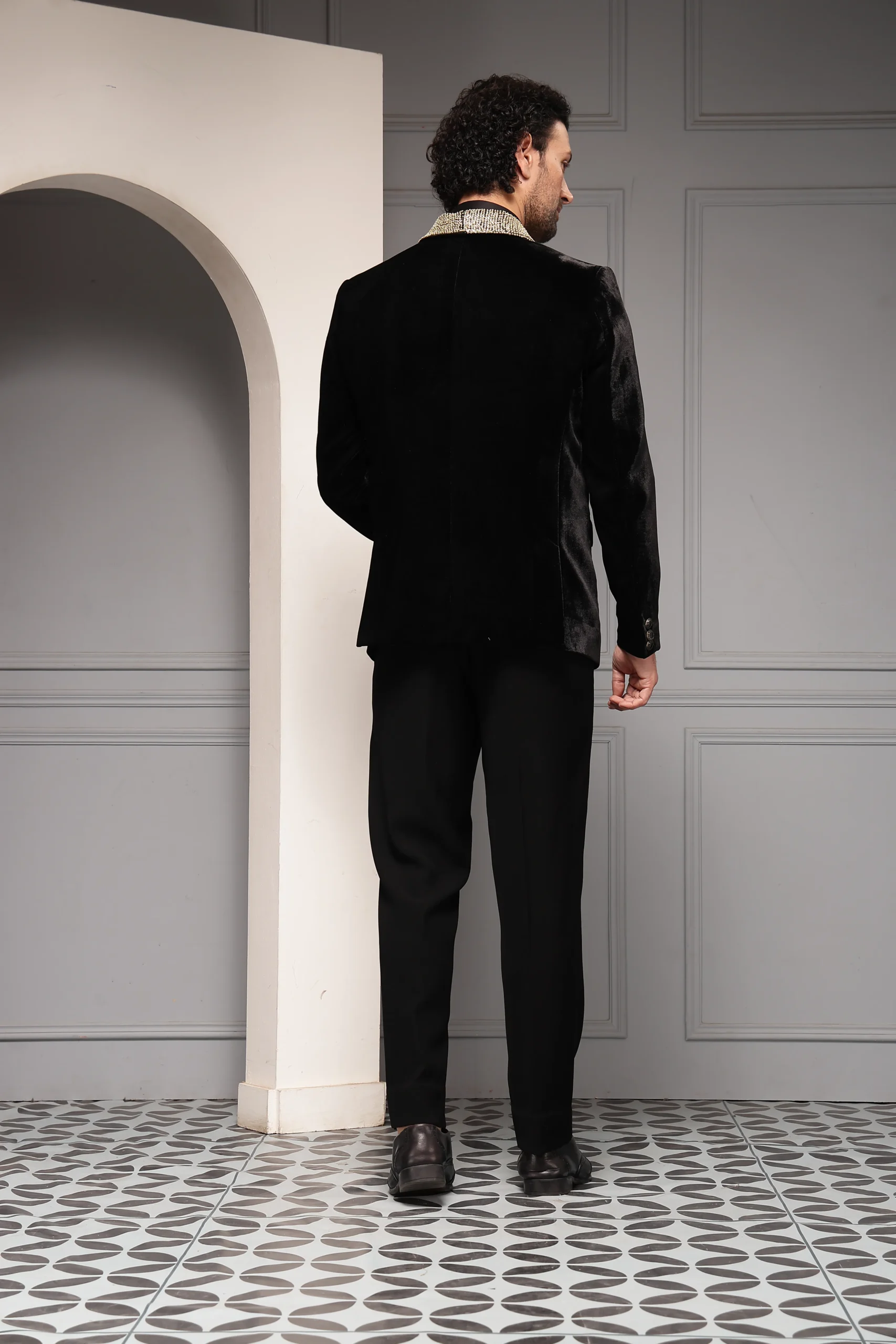 Style this statement velvet tuxedo with black patent leather shoes to enhance its evening glamour. Keep accessories refined—sleek cufflinks and a classic dress watch complement the embellished lapel without distraction