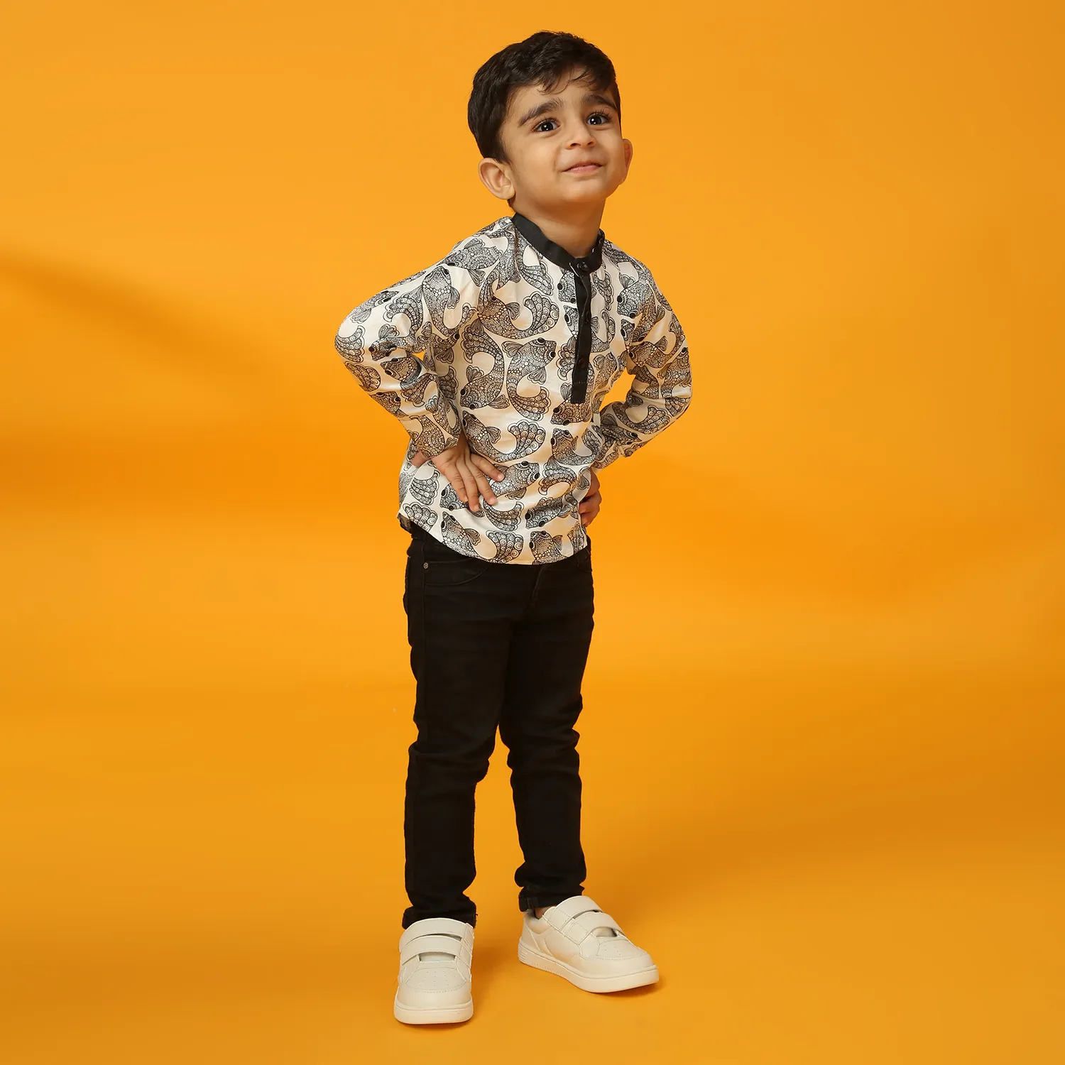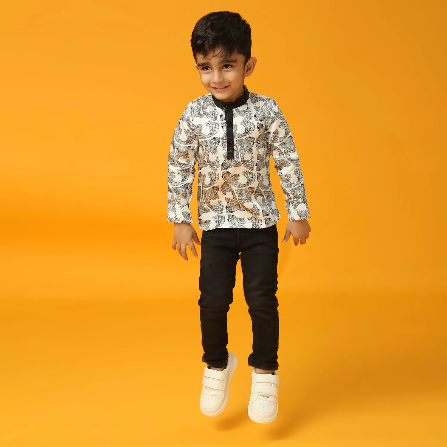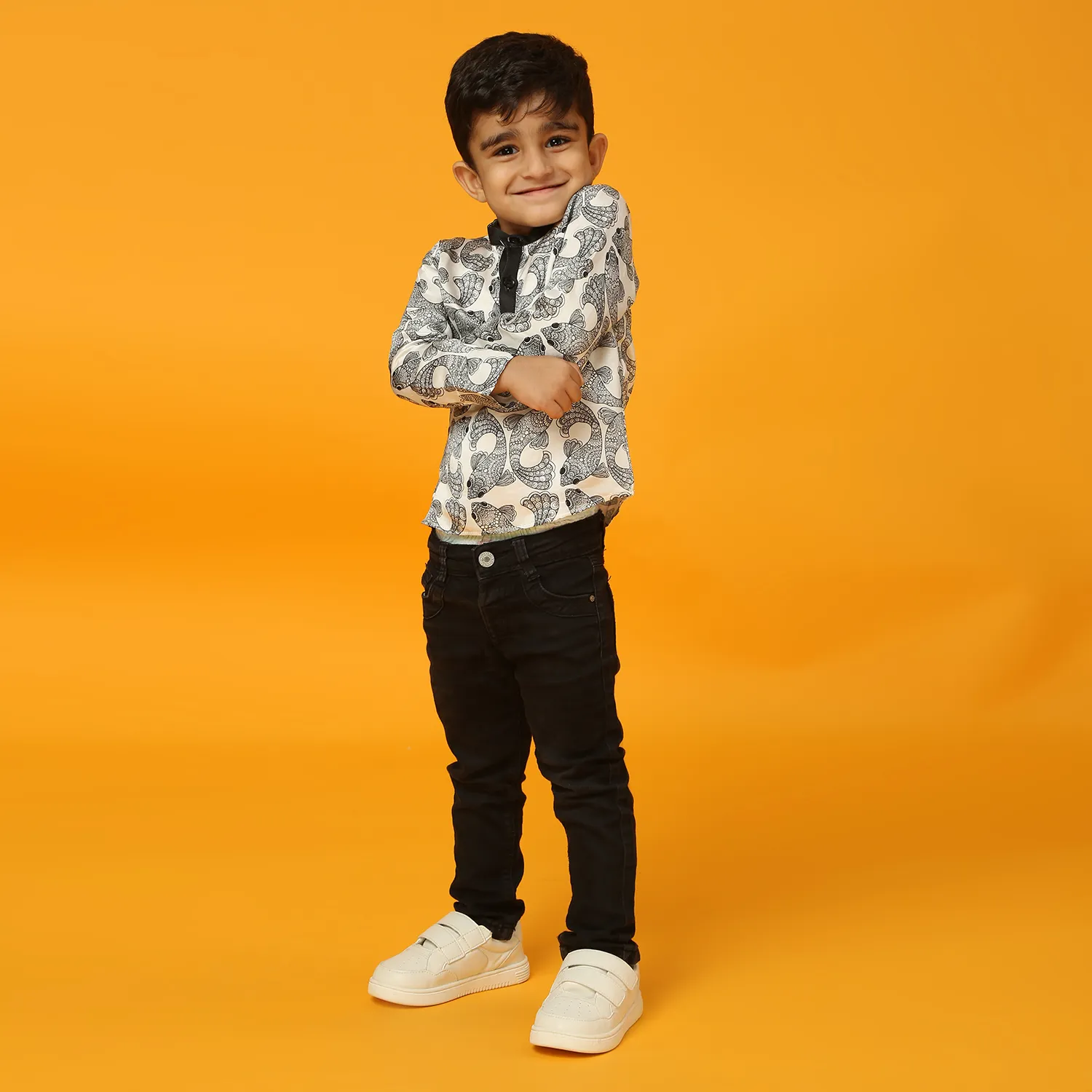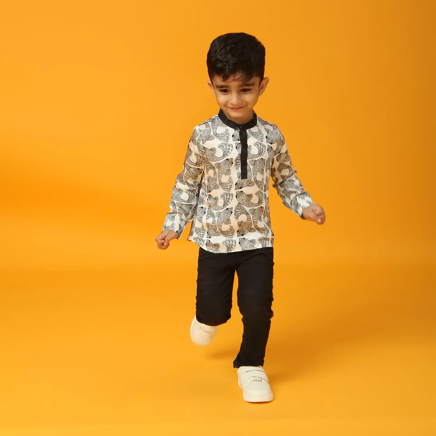 Introducing the Black & White Fish Print Short Kurta with Collar and Placket Detail, crafted in premium satin linen for a soft and breathable feel. Designed with a playful fish print and smart collar finish, this stylish kurta blends comfort with charm—perfect for festive occasions, celebrations, and casual ethnic wear for kids.