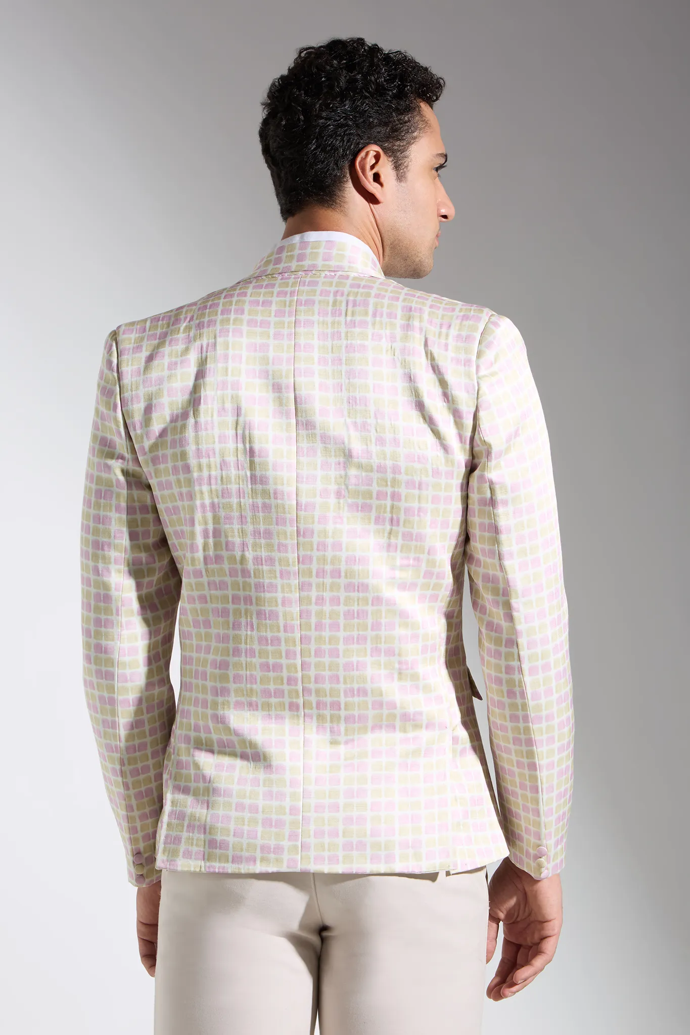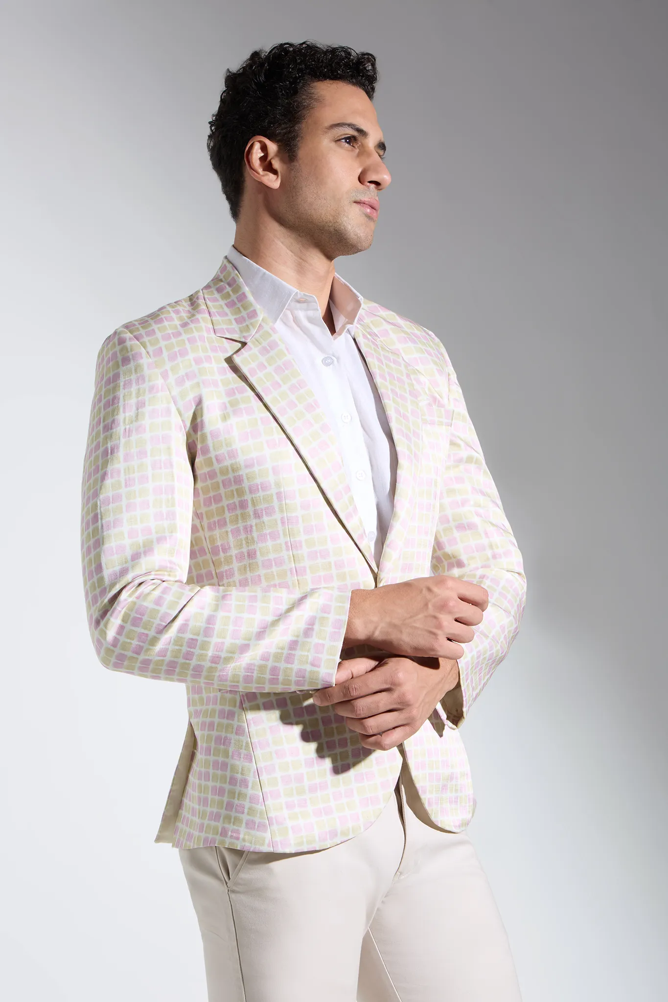 A cube print blazer jacket is bold, geometric and perfect for modern,fashion-forward look.Pair it with tailored black or white trousers for a sharp balanced silhoutte.Opt for loafers or formal shoes or sneakers for a trendy twist.
