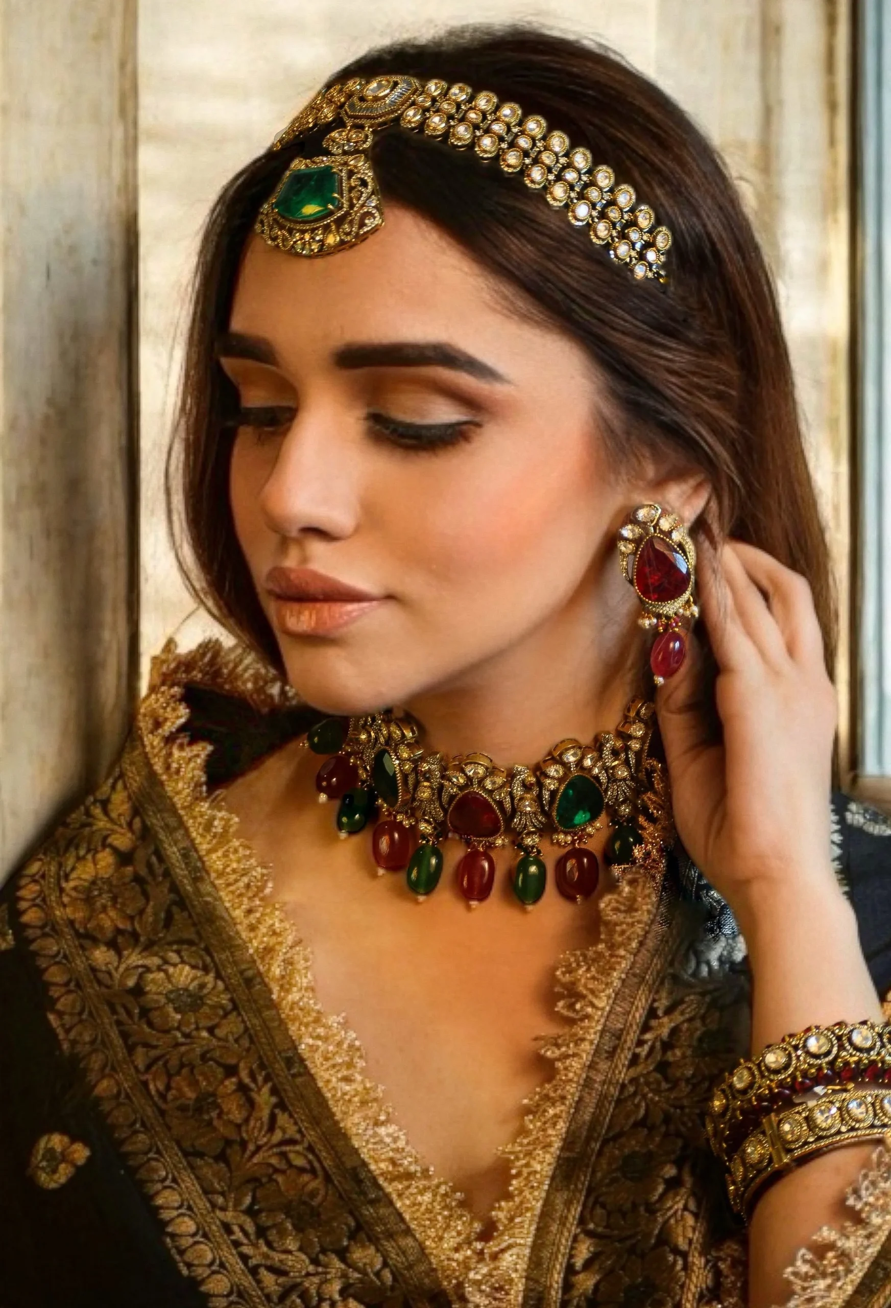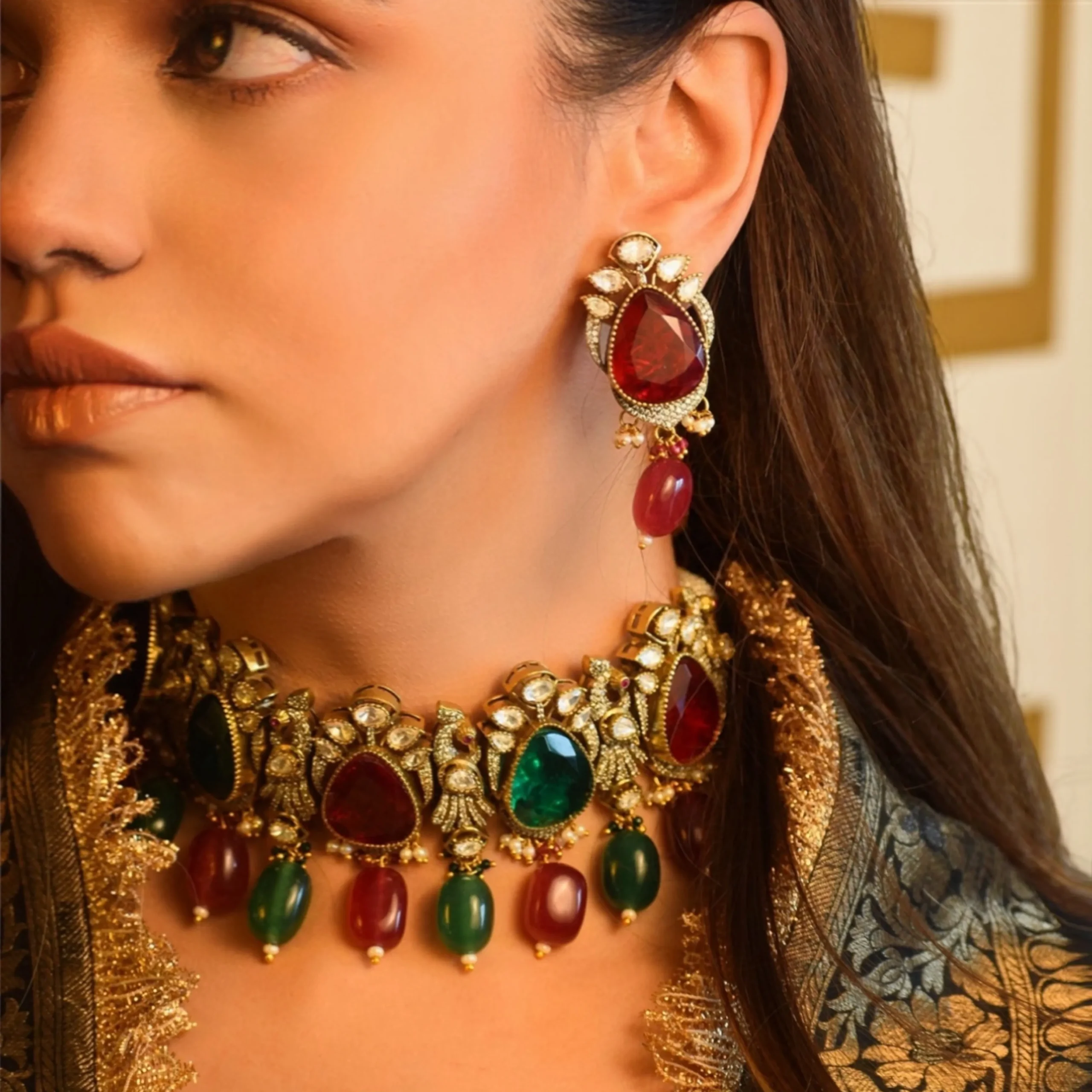 Style this statement necklace set with bridal lehengas, silk sarees, or traditional festive ensembles for weddings, receptions, and cultural celebrations. Pair with matching earrings and a maang tikka. A sleek bun or soft waves enhance the rich ruby and emerald detailing.
