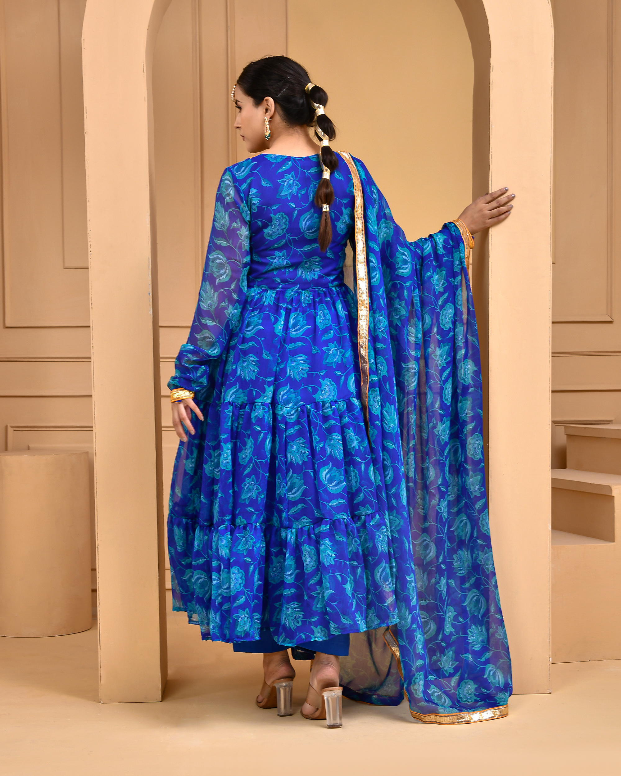 Introducing a blue chiffon floral print anarkali set. Designed in lightweight chiffon, the floor-length anarkali features an all-over floral print with subtle gota detailing and an angrakha-style silhouette, paired with a blue solid pant and a matching floral print dupatta finished with gota accents.