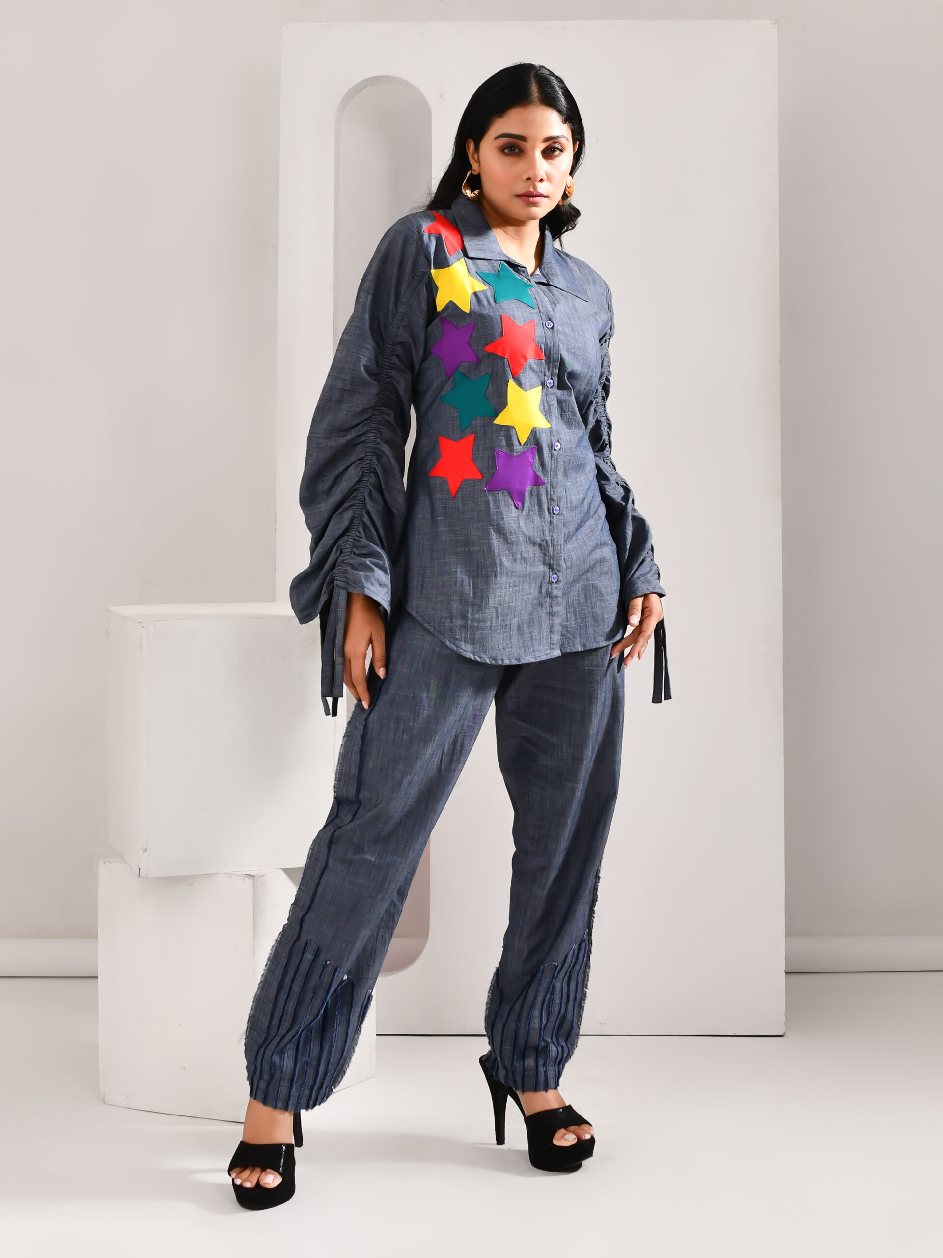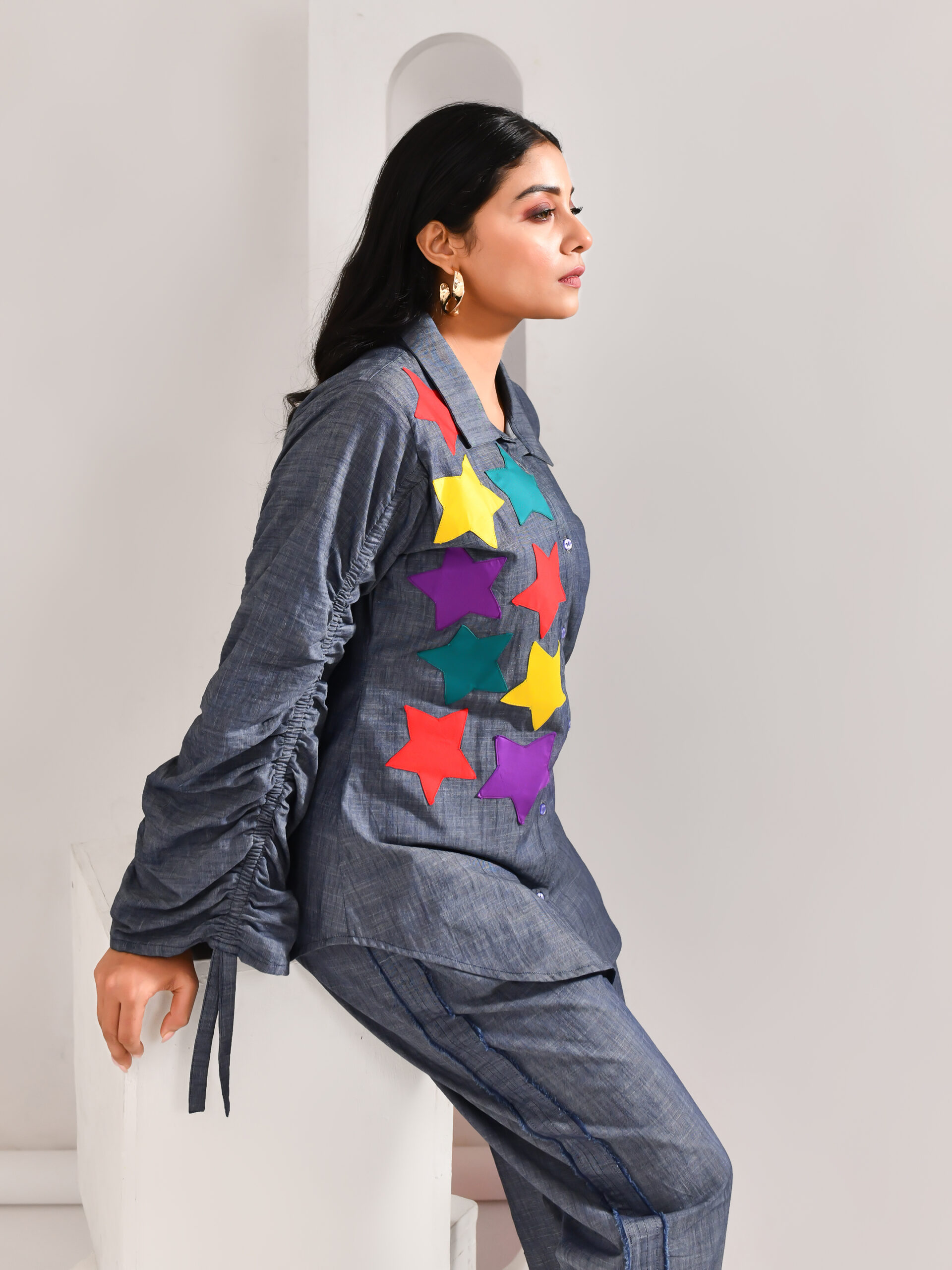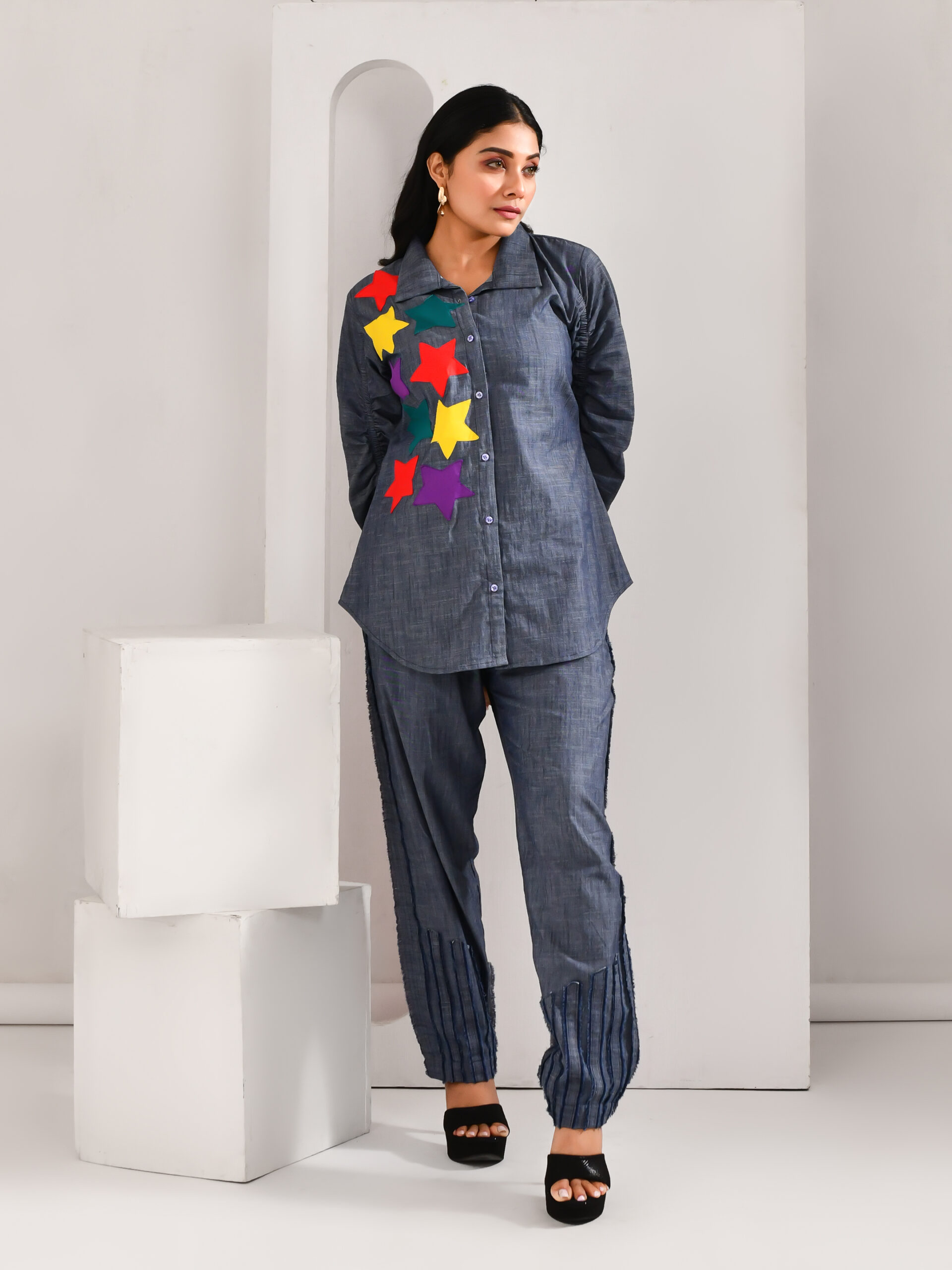 Introducing our denim blue blended cotton shirt, crafted in soft, durable fabric that combines everyday comfort with modern edge. Designed to make a statement, this stylish shirt is enhanced with contrasting star motifs across the body, adding a playful yet refined touch. Perfect for casual outings or weekend getaways, it captures the effortless charm of denim with a contemporary twist. Step out in confidence — because when you’re dressed in blue, the possibilities are truly endless.