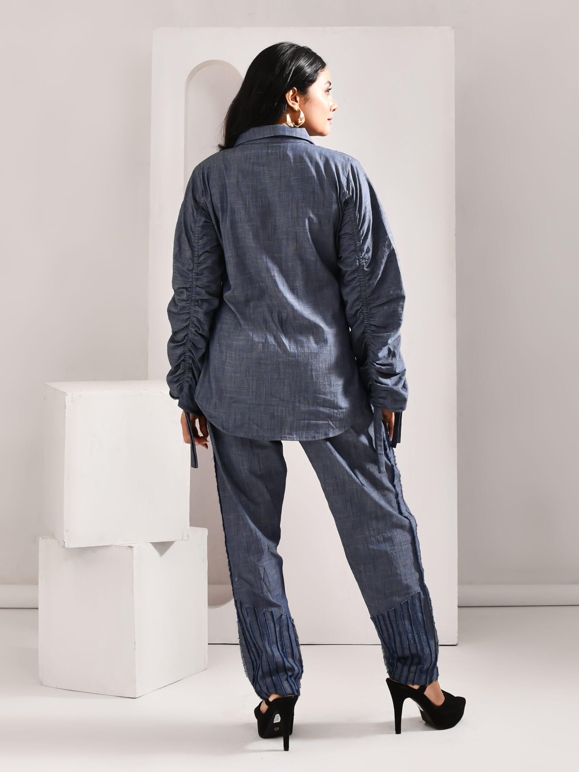 Golden Muslin two-toned panelled denim shirt dress with pearl embellishments and flattering modern design