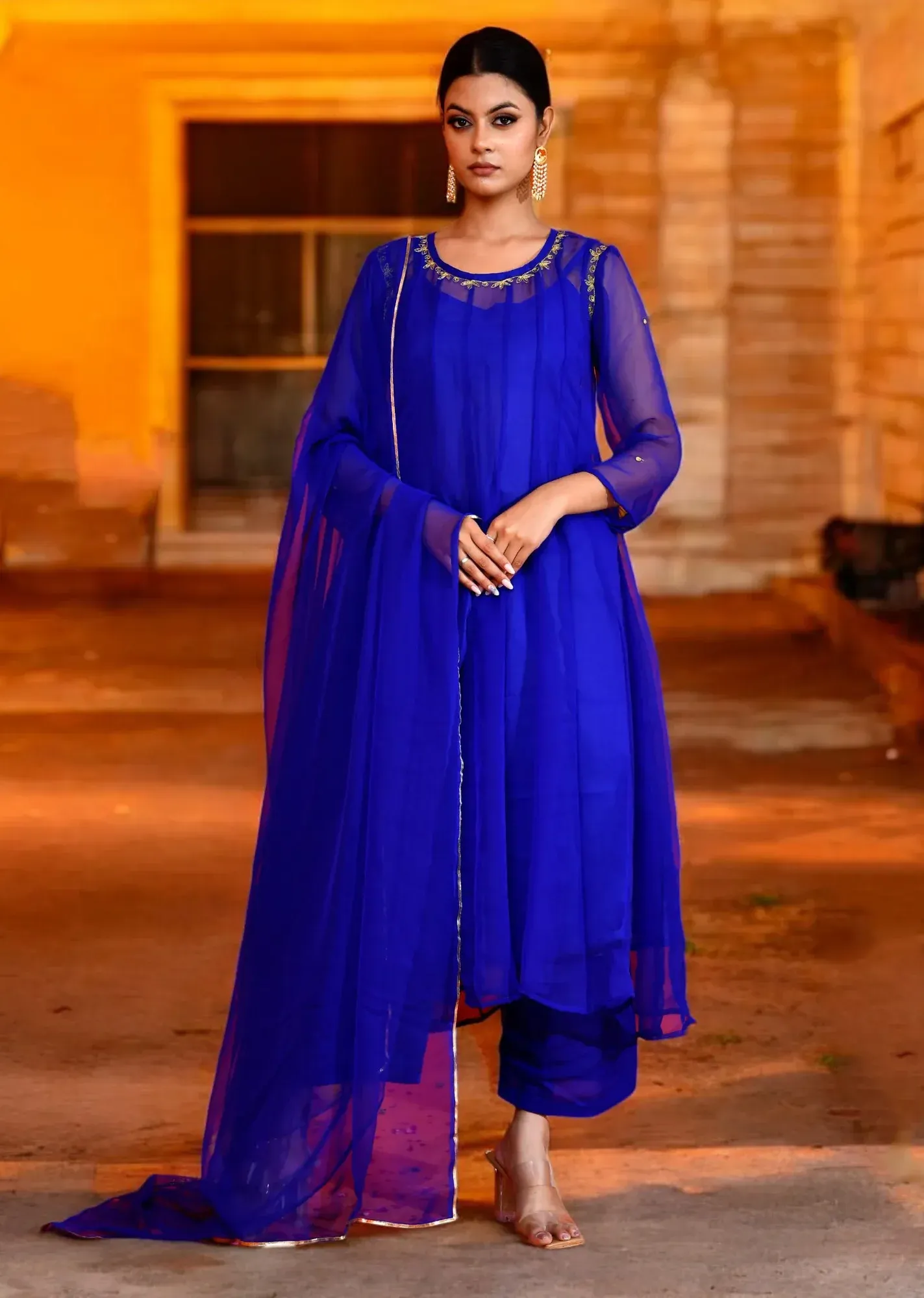 Introducing a refined and graceful blue georgette suit set designed to embody timeless elegance with artisanal detail. The flowing Anarkali kurta, crafted in lightweight georgette, features delicate aari embroidery that adds subtle texture and sophistication to its fluid silhouette. Perfect for festive gatherings and elegant occasions, this ensemble blends classic craftsmanship with effortless modern appeal.