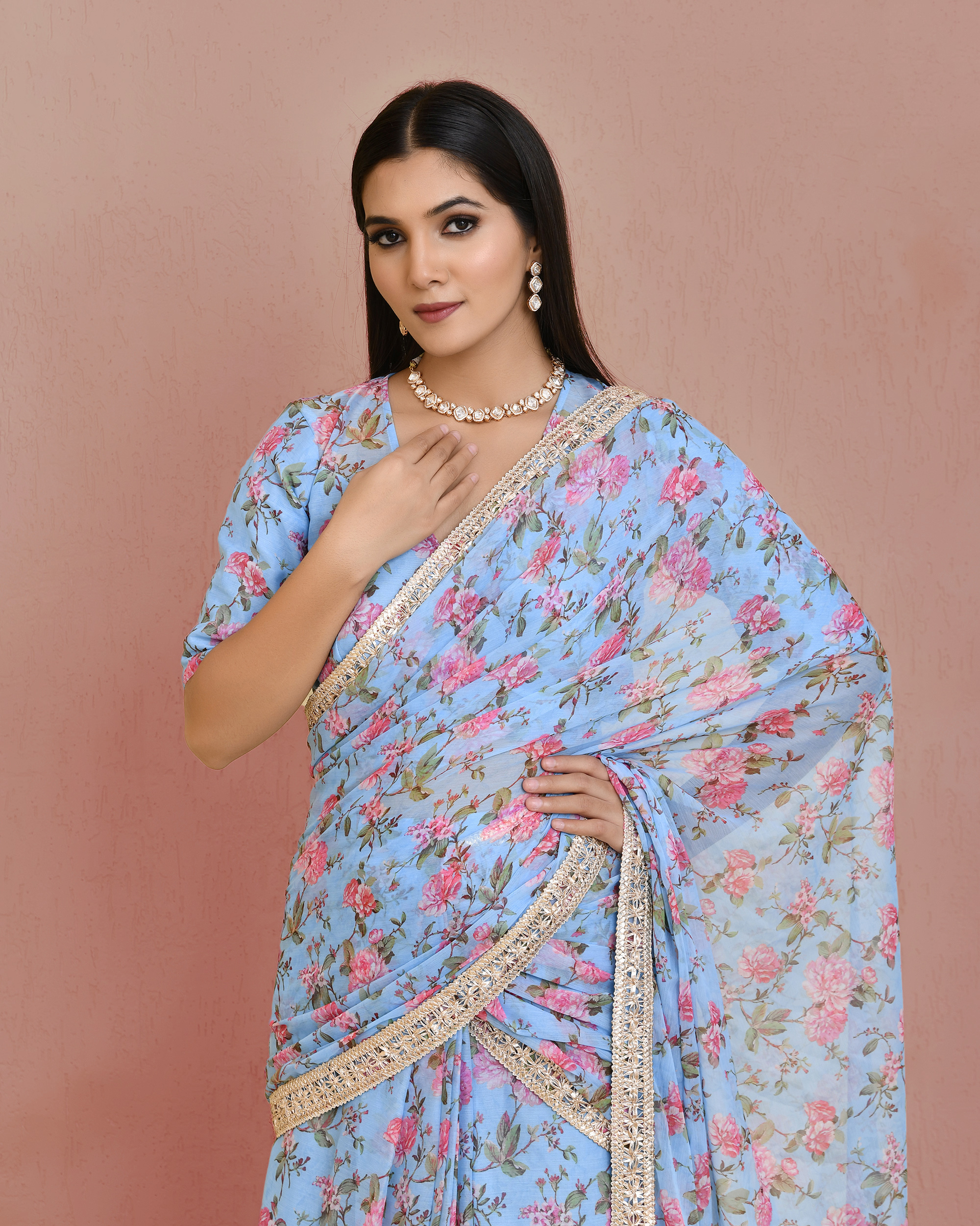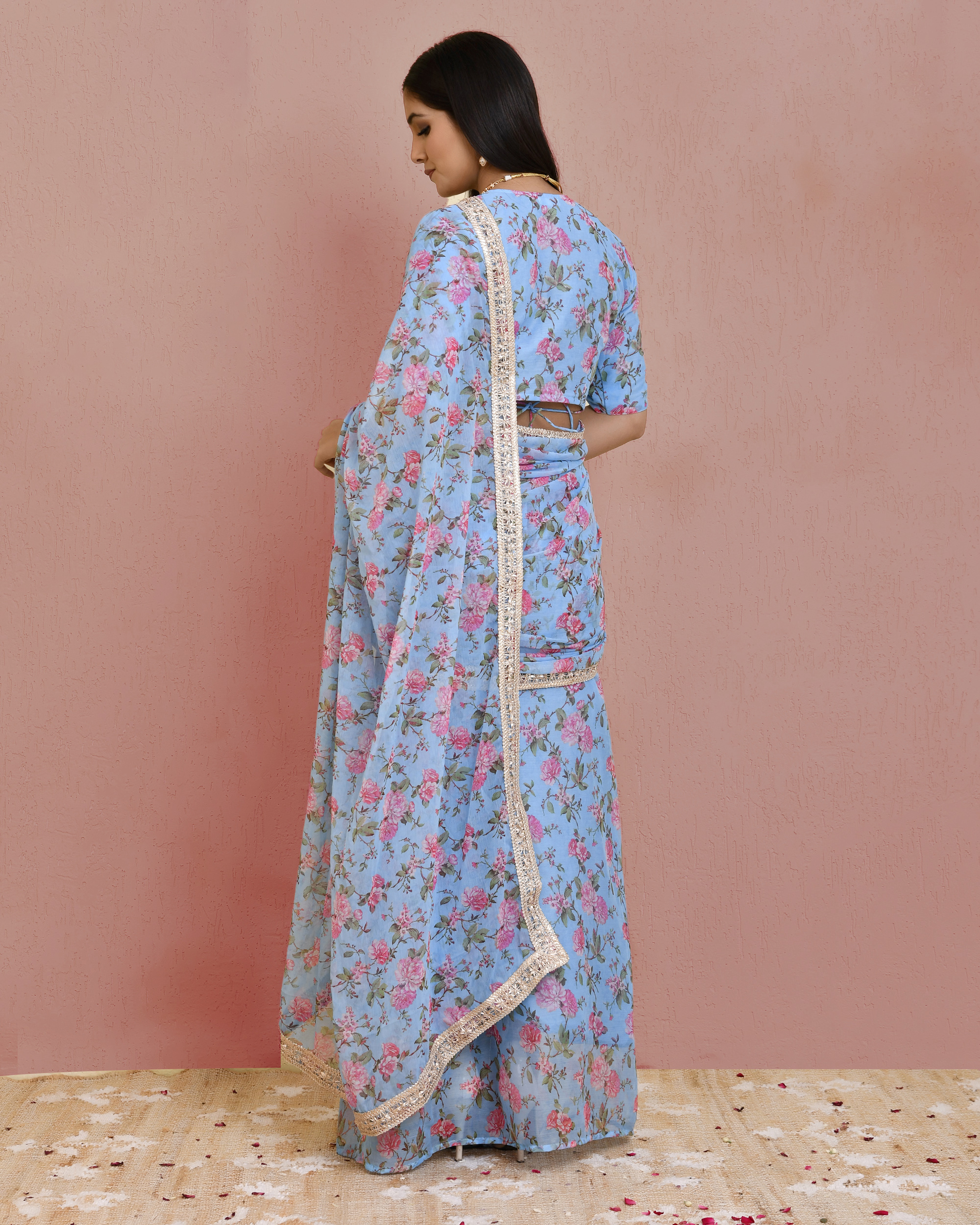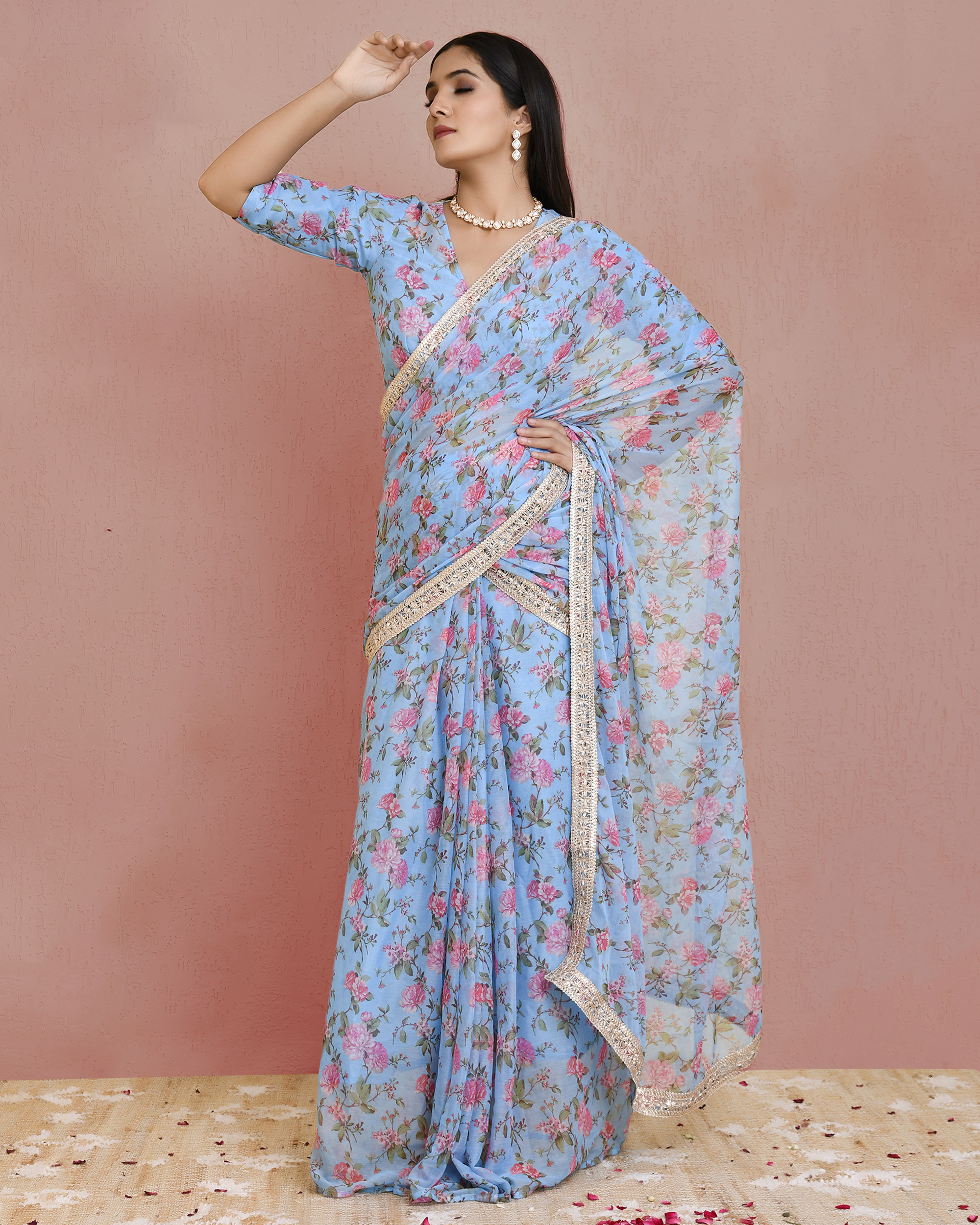 Introducing a blue pre-draped printed georgette saree, crafted for effortless elegance with a contemporary silhouette. Made in floral all-over printed georgette, the saree is enhanced with delicate lace border detailing for a refined finish. Paired with a matching short-sleeve wrap choli blouse, this pre-draped ensemble blends comfort, modern styling, and graceful movement—perfect for festive occasions, celebrations, and chic day-to-evening events.
