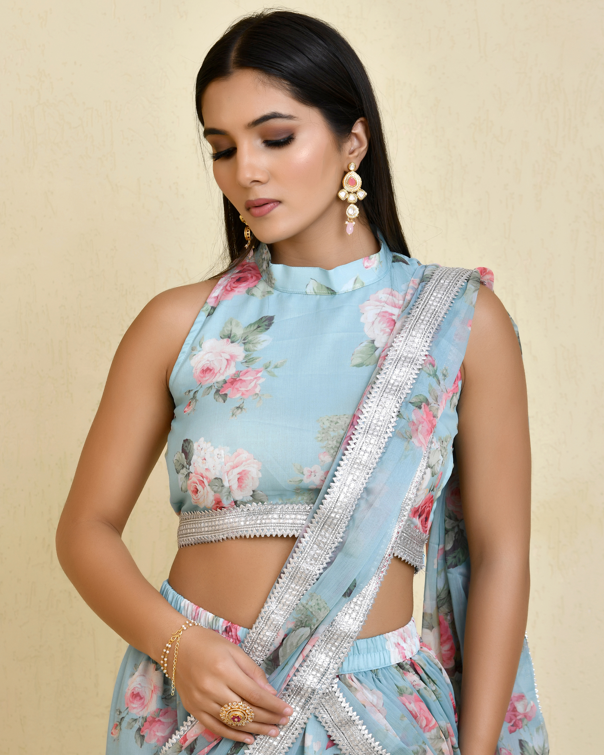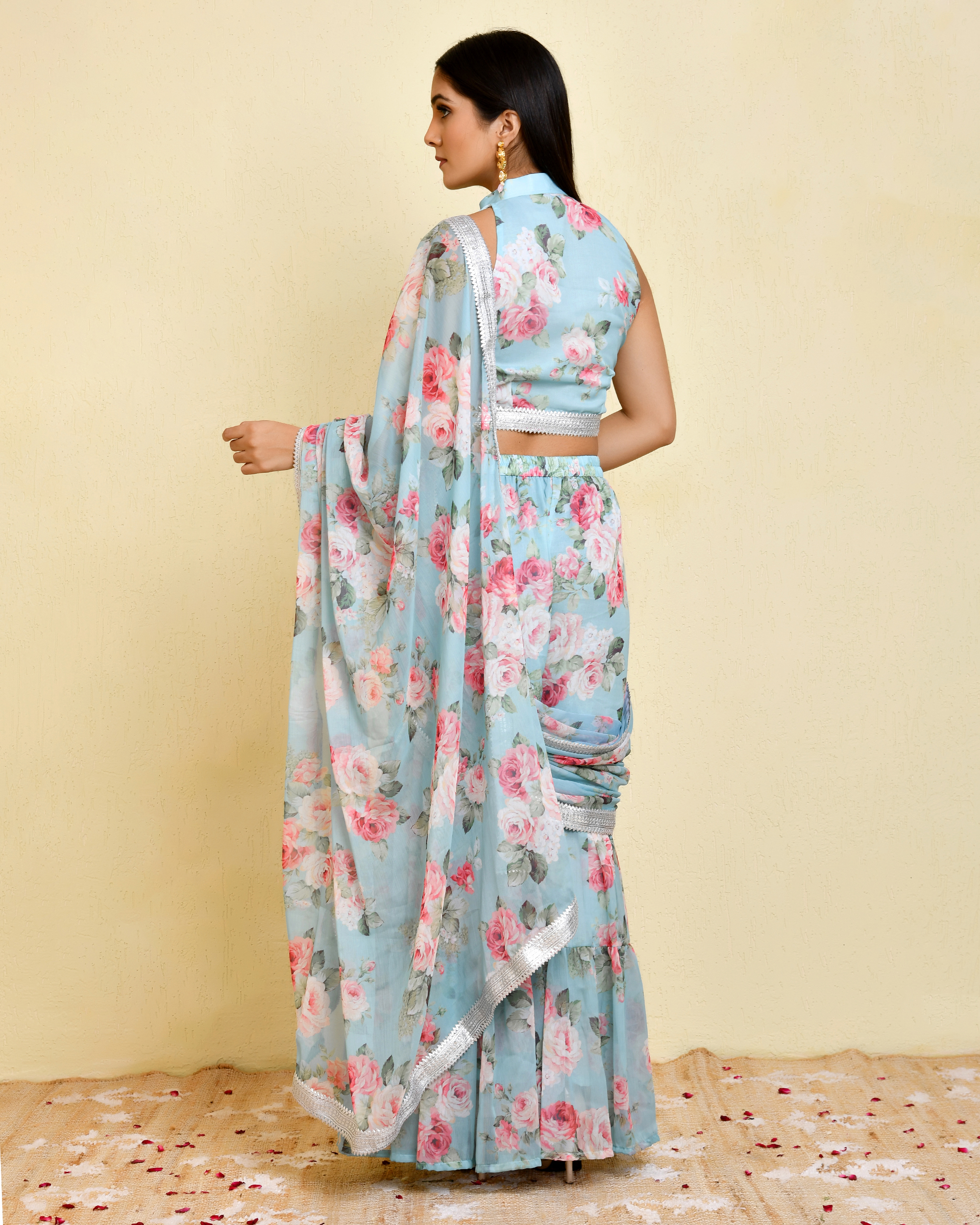 Complement this sharara saree with silver, pearl, or soft gold jewellery to enhance its elegant floral tones. Complete the look with metallic or nude heels for a refined finish.