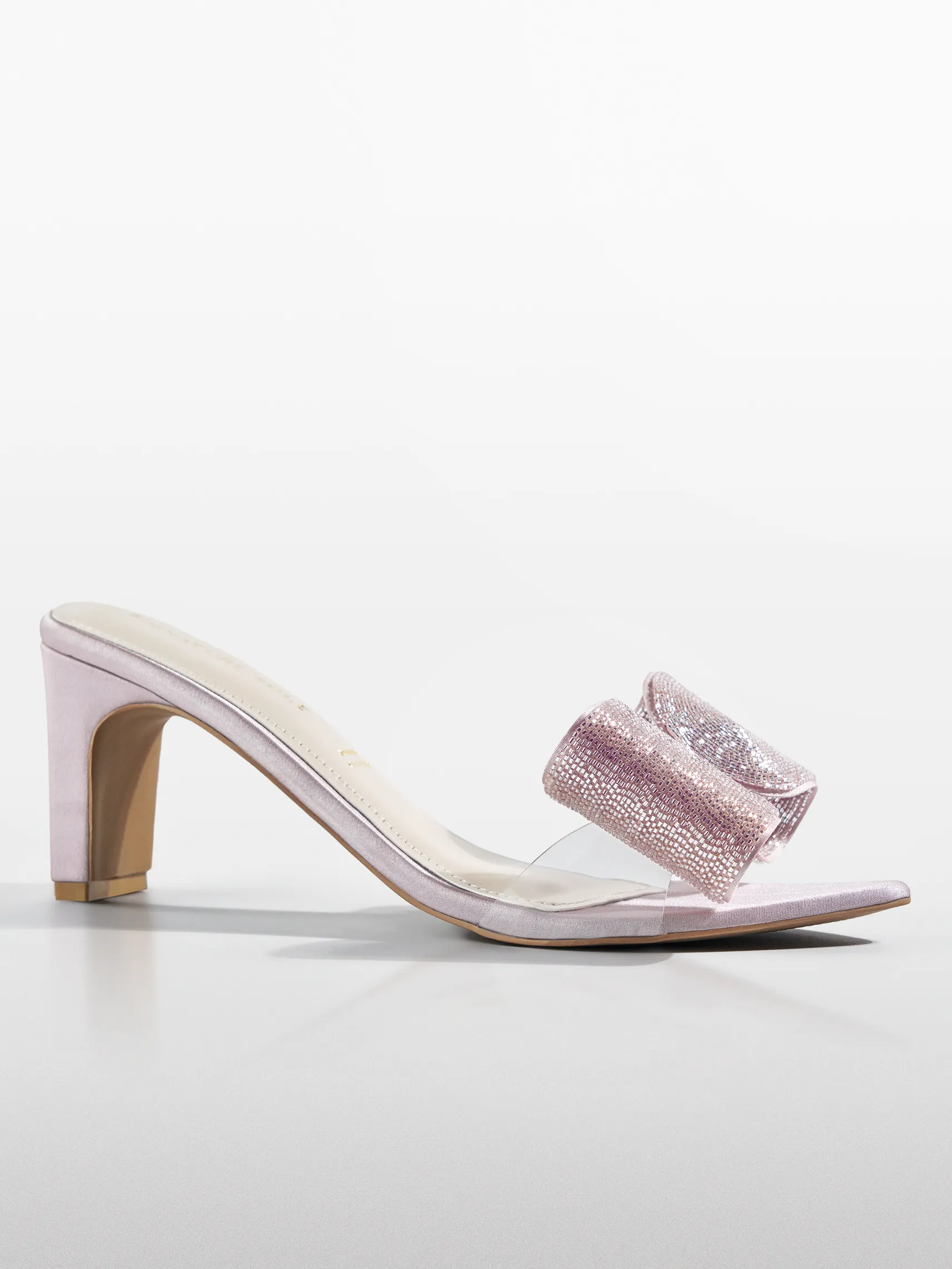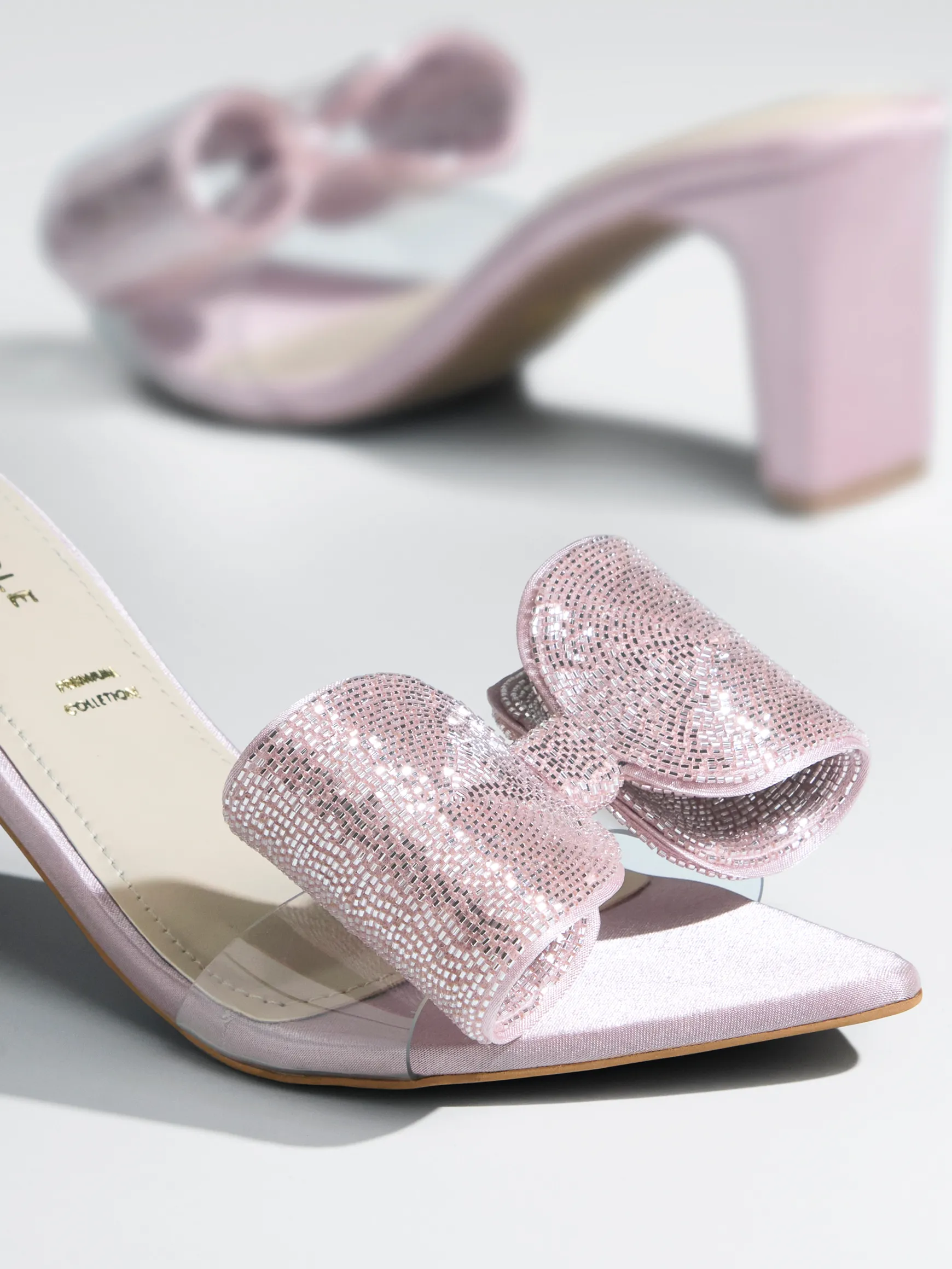 Craft : Oversized 3D bow fully encrusted with blush micro-rhinestones | Clear transparent body | Satin toe | Premium CollectionMaterial : Fabric on faux leatherWork of : 115 Hours