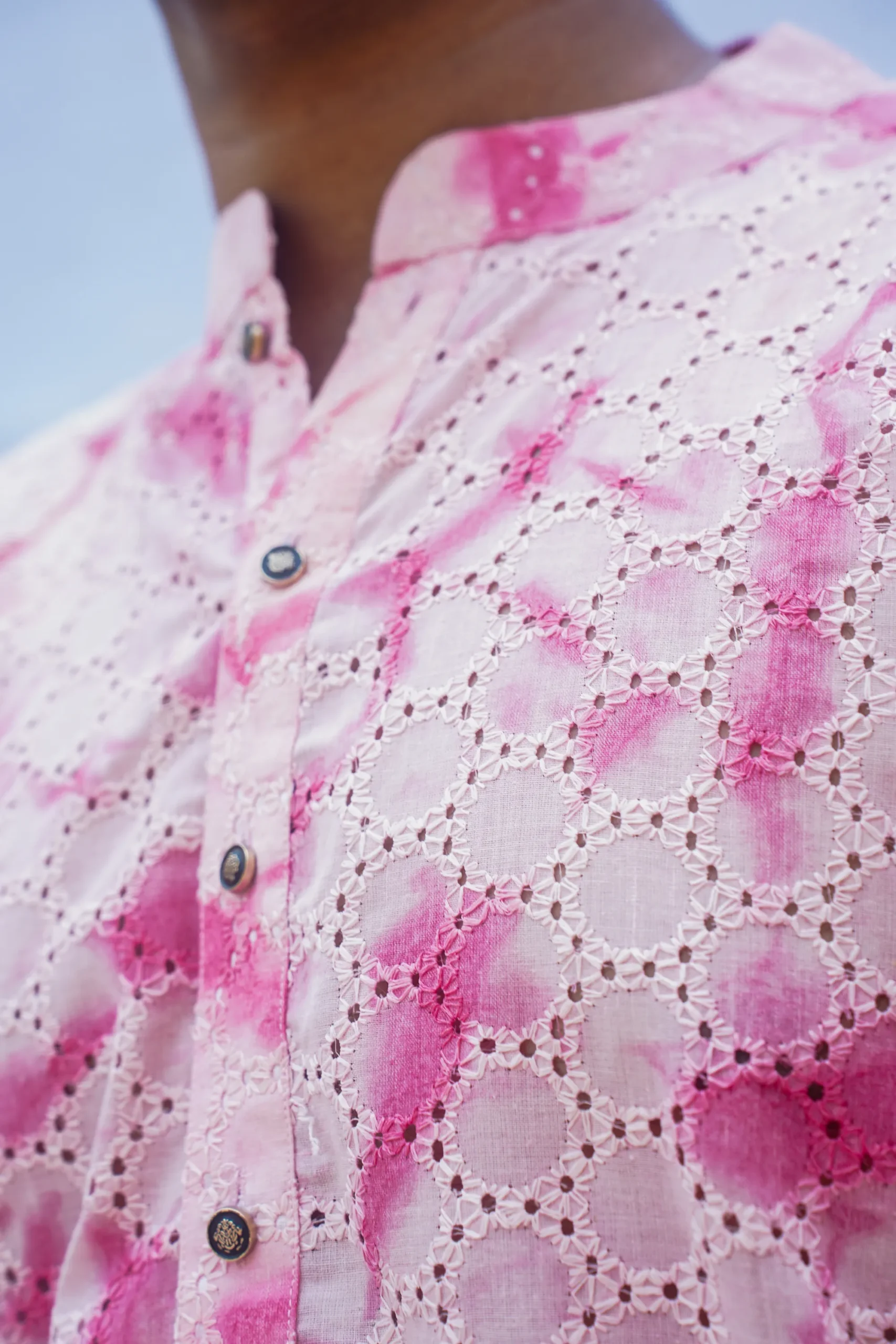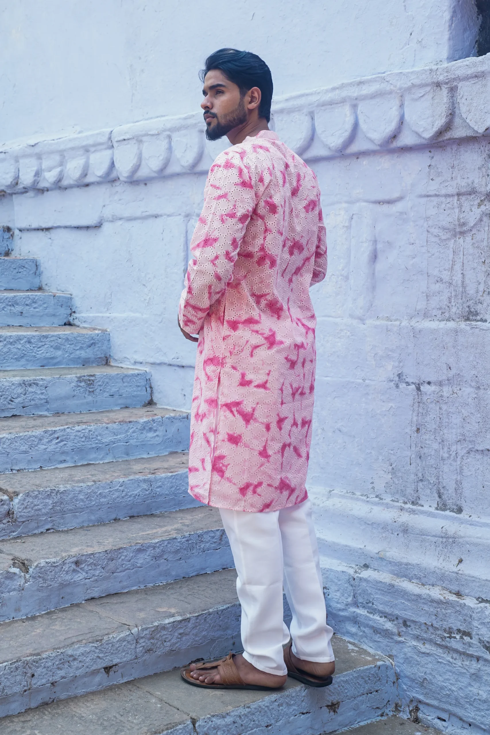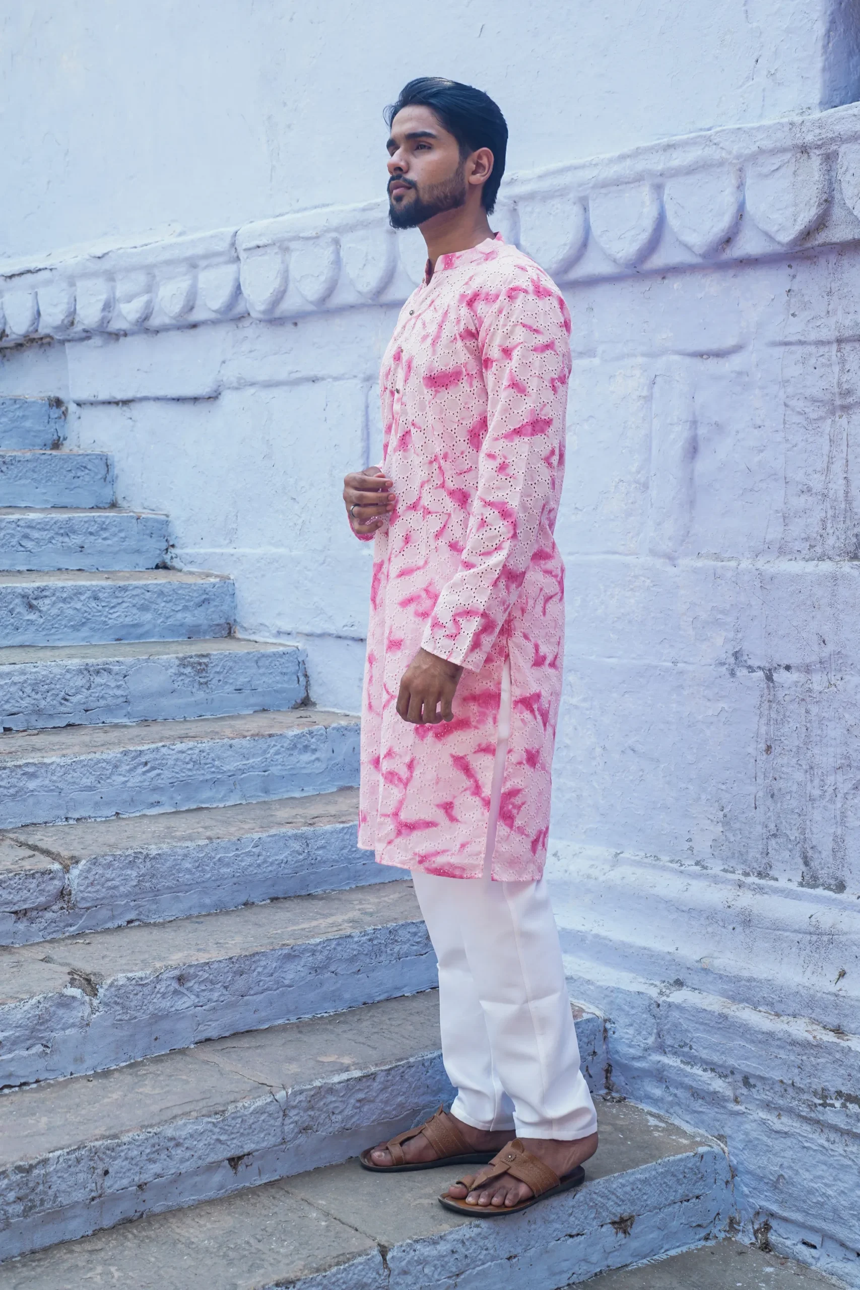Blush Fusion Tie & Dye Schiffli Cotton Kurta with Mandarin Collar & Side Pockets