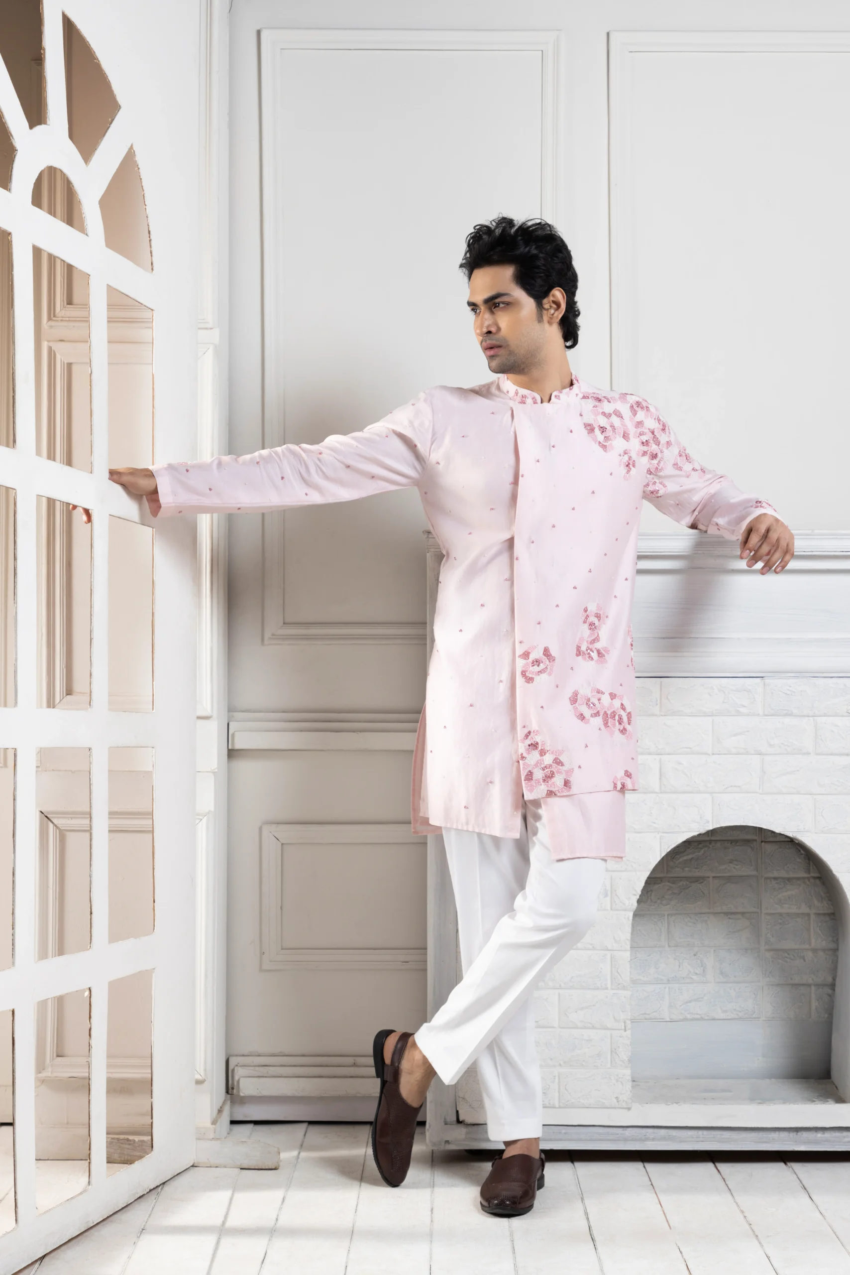 Introducing the blush pink embroidered kurta set, a graceful blend of elegance and delicate craftsmanship. Crafted from chanderi fabric, it features intricate floral embroidery in soft pastel tones with subtle beadwork for a refined shimmer. Paired with malai cotton pants. Designed for comfort and sophistication, this kurta is perfect for daytime celebrations, festive gatherings, and intimate wedding functions.