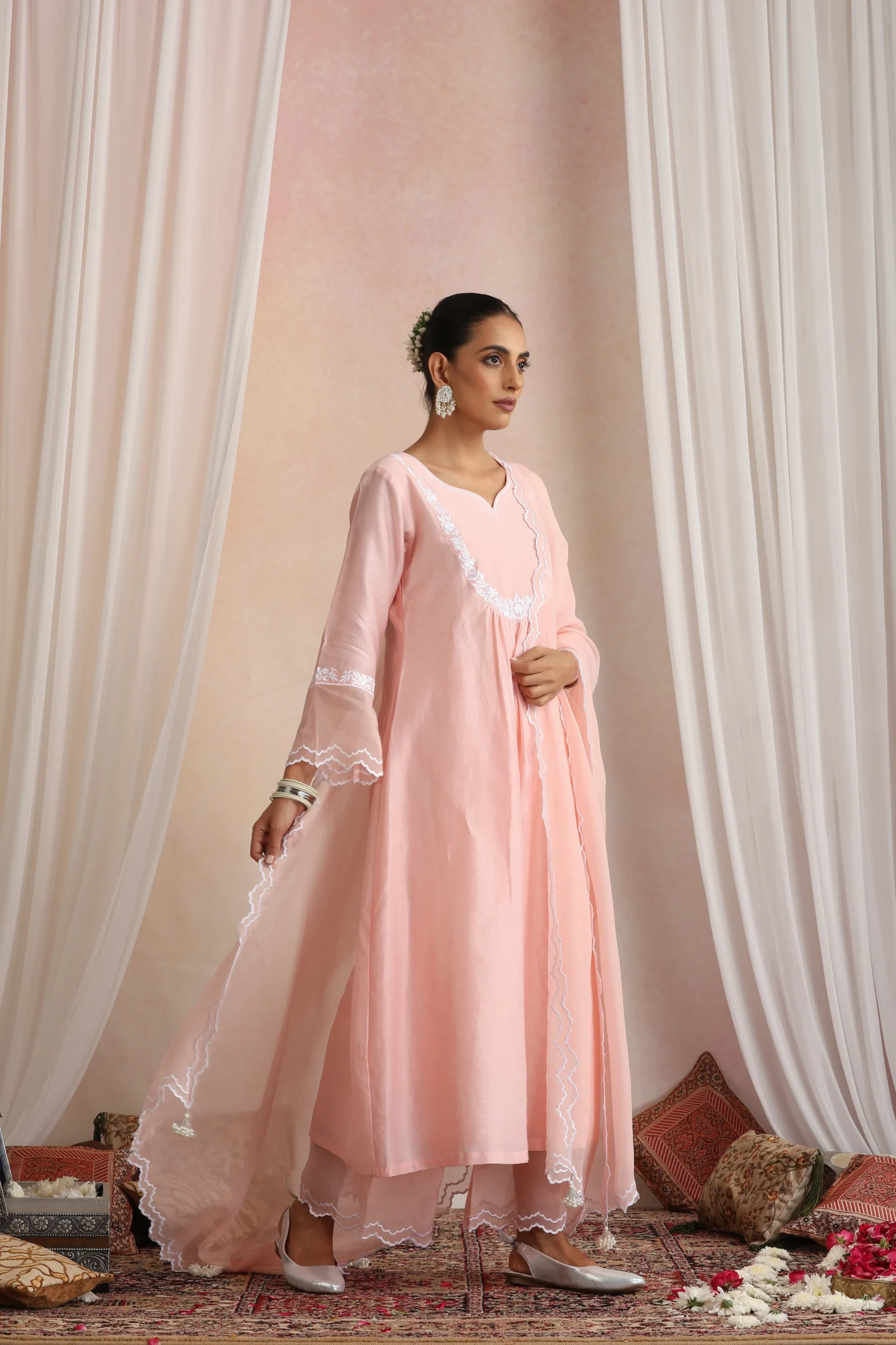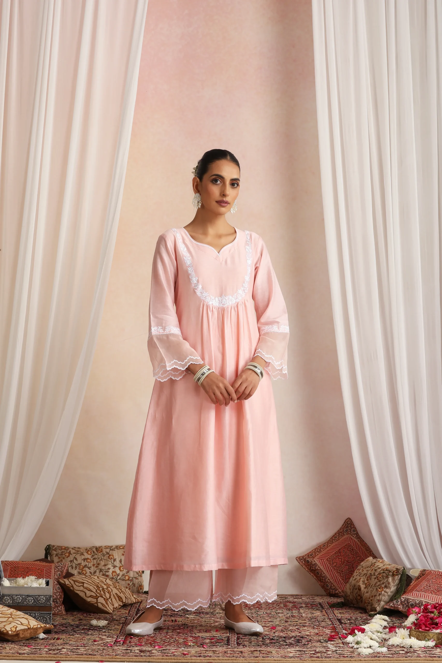 Style this blush pink kurta set with delicate pearl or rose gold jewellery to complement its soft pastel elegance. Pair it with nude, beige, or soft pink heels or traditional juttis for a refined ethnic look