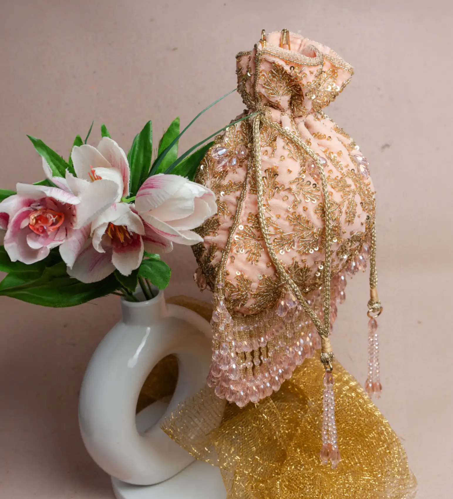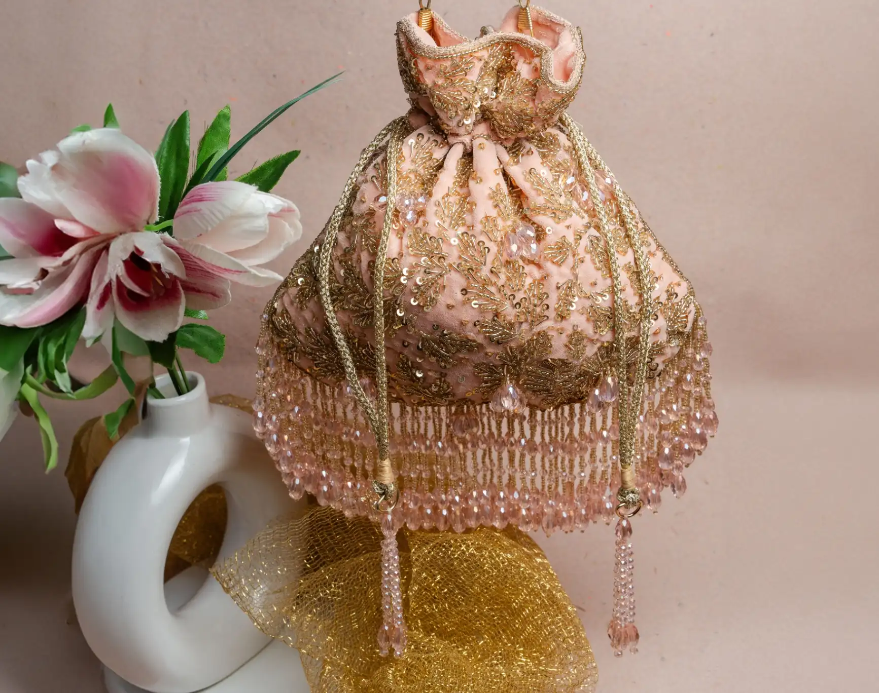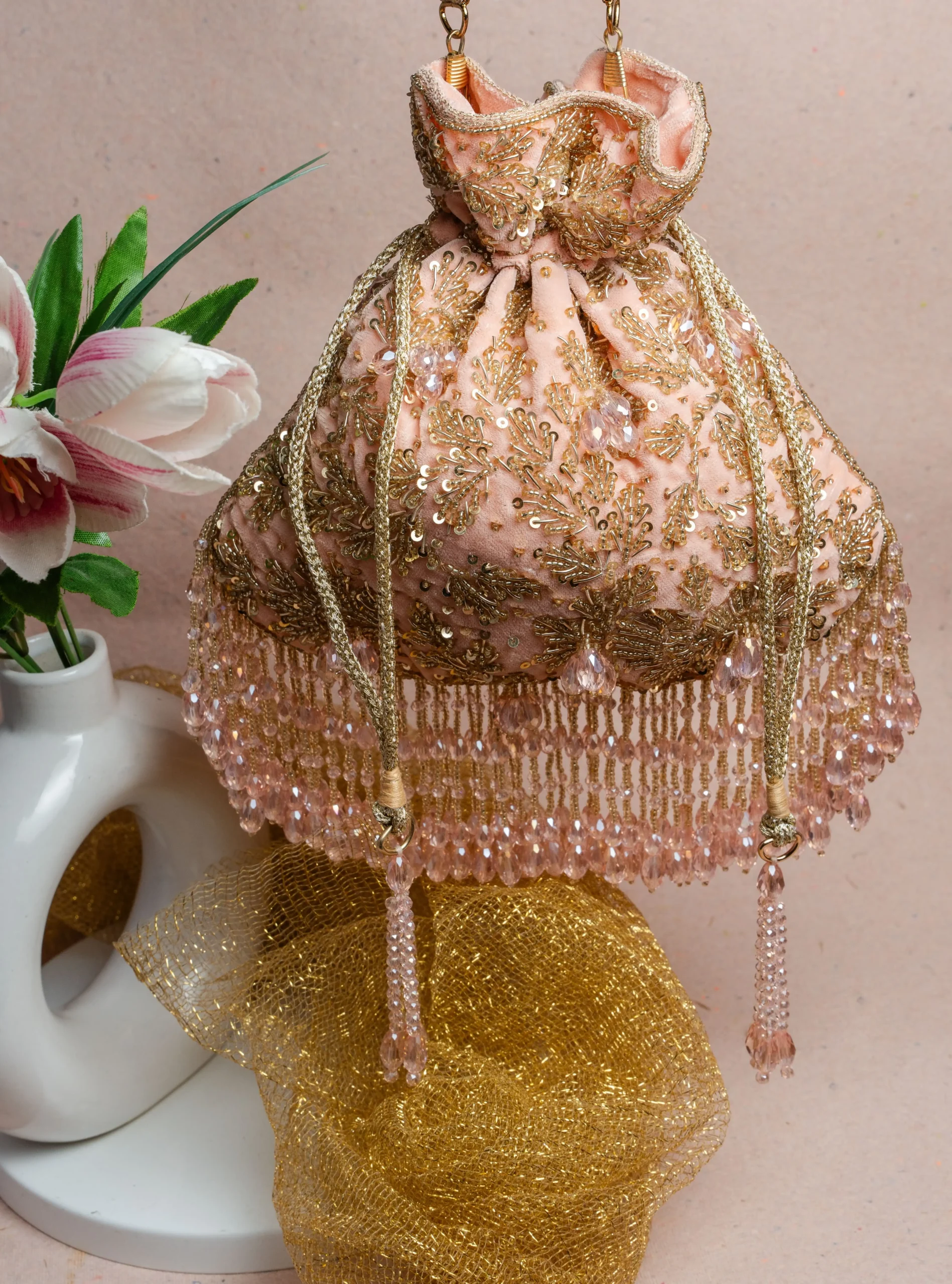 Introducing a beautifully crafted blush pink leaf beaded potli bag that captures soft elegance and intricate craftsmanship. Designed on a delicate pink base, it features leaf-inspired beadwork in warm gold tones, enhanced with subtle sequins and crystal accents that create a gentle shimmer. The layered crystal fringes add graceful movement and refined charm to the design. Perfect for weddings, festive celebrations, and special occasions, this potli pairs effortlessly with pastel and gold ensembles.