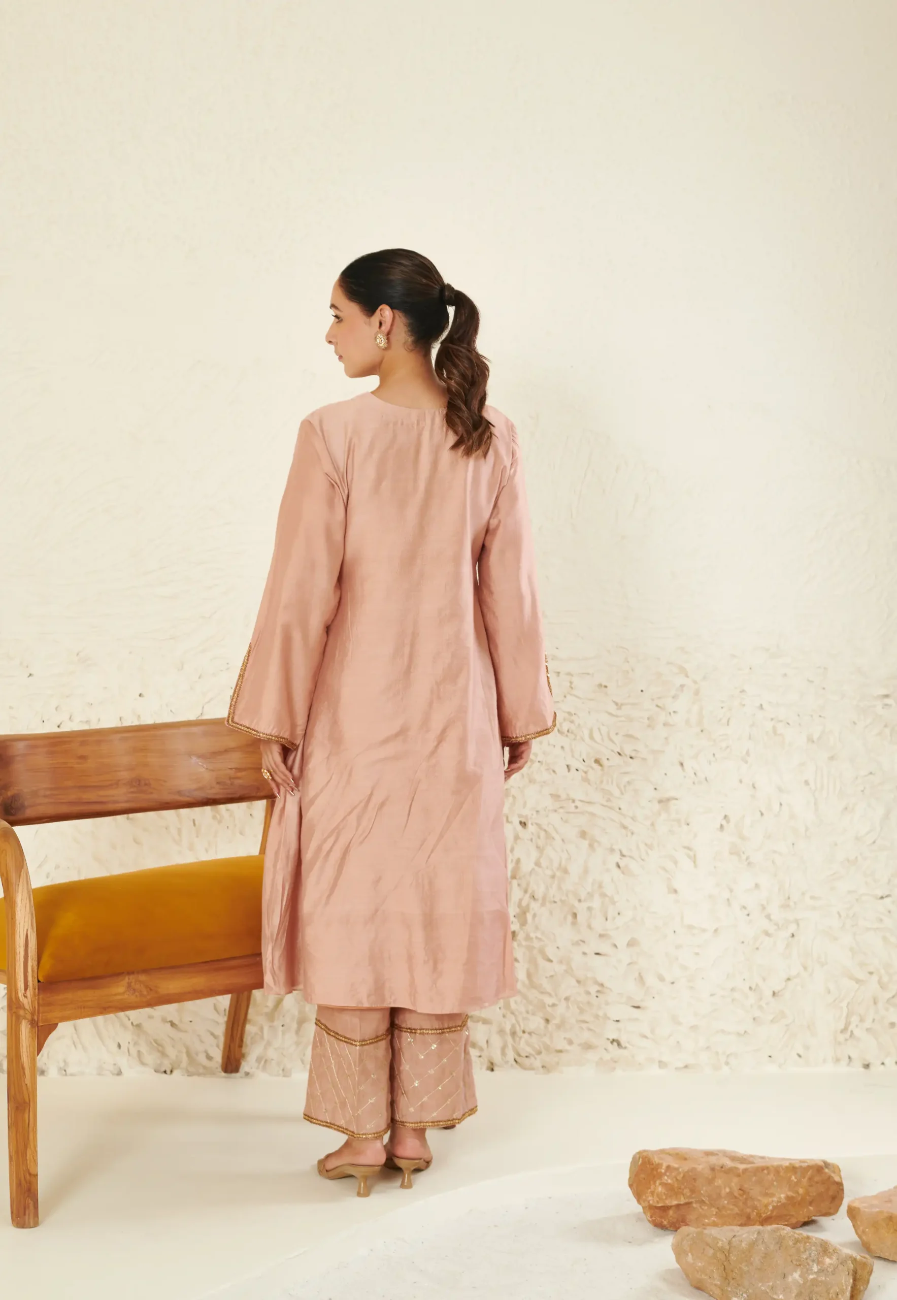 Blush Pink Mukesh Work Chanderi Pleated Kurta with Embroidered Palazzo