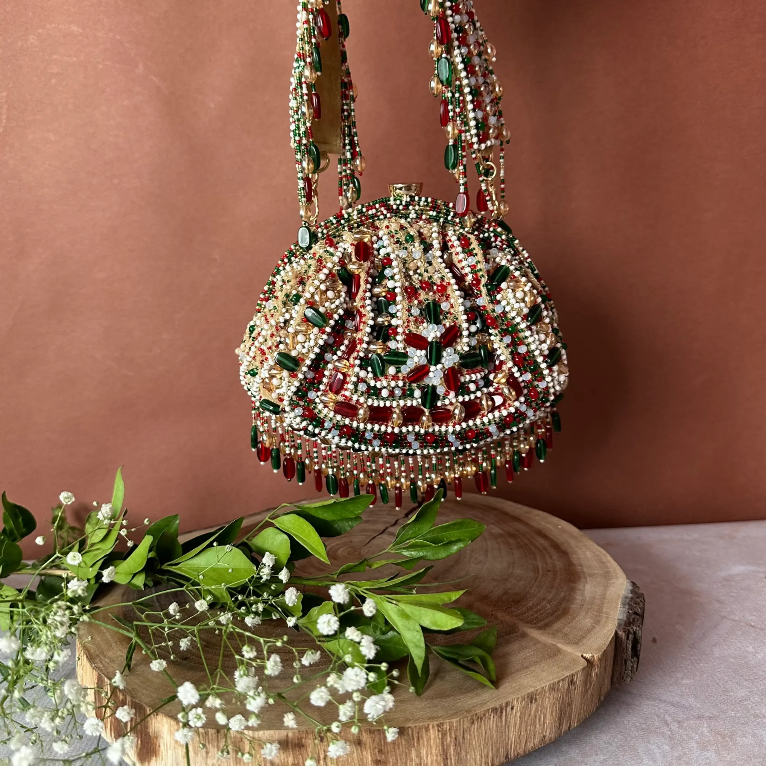 Introducing a chic statement clutch adorned with vibrant bold colour beadwork that instantly captures attention. Designed with a beautifully studded frame and a refined beaded handle finish, this striking accessory blends playful colour with elegant craftsmanship, making it perfect for festive celebrations, weddings, and stylish evening occasions.