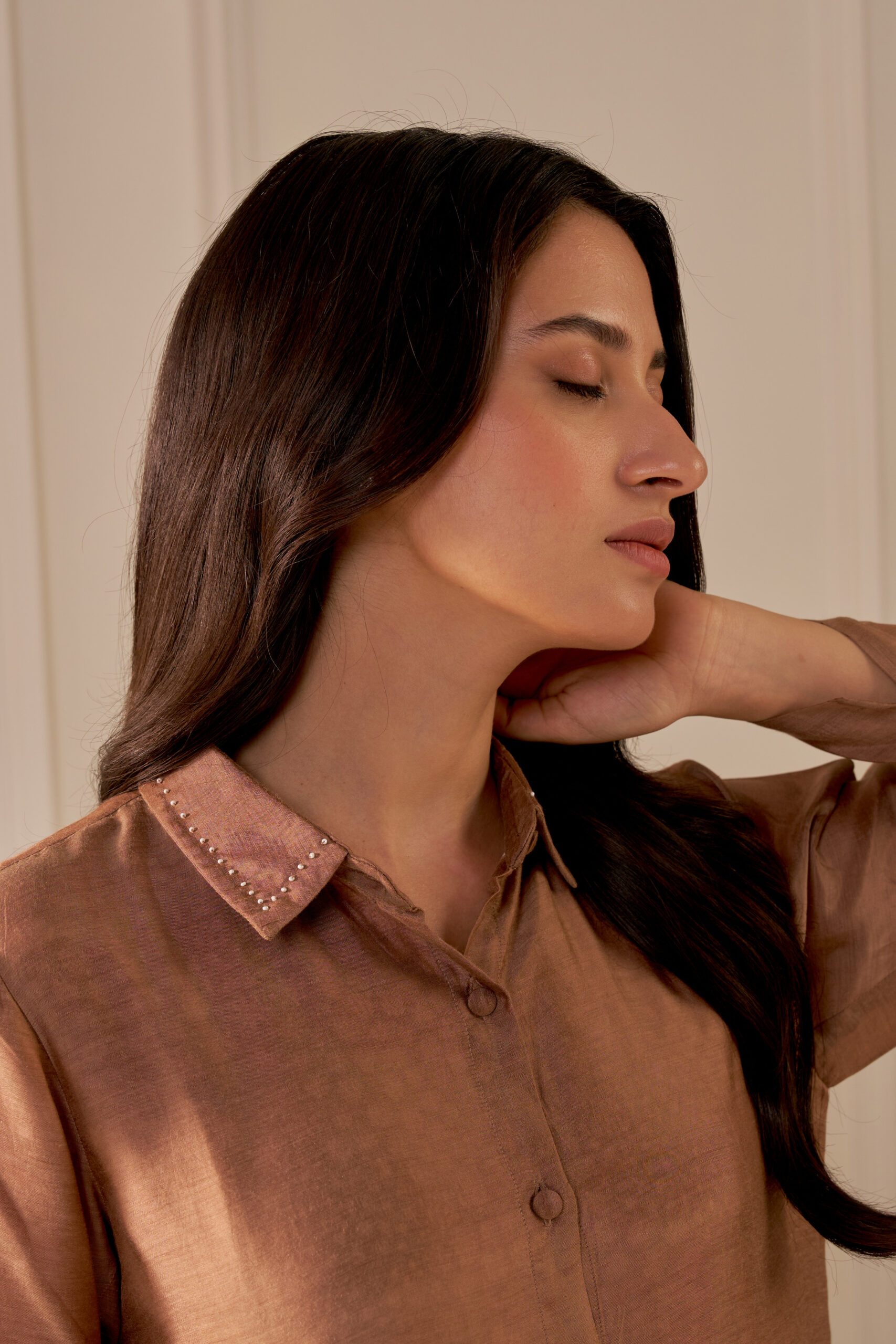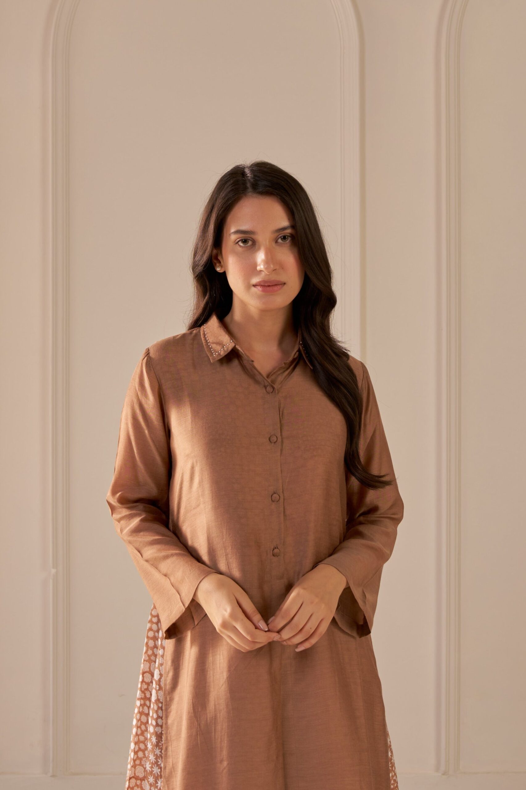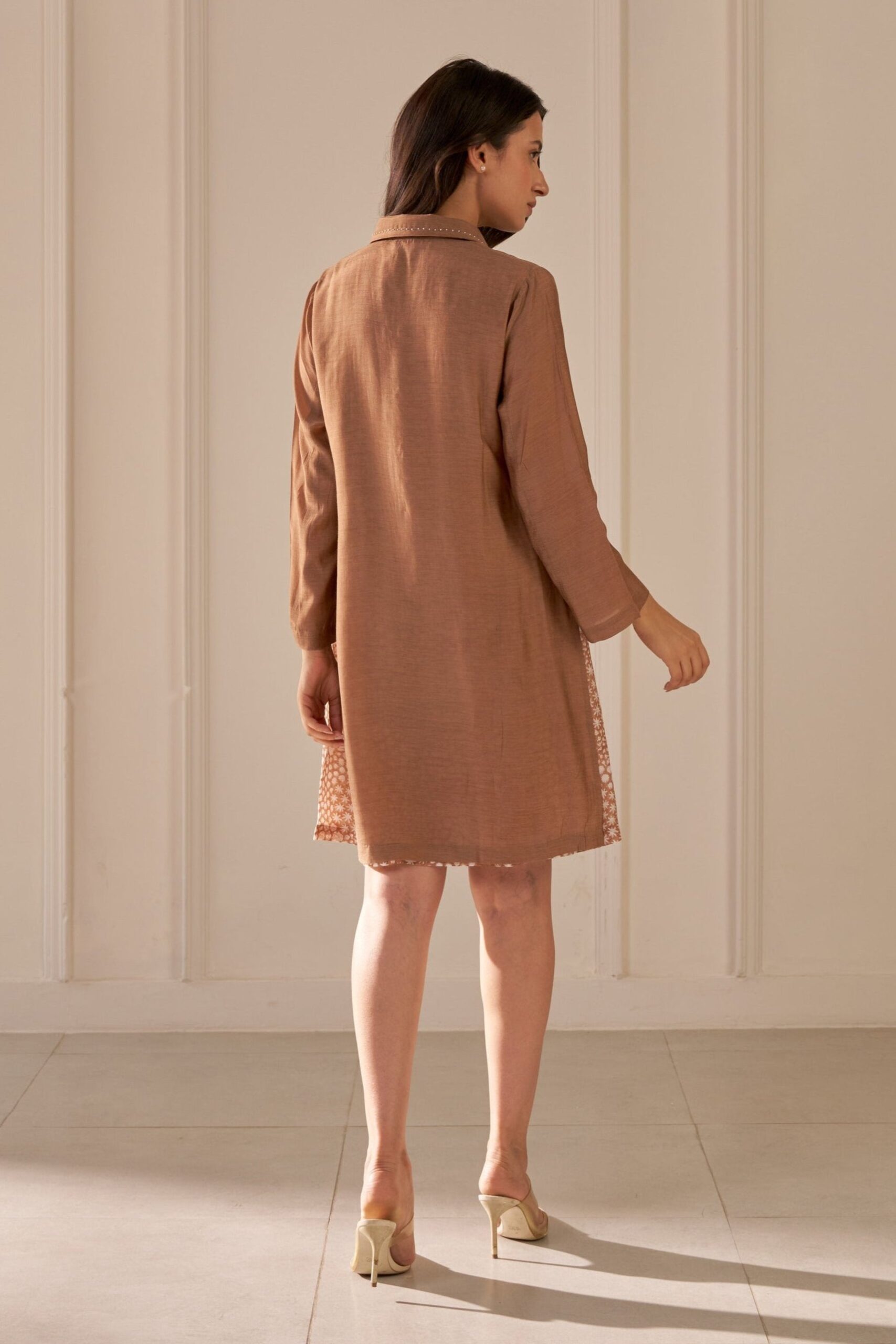 Introducing a stunning brown dress crafted from luxurious muslin silk. This refined piece features a straight fit and a knee-length layered silhouette, perfect for showcasing your style. The classic shirt collar and two-piece sleeves are beautifully accented with beadwork details, elevating its elegance. The inner layer boasts an exquisite block print, adding a subtle touch of charm and sophistication. This dress is a perfect choice for those seeking a blend of grace and contemporary flair.