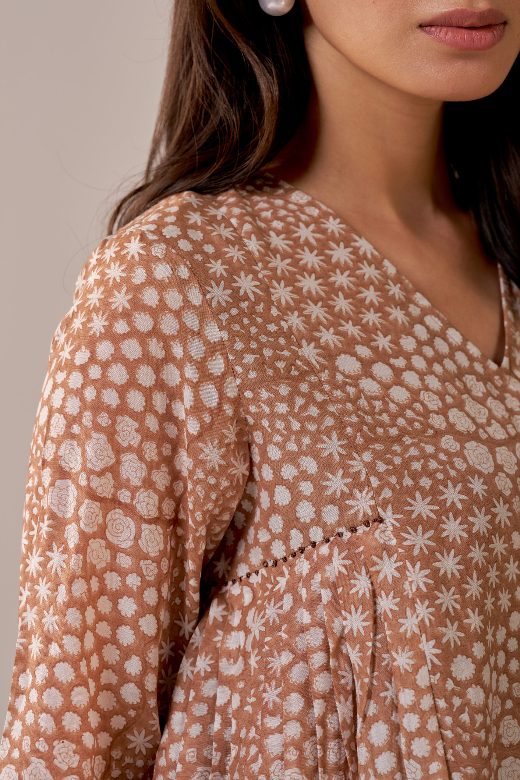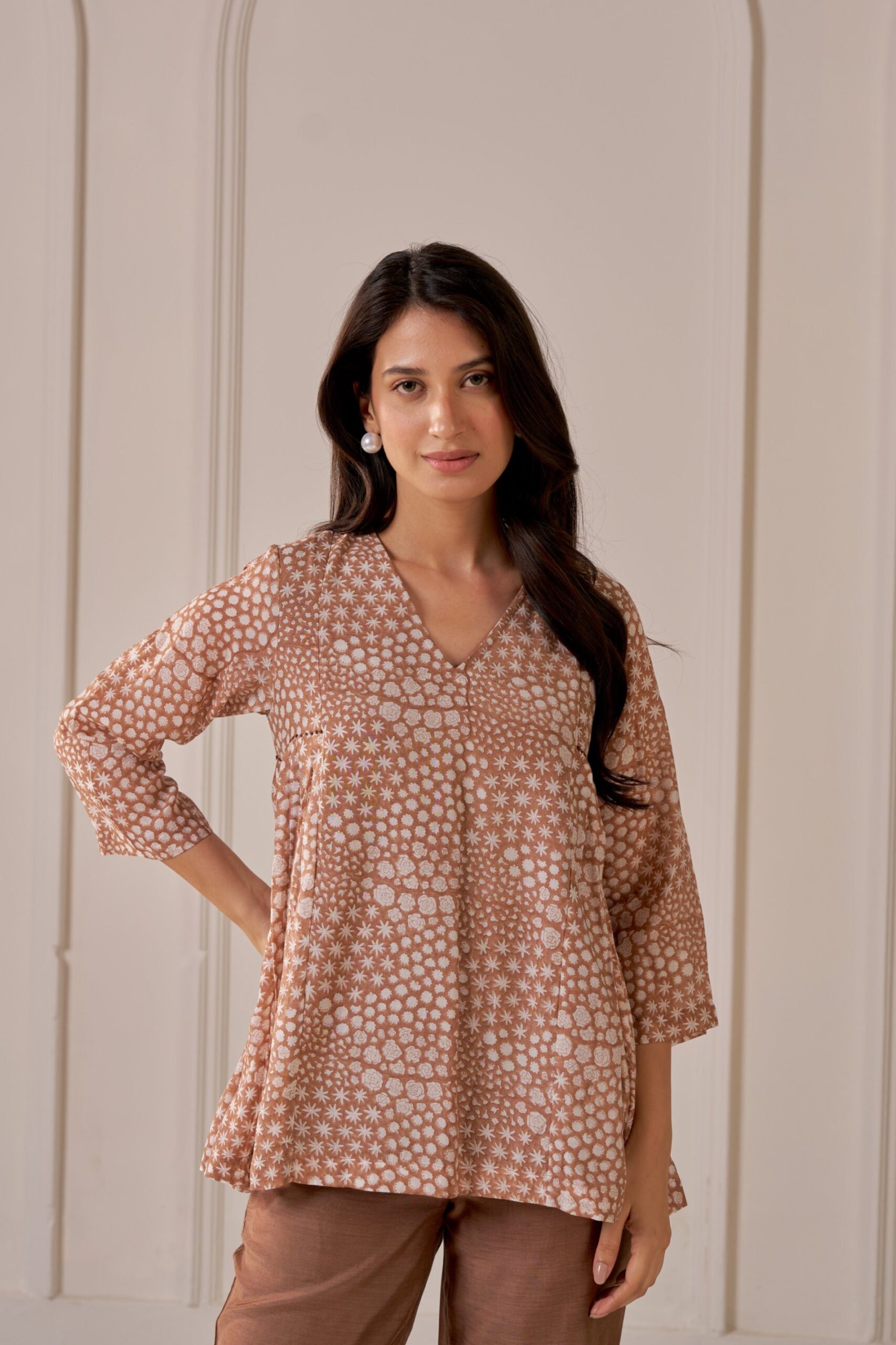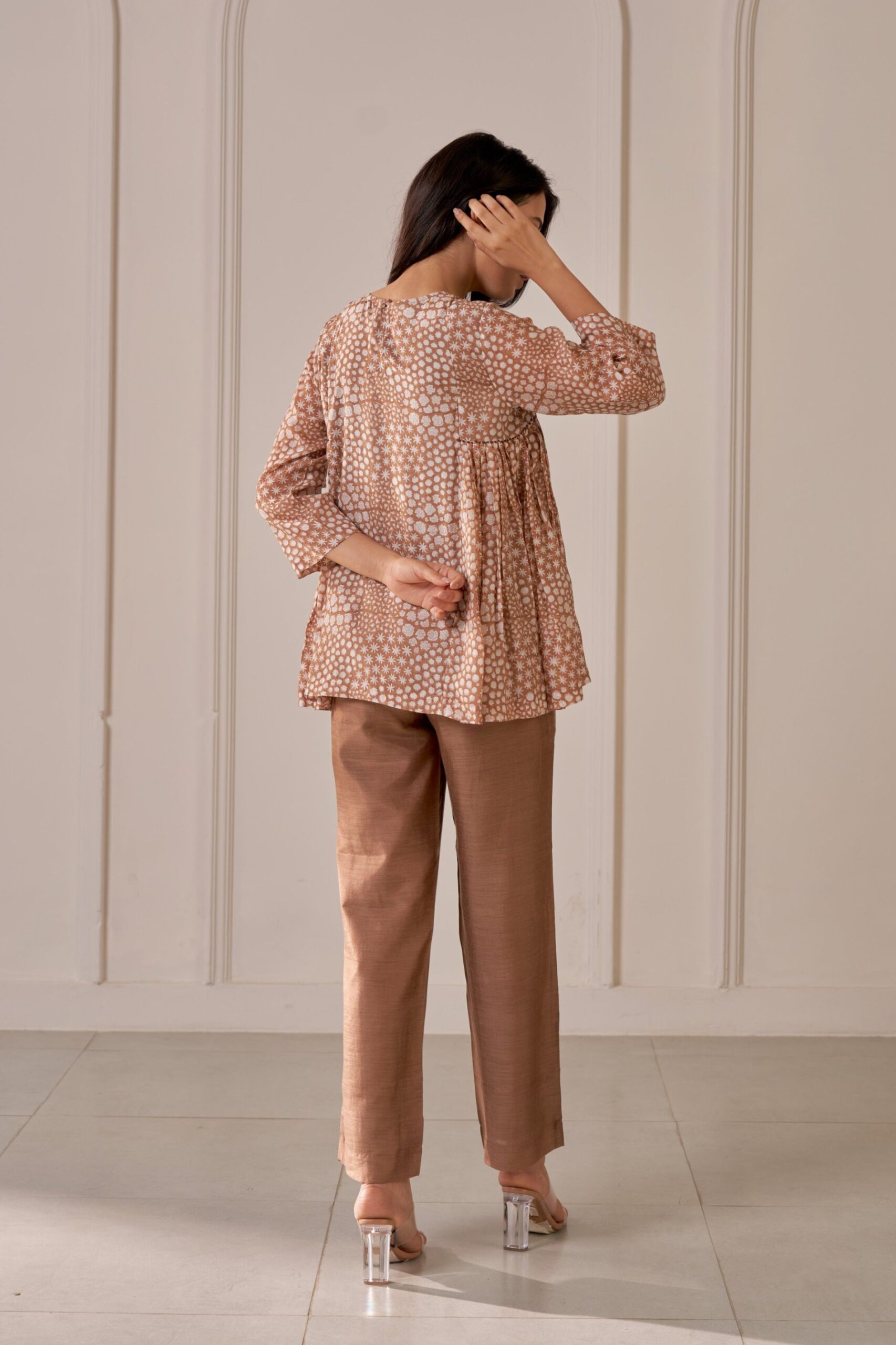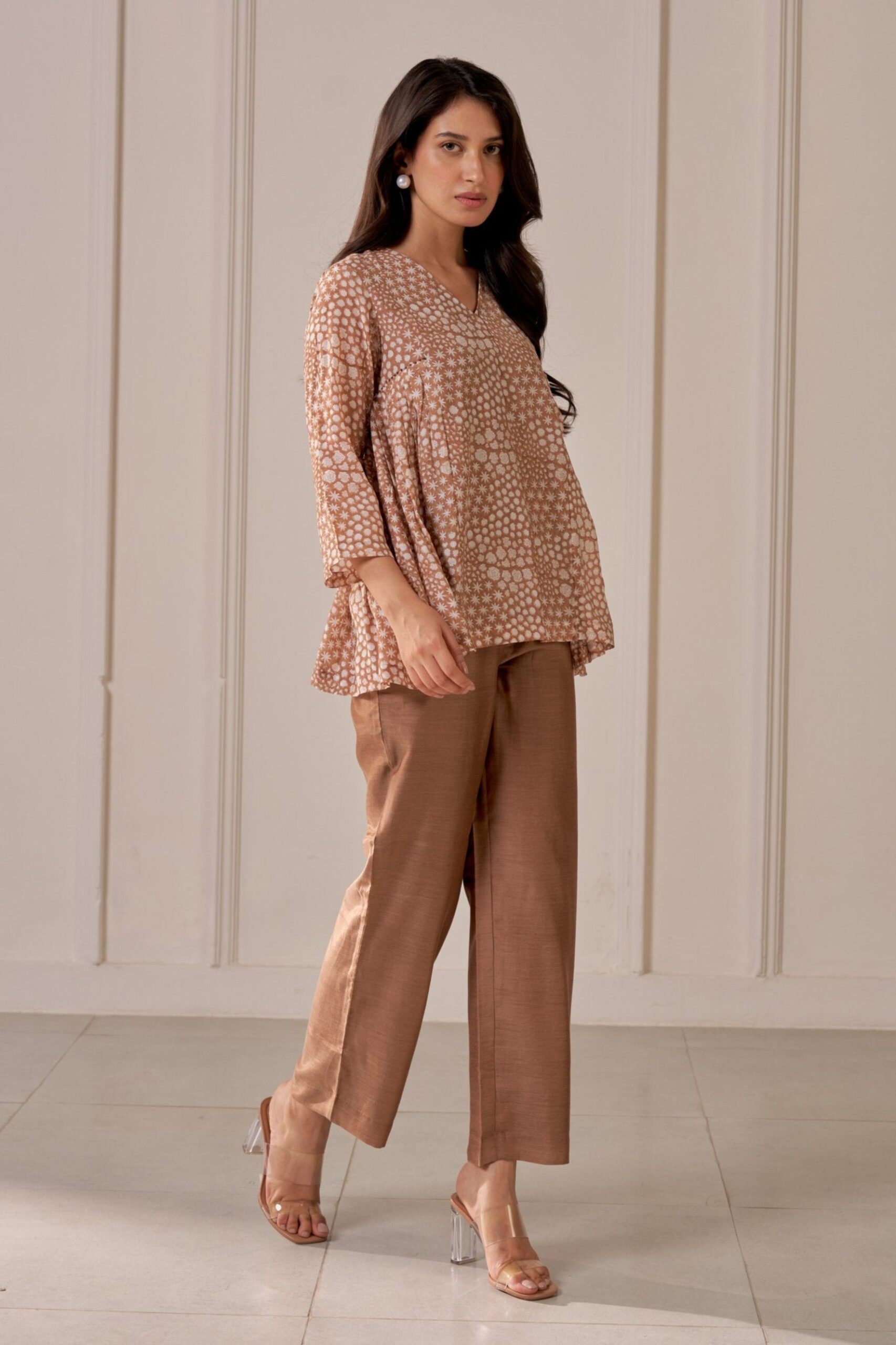 Ruchi Marodia introduces a stunning ensemble featuring a brown pleated V-neck top and matching straight-leg trousers. The top showcases a polished look crafted from luxurious muslin silk, providing both elegance and comfort. Accentuating a flattering V-neck design, pleat details on the side panels and the romantic floral block print adds a charming touch. Paired with matching the straight-leg trousers, designed for a sleek and tailored silhouette, this combination transitions seamlessly from the office to after-hours events.