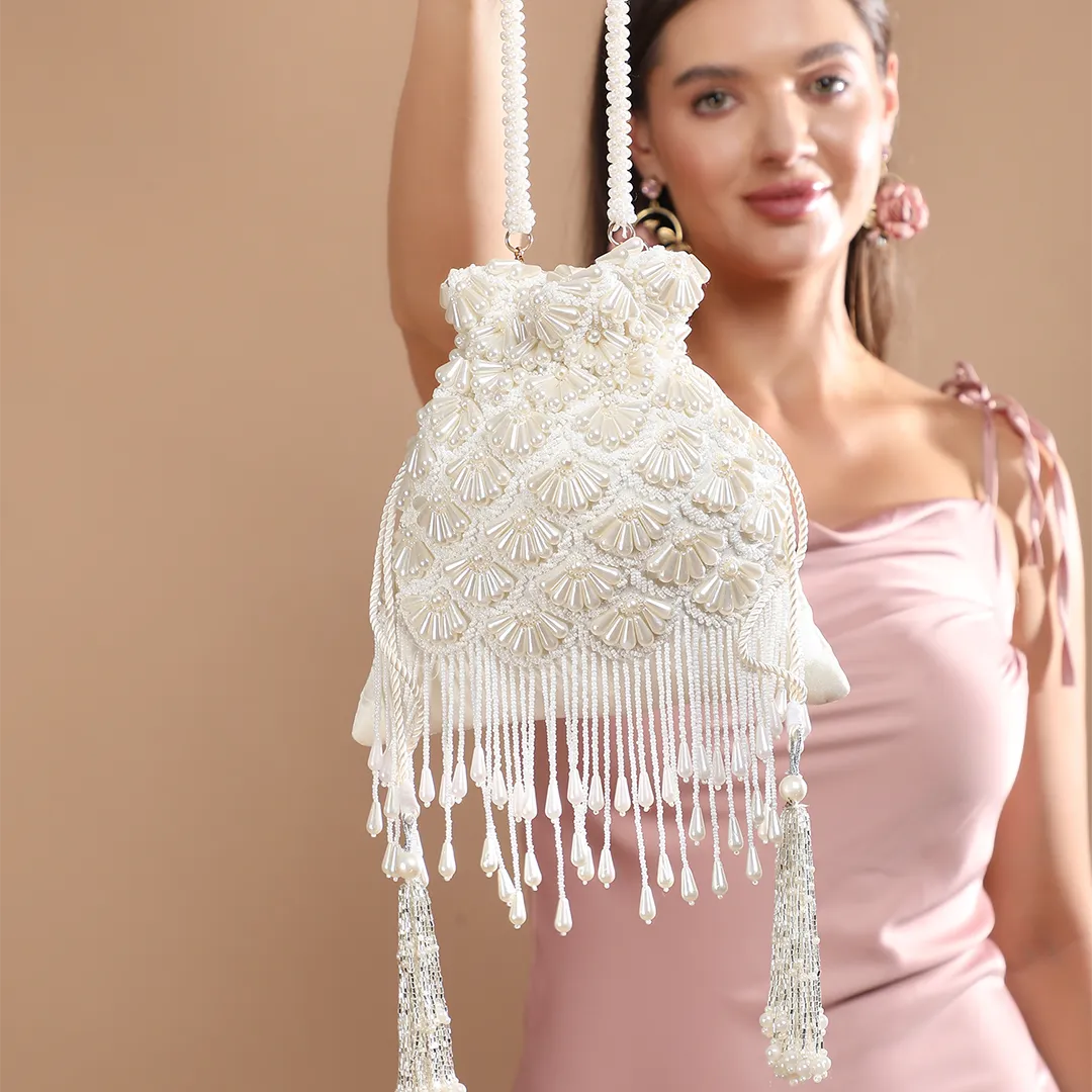 Crafted in elegant white silk, the Chahat Pearl Potli features intricate hand embroidery adorned with delicate pearl embellishments. Finished with long tassels, woven drawstrings, and subtle beaded detailing, this graceful accessory adds refined charm to festive, wedding, and traditional ensembles.