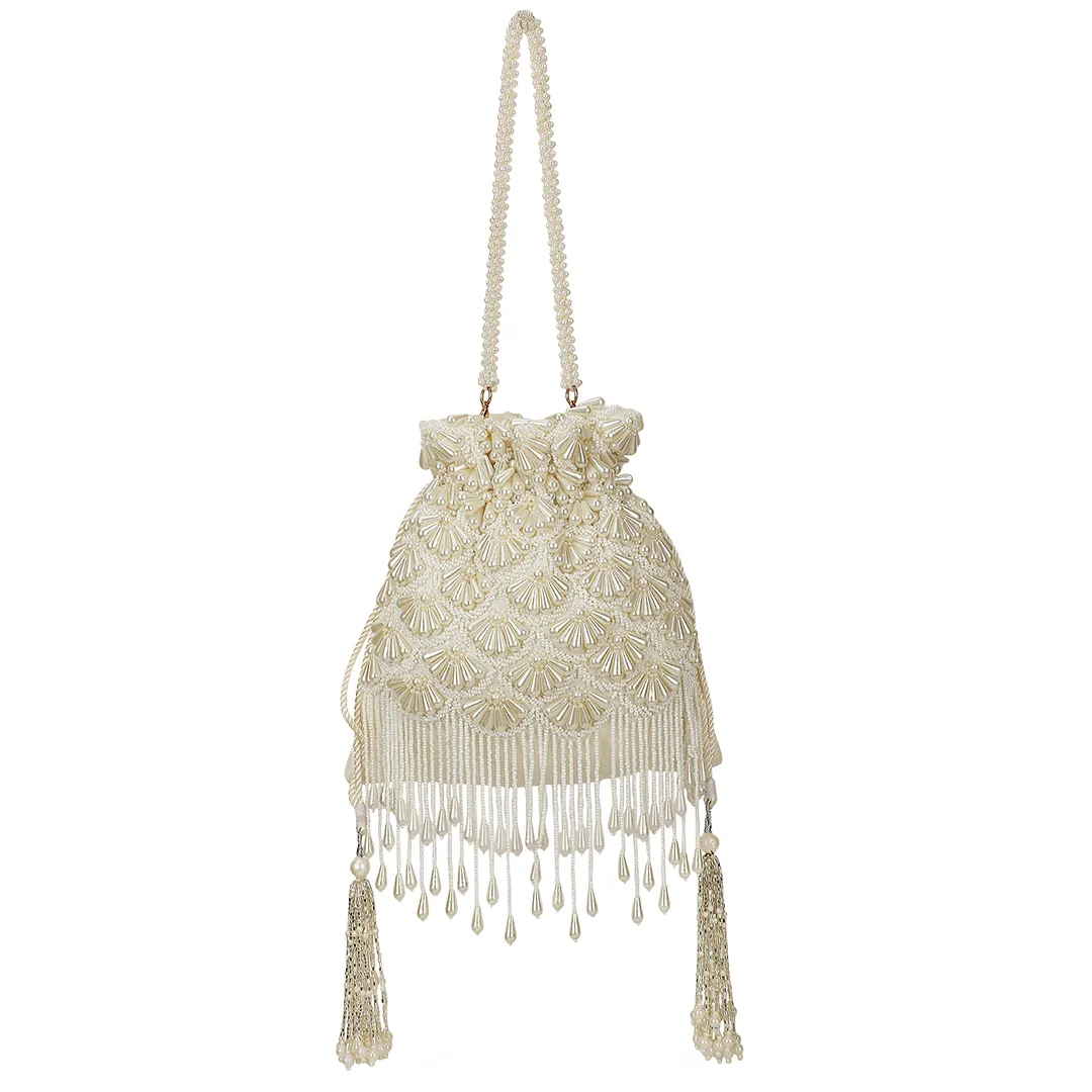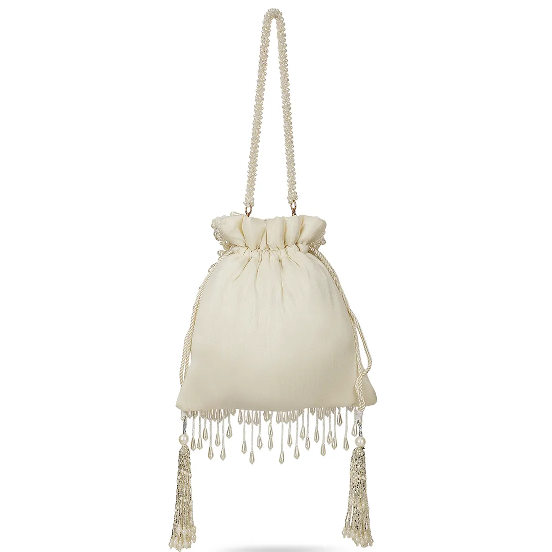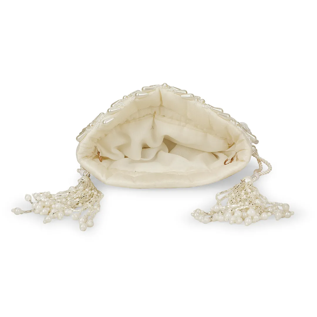 Chahat Hand-Embroidered Pearl Silk Potli Bag – White