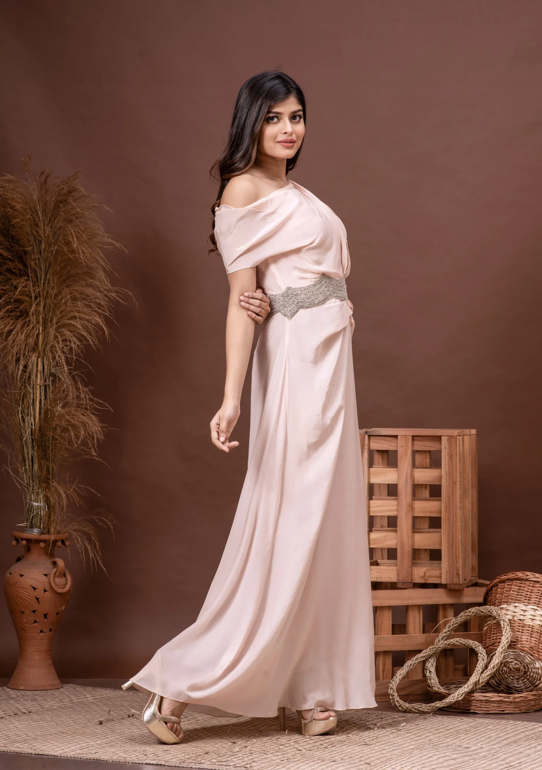 Champagne Pink Drop Shoulder Habutai Silk Hand Embroidered Gown