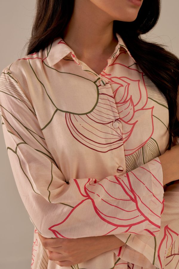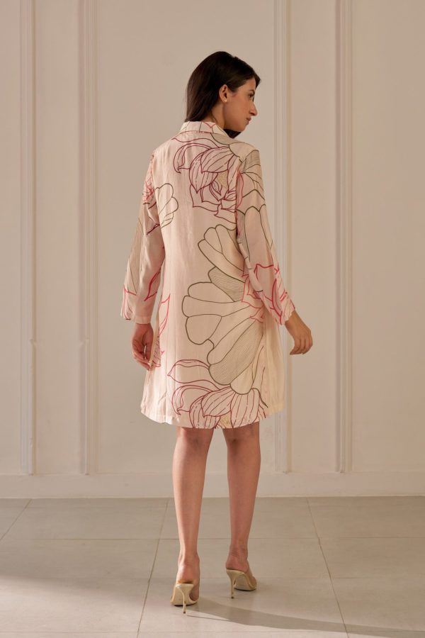 Indulge in the elegance of our champagne dress. With a straight fit and layered knee-length design, it features a classic shirt collar, two-piece sleeves, and a button placket. Made from printed crepe cotton, it offers a blend of sophistication and comfort.