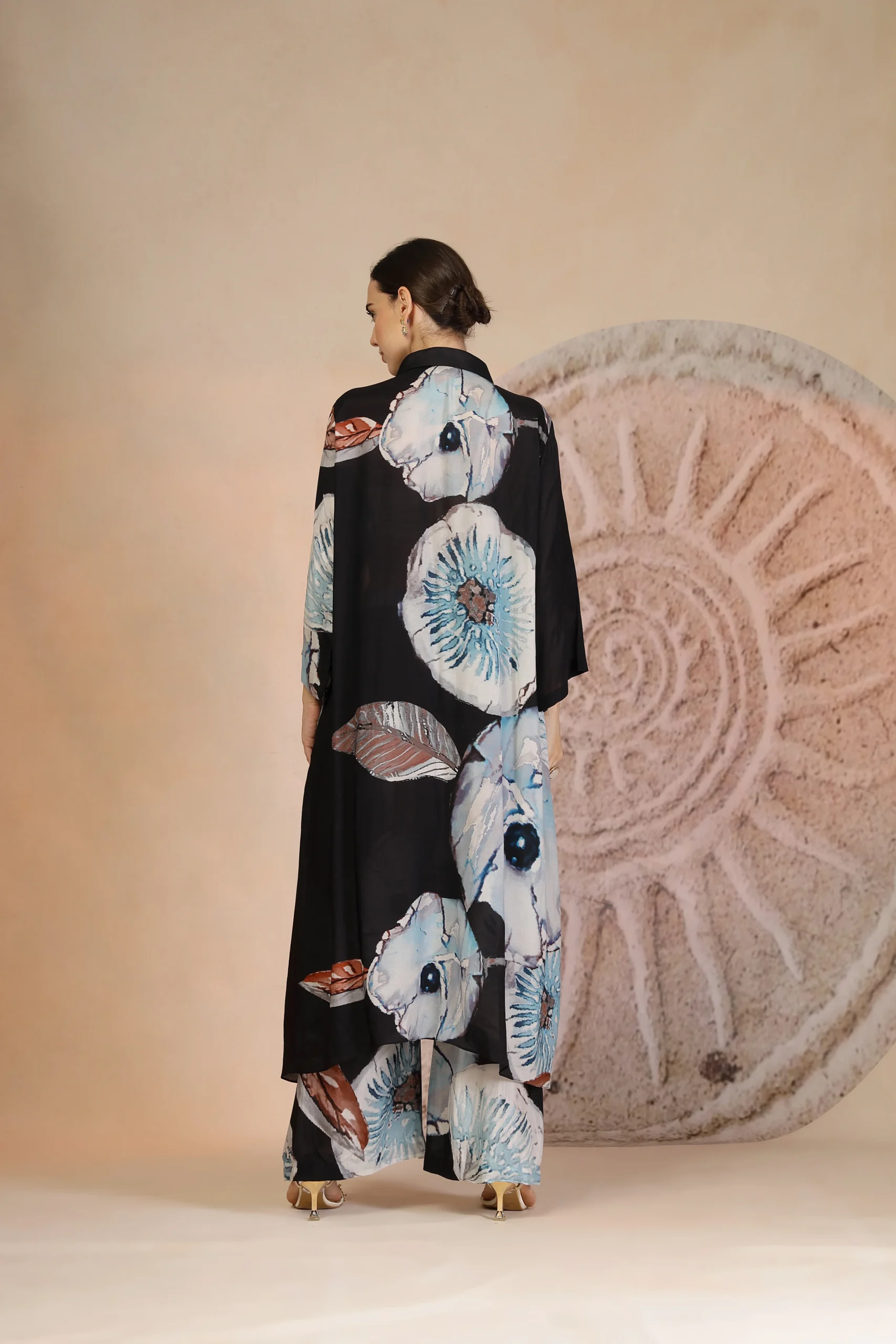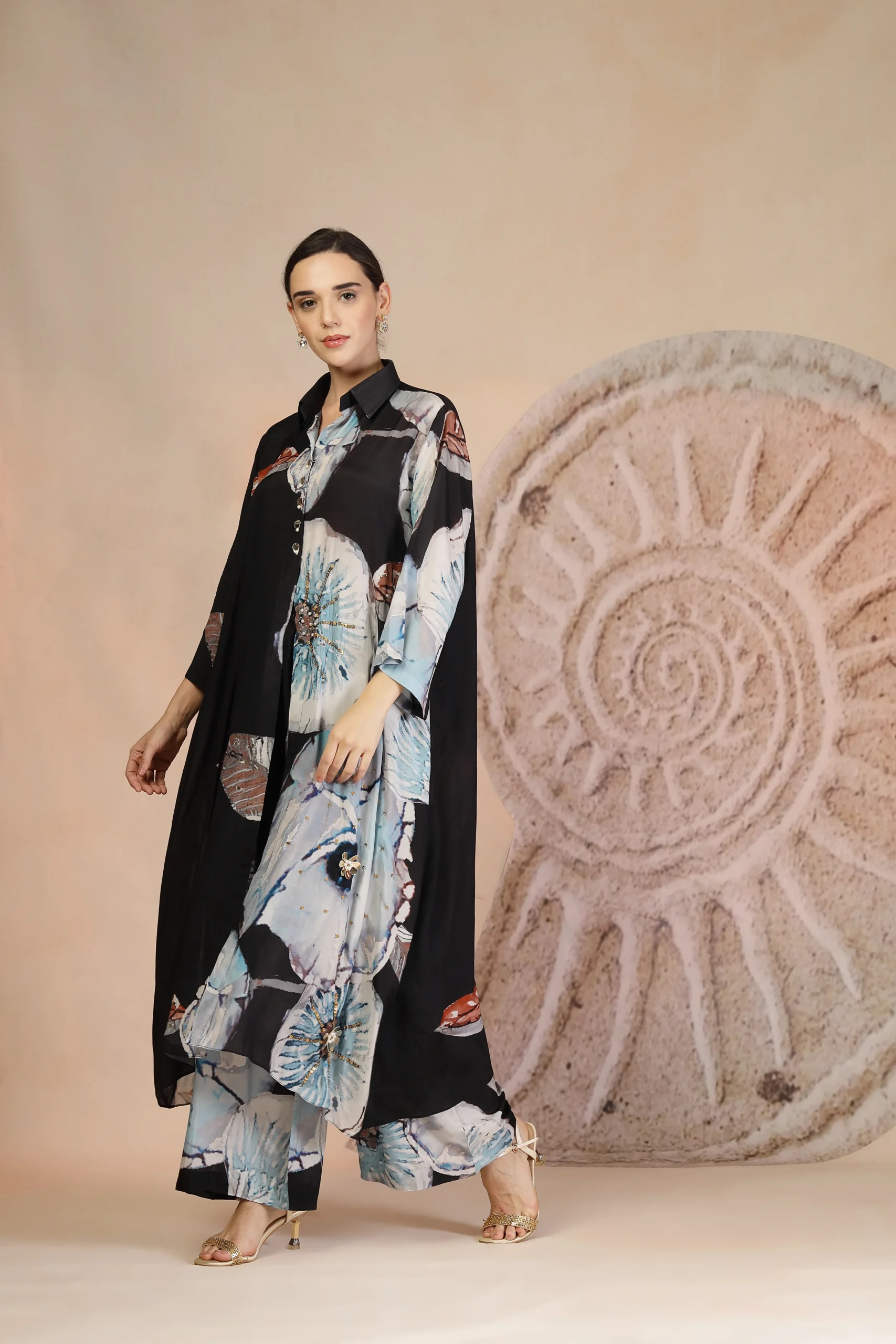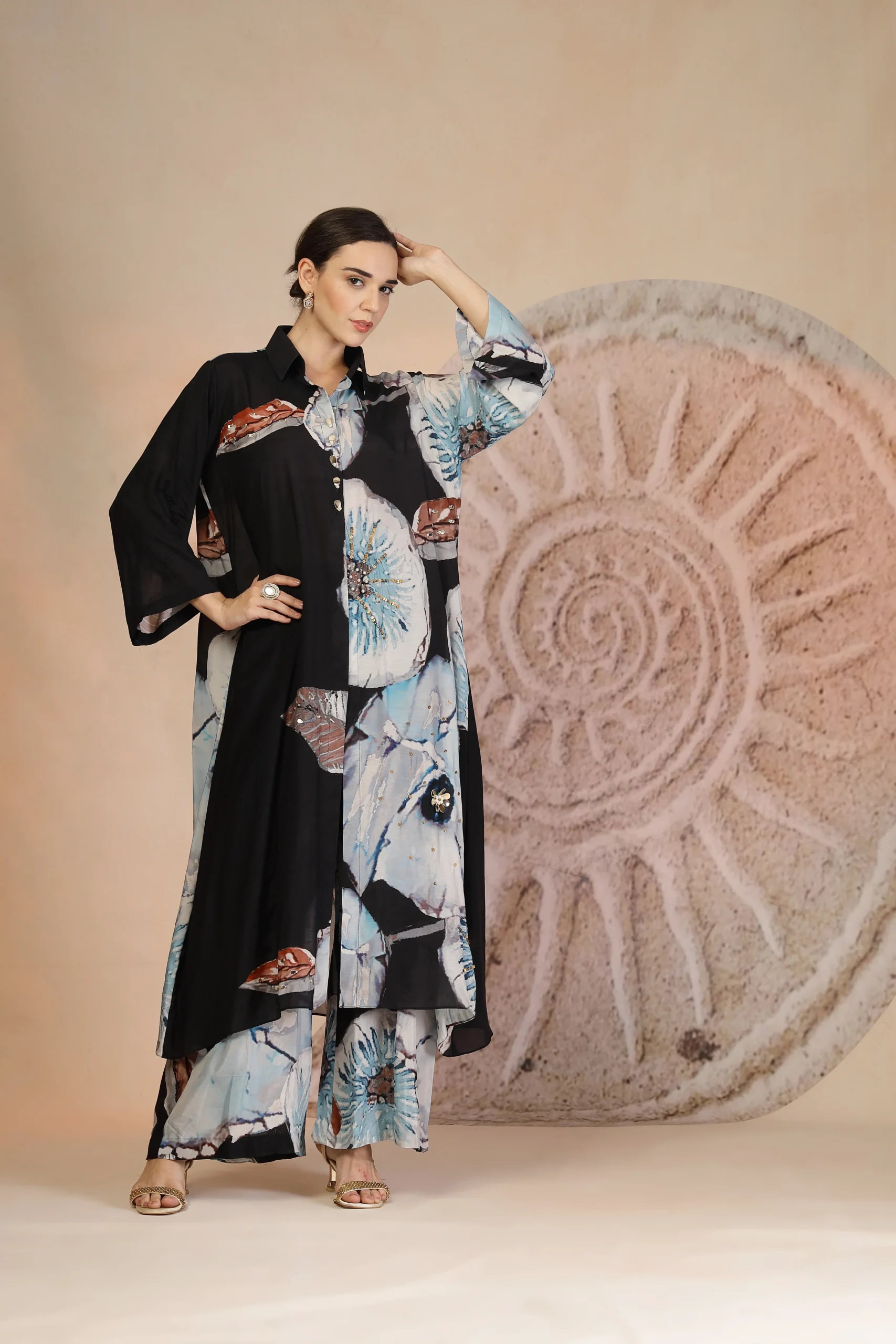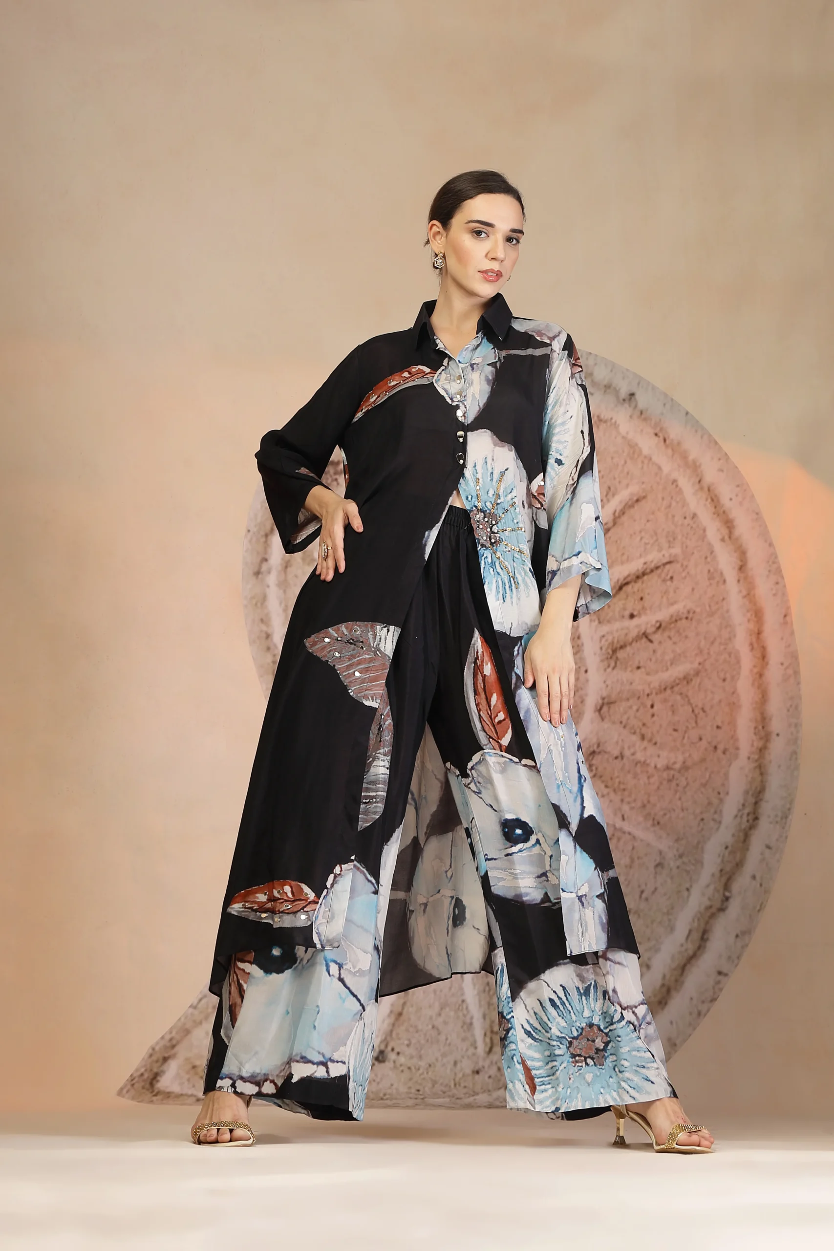 Introducing a refined charcoal black kurta set crafted in airy muslin silk for effortless summer elegance. Designed with a striking coral print, the kurta makes a bold yet sophisticated statement. Paired with relaxed palazzo pants and elevated with delicate beadwork embroidery that adds a subtle shimmer, this easy-breezy ensemble blends comfort with contemporary charm and perfect for warm-weather daywear and modern festive occasions.