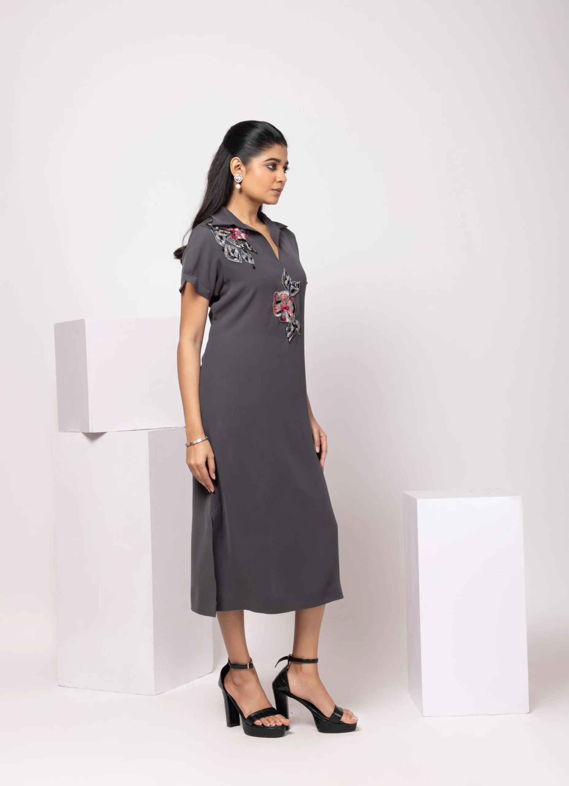 Style this charcoal grey midi polo dress with elegant heels or pointed flats for a polished look, or pair it with minimal sneakers for effortless daytime style. Complement the outfit with subtle jewelry and a sleek handbag to highlight the floral embellishments and modern silhouette for both casual and semi-formal occasions.