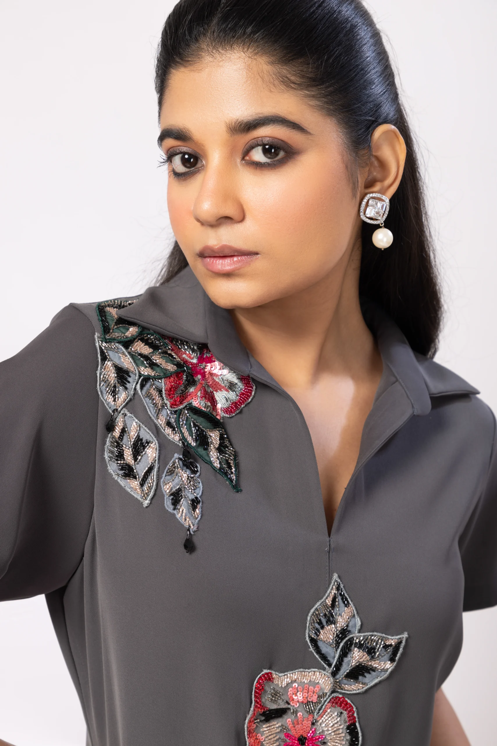 Introducing the Charcoal Grey Floral Embellished Midi Polo Dress, a chic blend of contemporary elegance and modern flair. Designed with a structured collar, short sleeves with slit details, and a relaxed silhouette, it features exquisite red and silver floral embellishments. This versatile dress offers refined sophistication for both casual and semi-formal occasions.