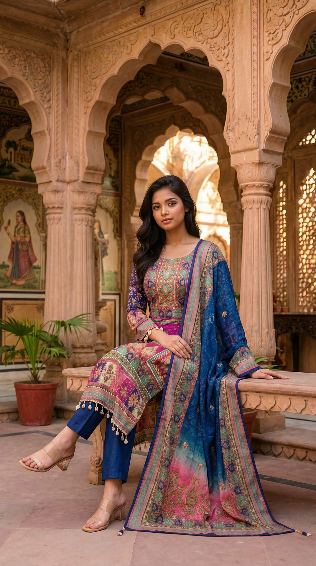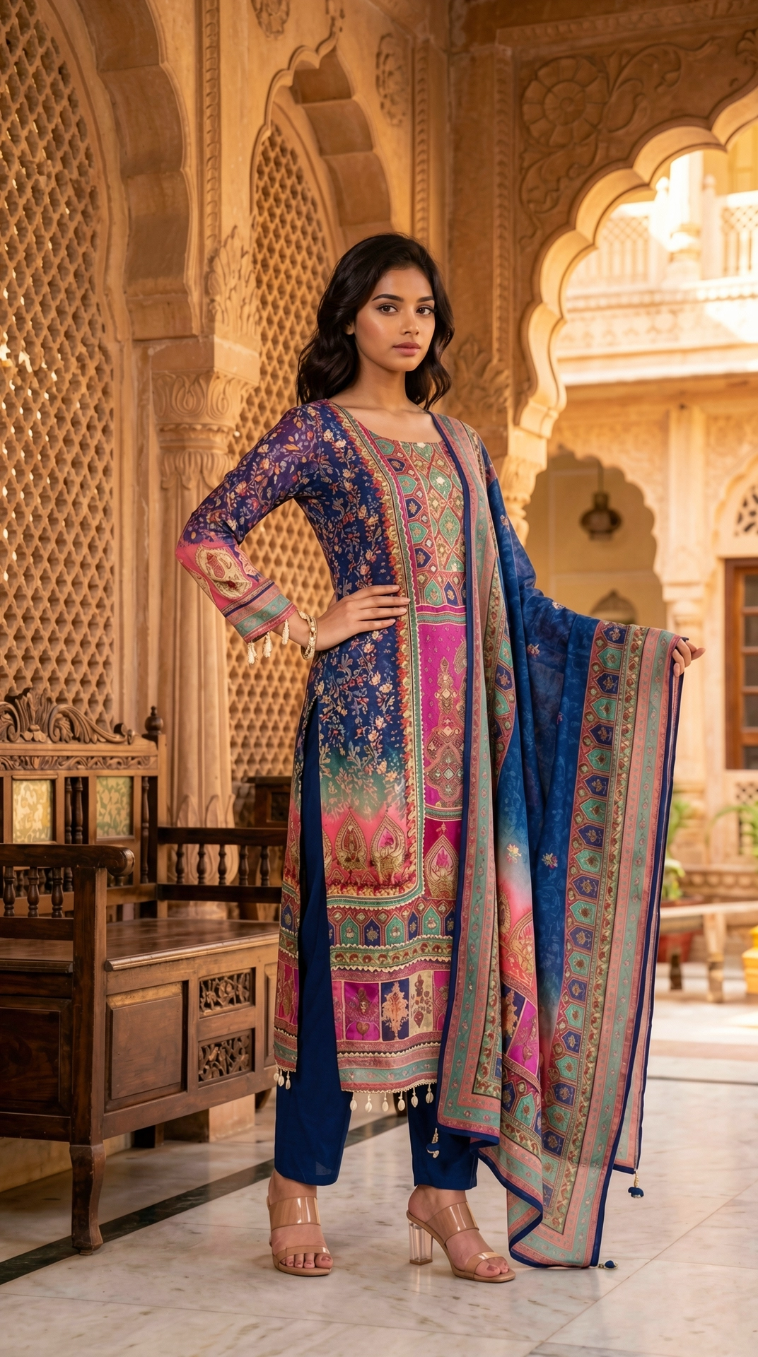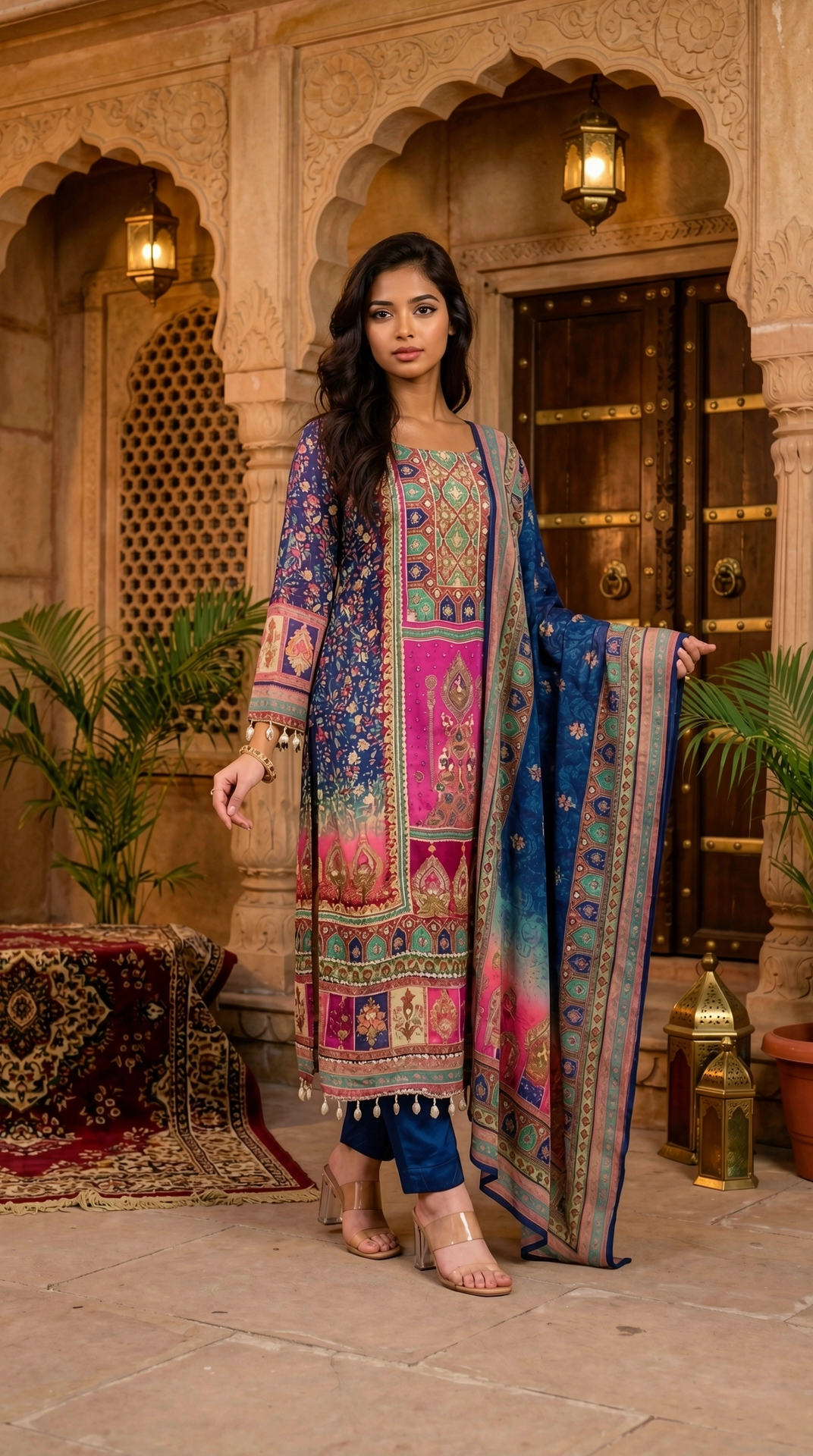 This chinon kurta set features intricate multicolor embroidery with subtle sequin detailing, creating a vibrant and elegant silhouette. Paired with coordinated bottoms and a richly patterned dupatta, the ensemble showcases artisanal craftsmanship, fluid drape, and refined detailing, making it ideal for festive celebrations, cultural gatherings, and stylish ethnic occasions.