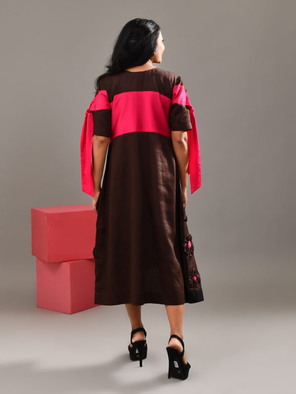 Introducing our chocolate brown blended cotton dress. this piece features a paneled jacket overlay that creates the illusion of a double-layered silhouette. The charming bow detail on the jacket adds a feminine touch, while the intricate patchwork enhances its mysterious allure. Effortlessly sophisticated and contemporary, this dress is a perfect expression of refined taste and confident style.