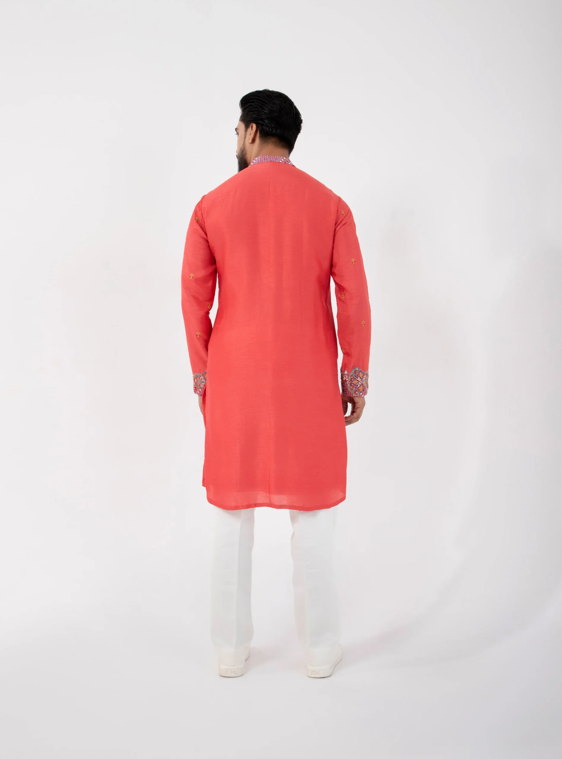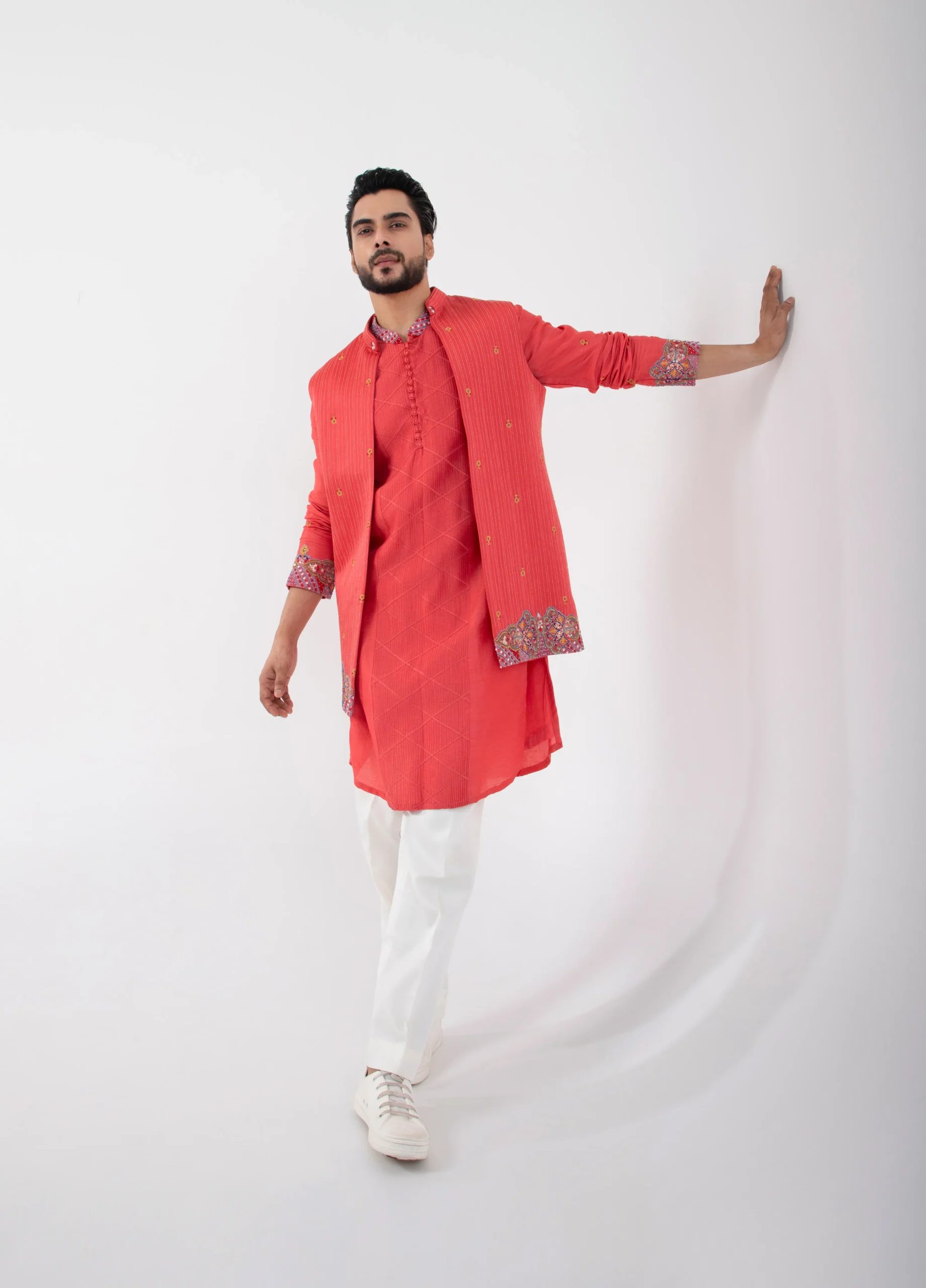 Introducing the coral nehru jacket kurta set — a vibrant expression of refined festive wear. The nehru jacket is crafted in premium linen satin and highlighted with intricate multicolor embroidery that adds depth and celebratory charm. The silk mulmul kurta features delicate detailing that enhances its texture and elegance, while the tailored cotton pants ensure structure and all-day comfort. Designed for weddings, sangeet nights, and festive gatherings, this ensemble delivers a sharp silhouette with a bold yet sophisticated presence.