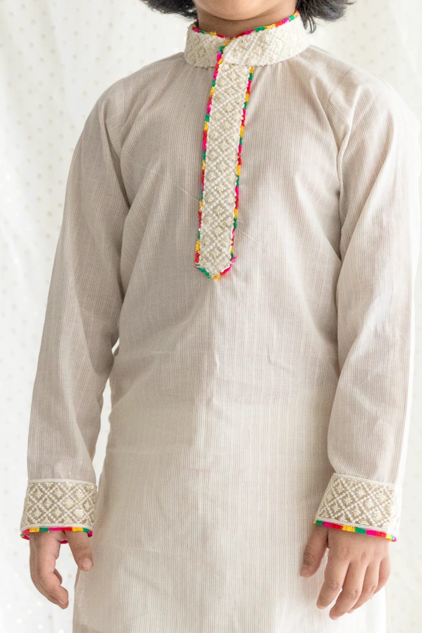 Ivory Striped Kurta With Multicolor Detailing At The Neck