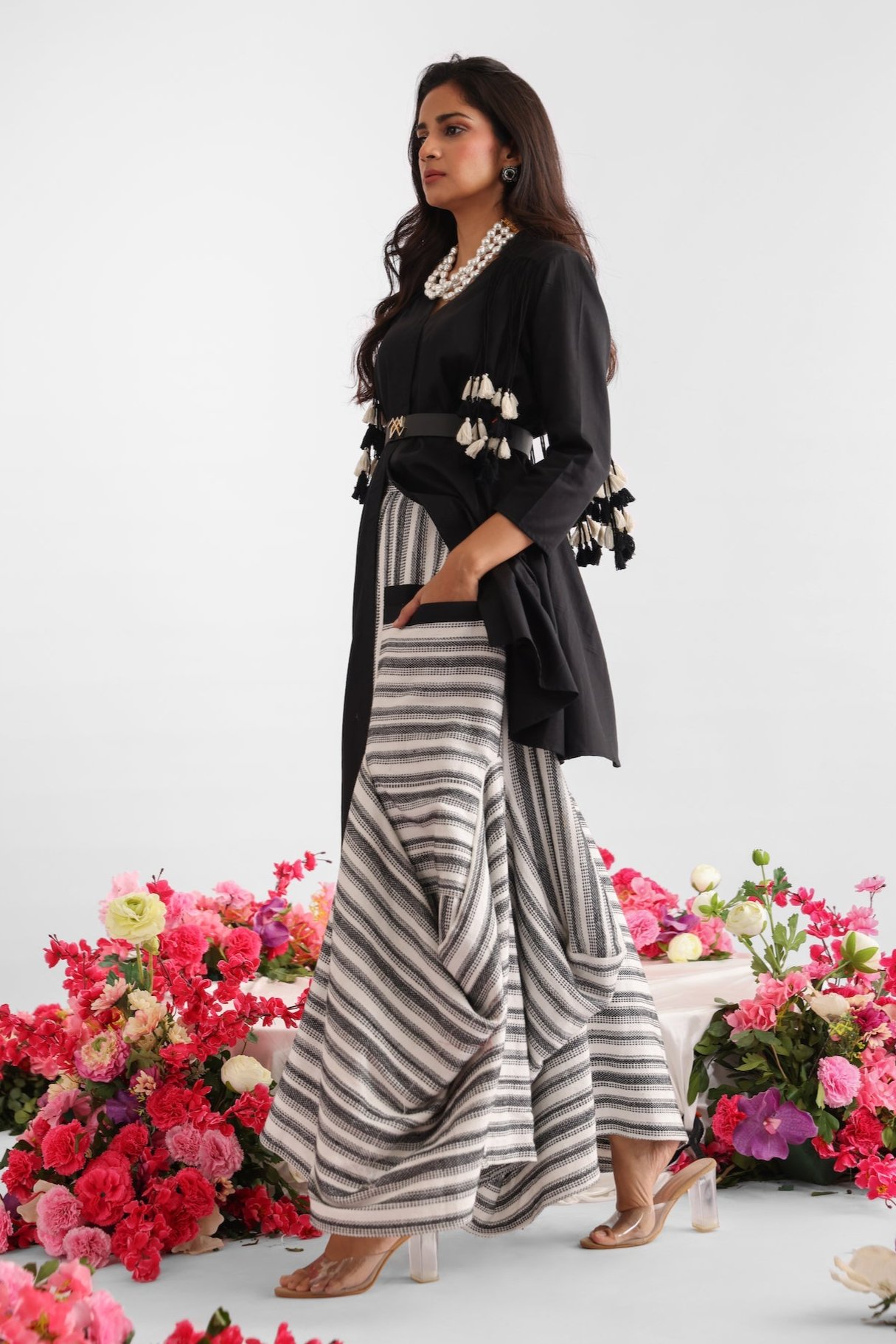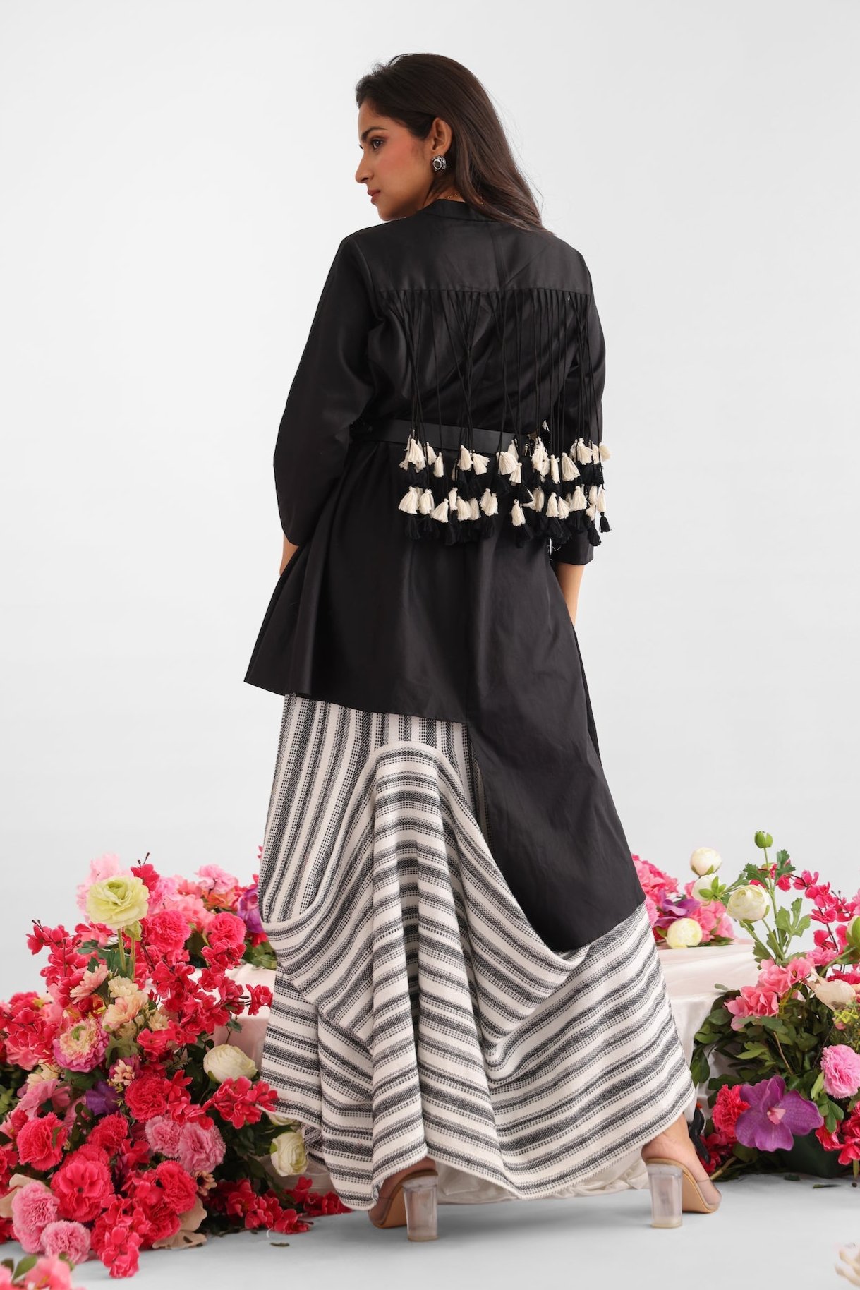 Step into effortless chic with our cotton top adorned with playful tassel details near the shoulders. The monochrome tassels, in black and white, sway gracefully with every movement, adding a touch of whimsy to your ensemble. Paired with our asymmetric drape skirt meticulously stitched to create a unique striped pattern, this ensemble exudes modern elegance. Embrace the artistry of craftsmanship and make a statement with every step.