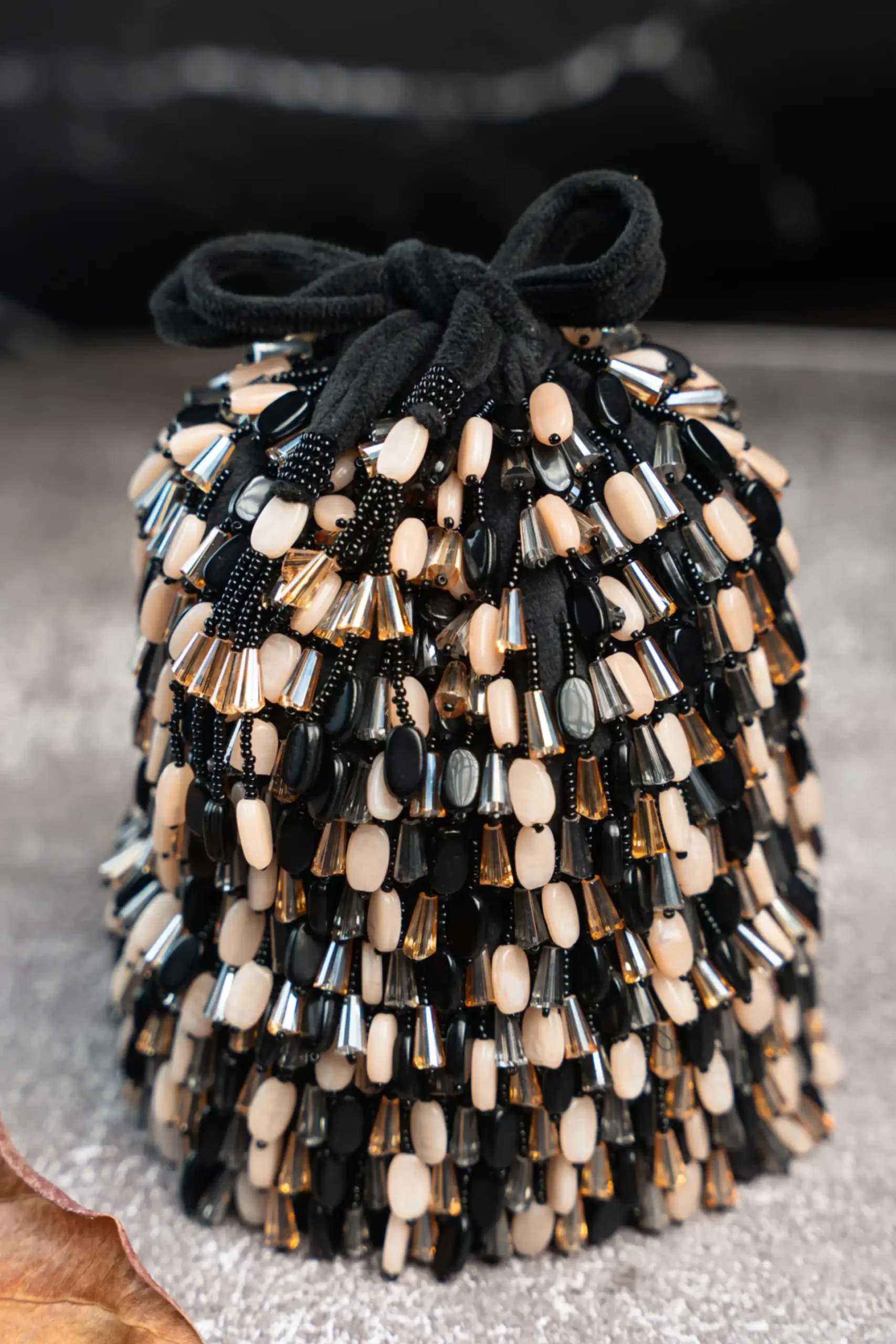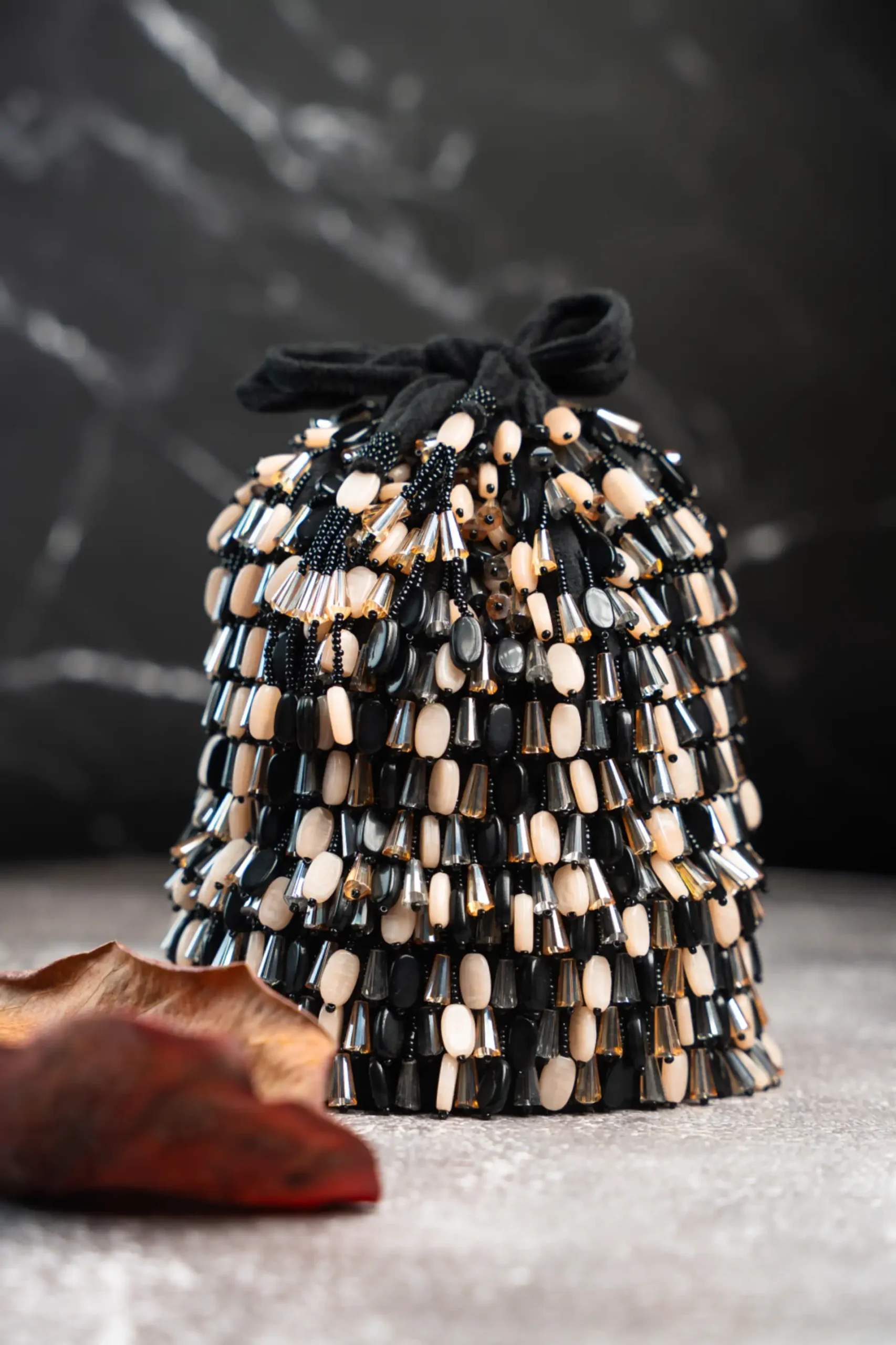 Cream & Black Beaded Tassel Potli with Intricate Handcrafted Work
