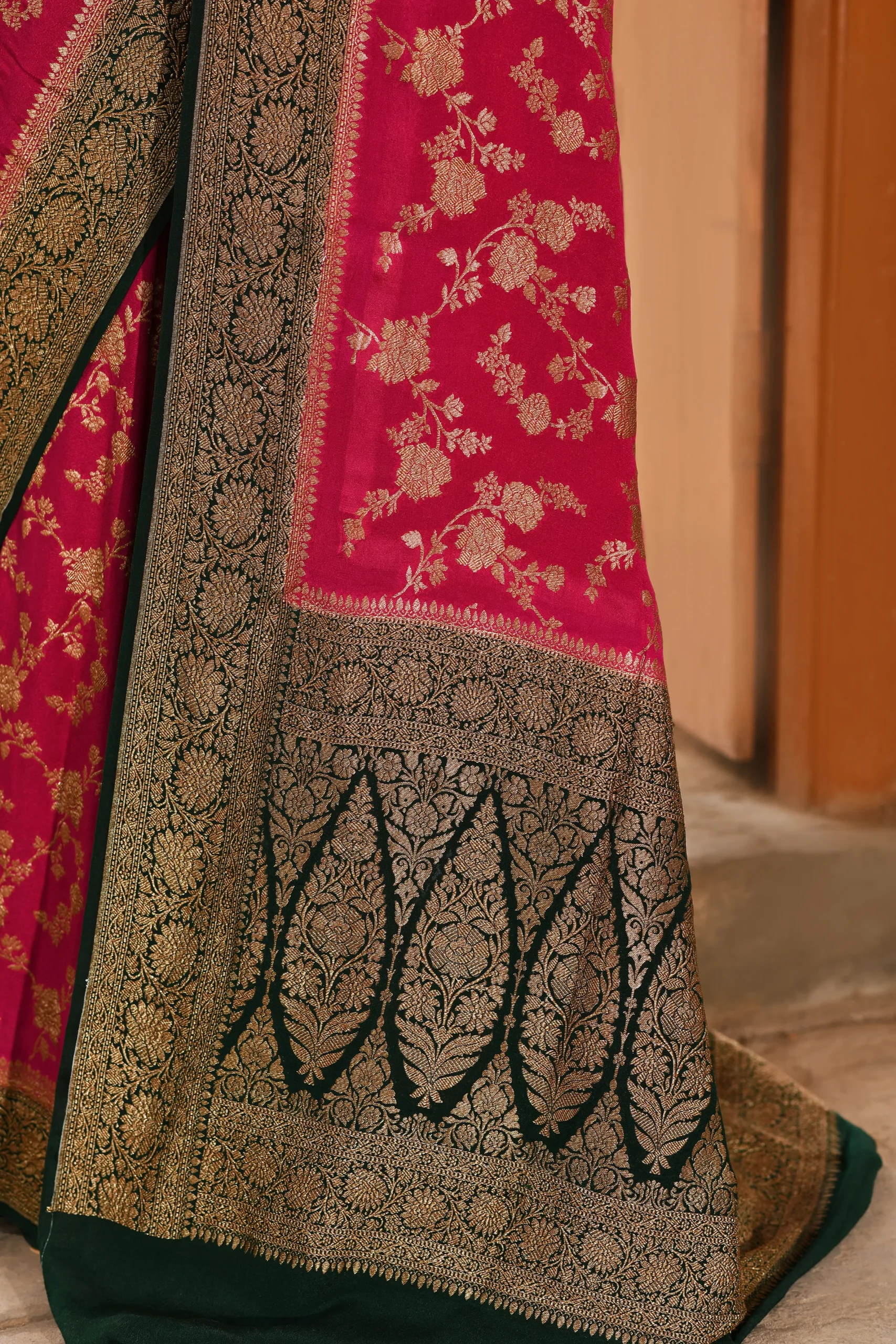 Dark Bottle Green Banarasi Silk Saree with Gold Zari Jaal & Rich Palla