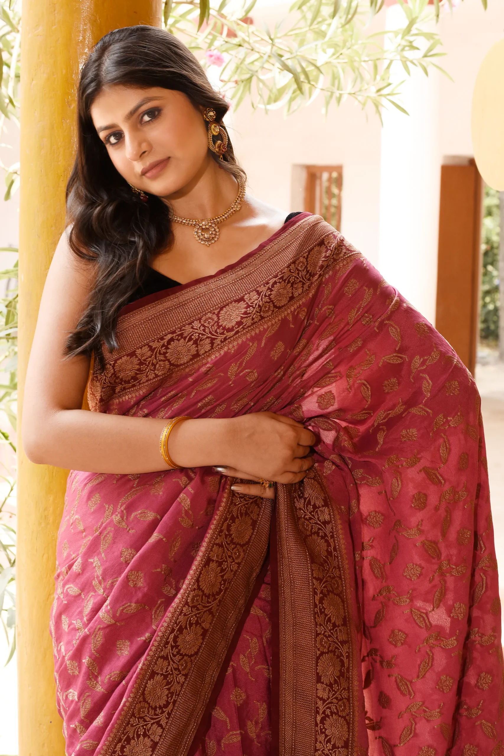 Dark Pink Banarasi Crepe Chiffon Silk Saree with Gold Zari Jaal & Brown Border
