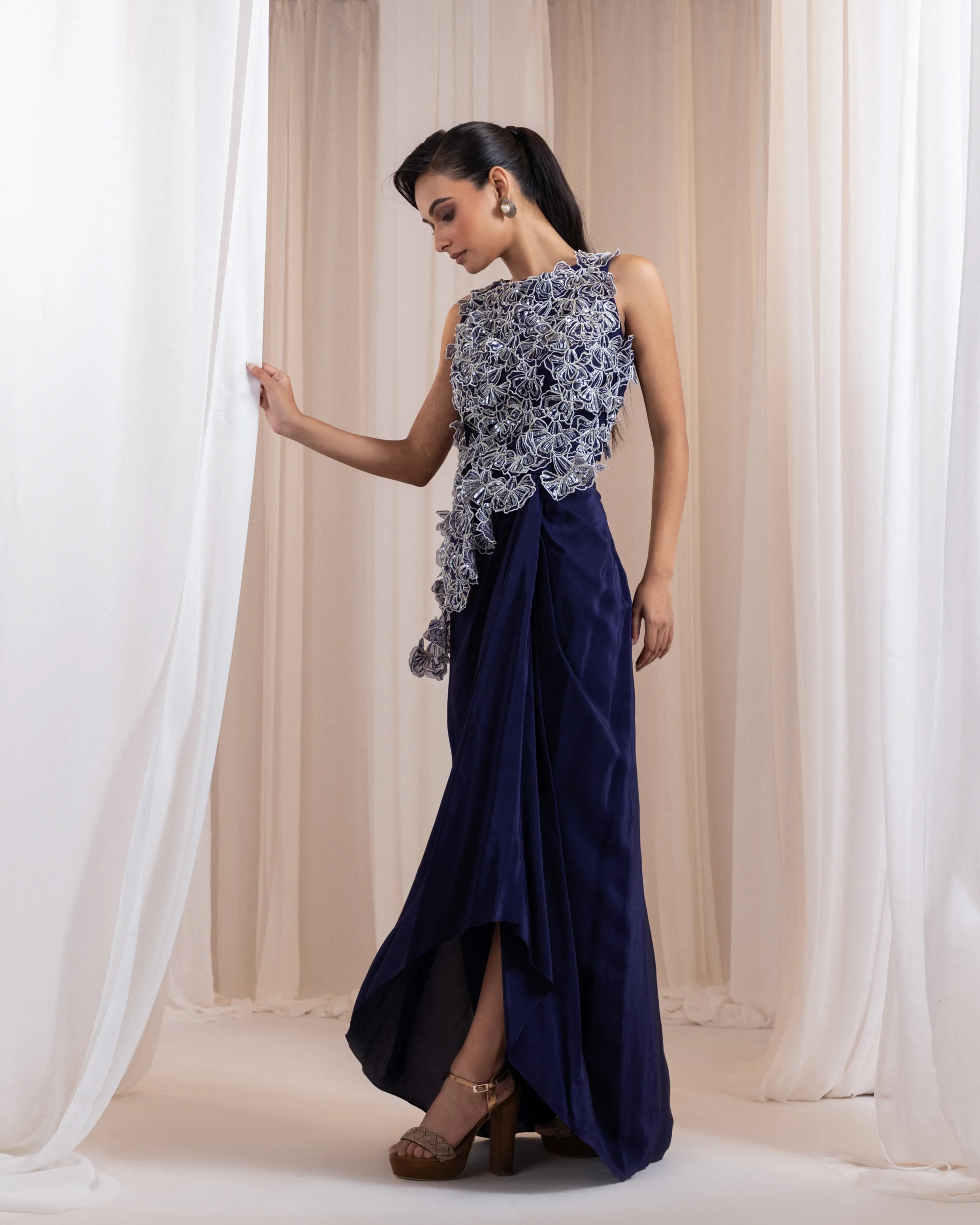A two-piece set in deep indigo blue, featuring a top adorned with 3D floral work and asymmetrical organza appliques, richly embroidered in metallic silver. The knot-drape skirt adds depth and texture with a sculpted finish. A soft sheen runs through the fabric, enhancing its after-dark elegance. Perfect for dinners, cocktail hours, and intimate festive moments.
