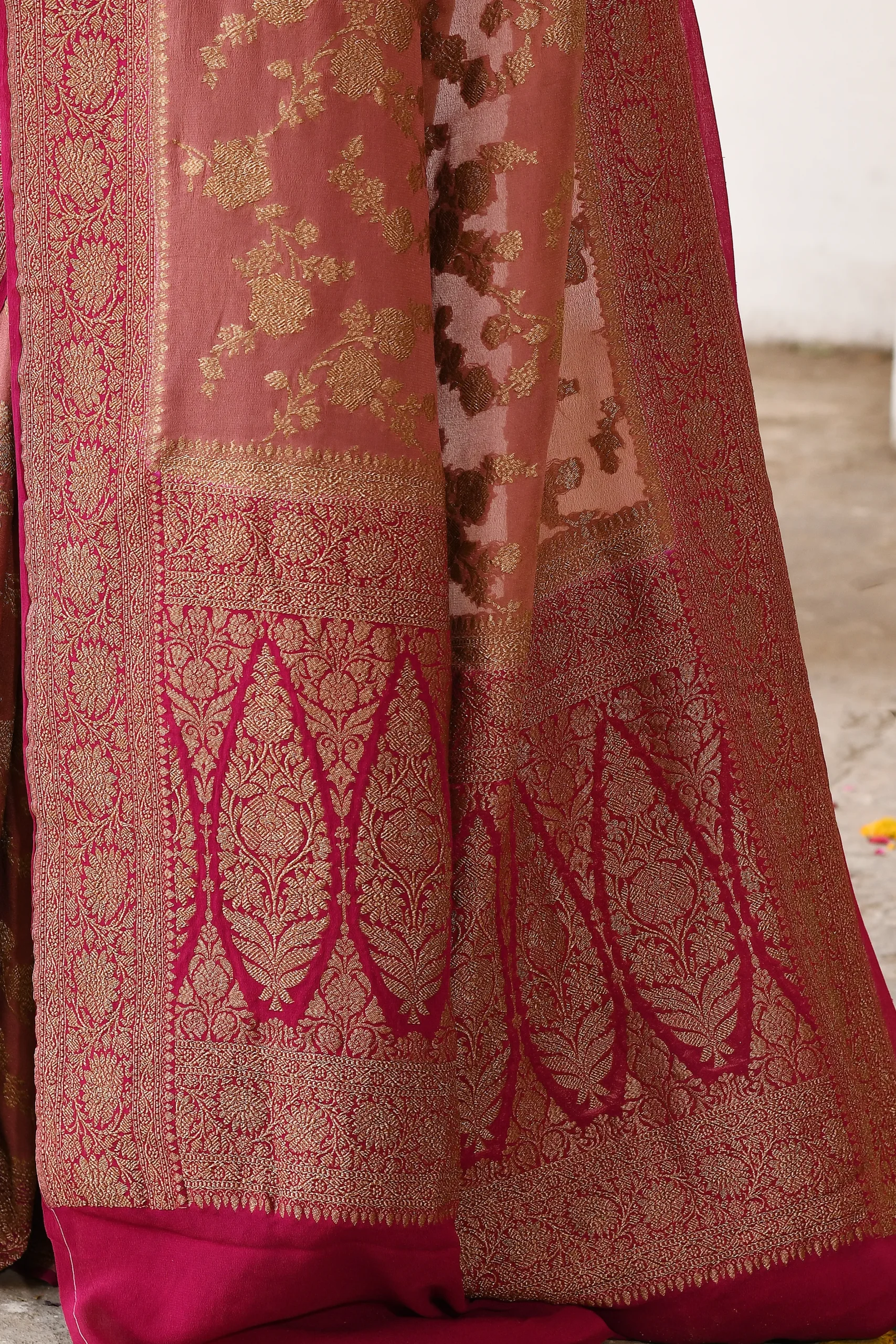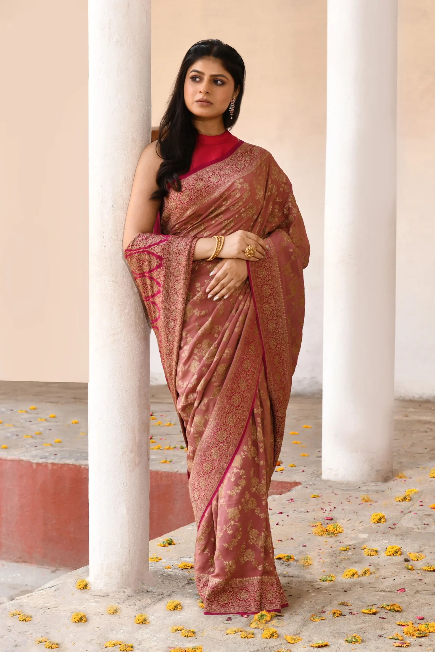 Introducing a regal deep maroon saree adorned with exquisite gold zari floral jaal work all over the body. Enhanced by a traditional red contrast border and pallu, richly woven with dense antique gold zari floral and geometric motifs, this elegant drape comes with a matching running blouse piece perfect for grand festive occasions.