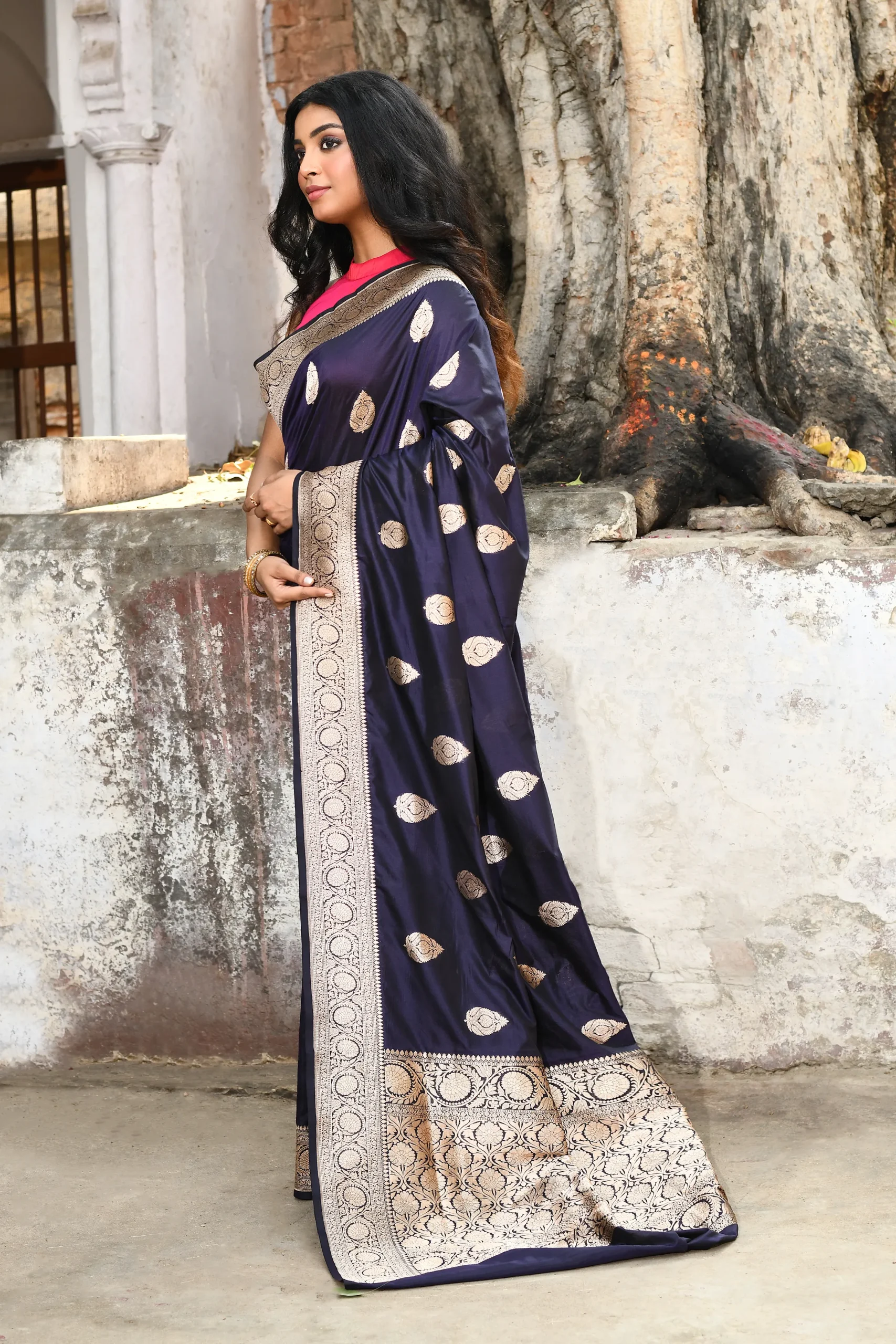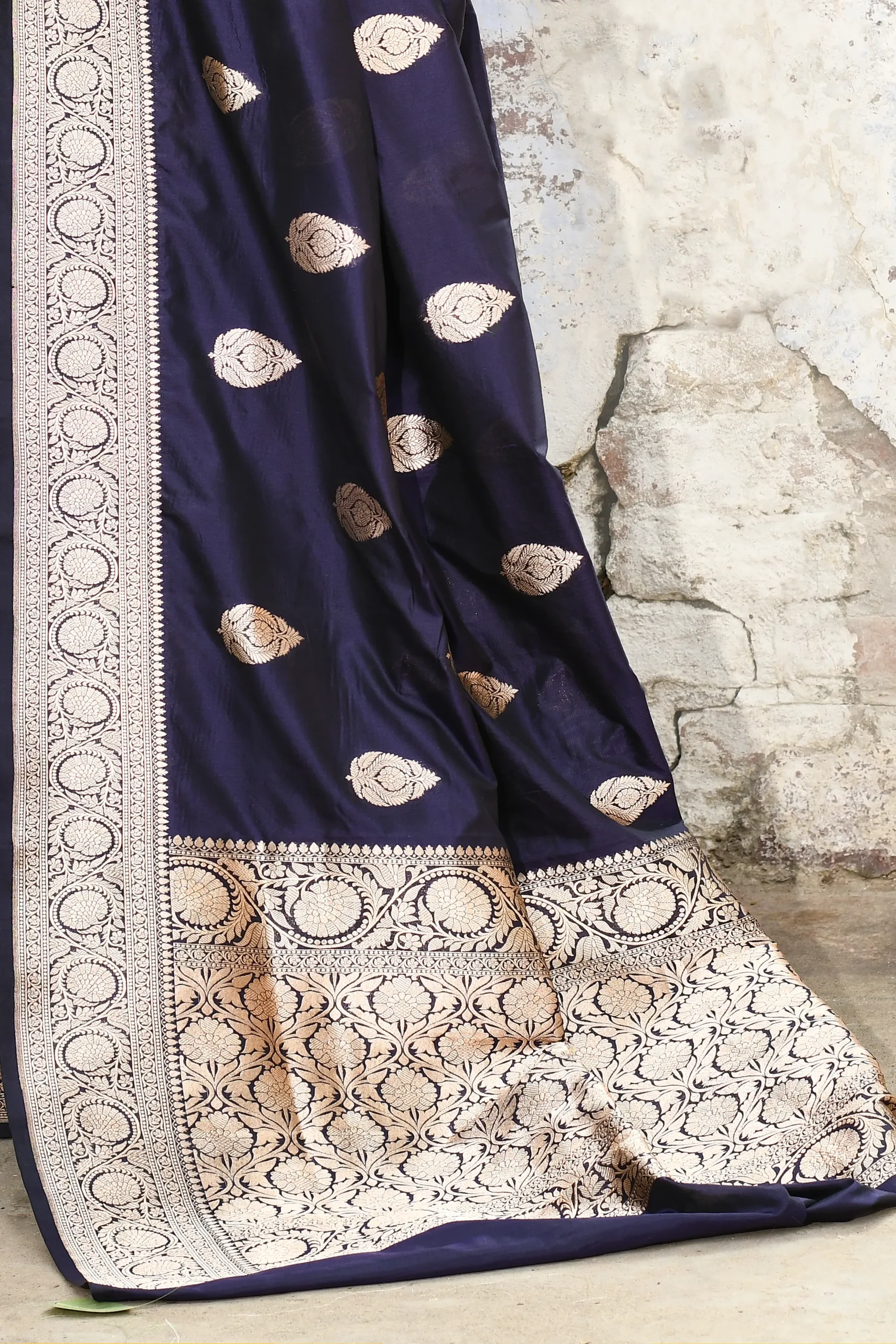 Navy Blue Pure Katan Silk Saree with Antique Gold Zari Butis