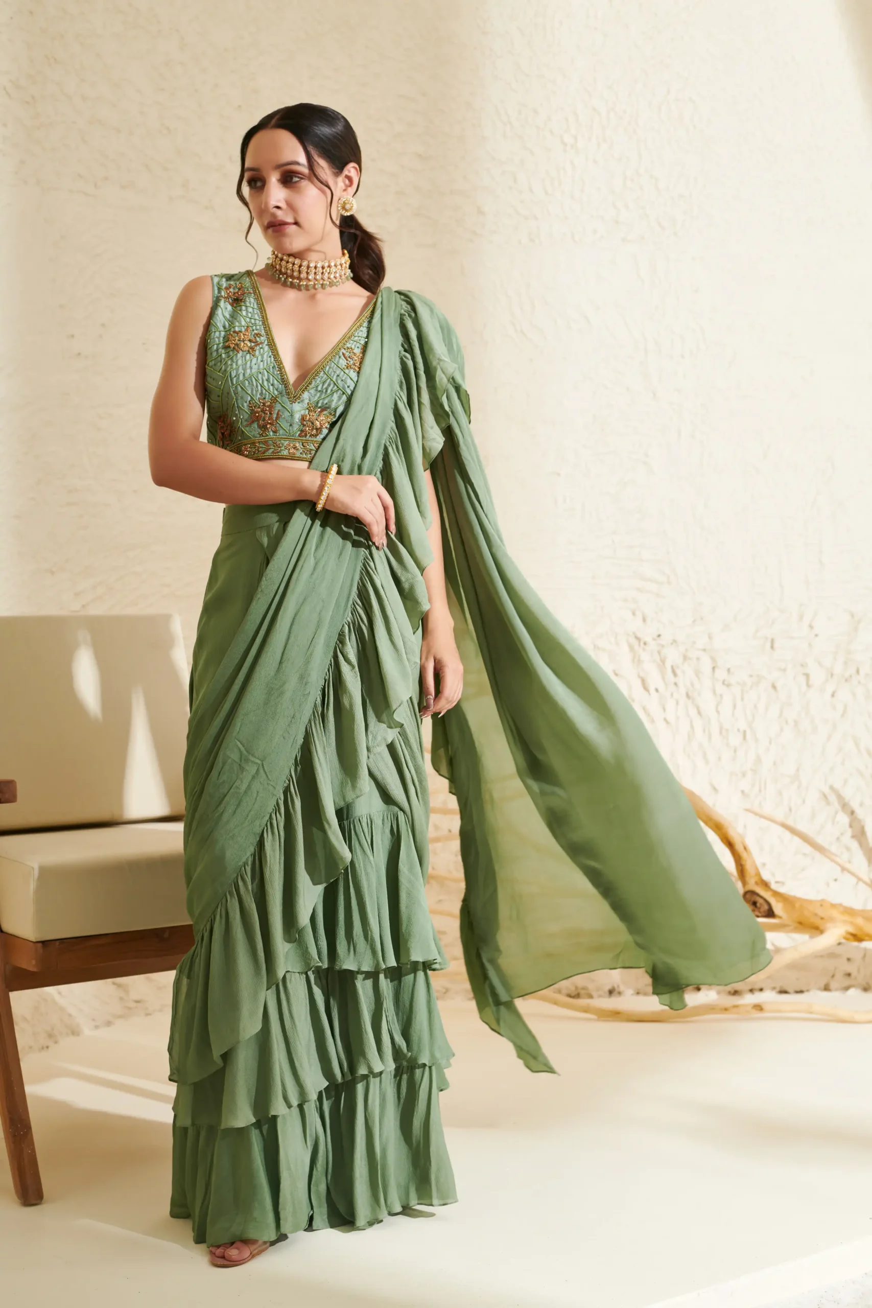 Green Pure Crepe Silk Saree with Antique Silver Zari Floral Butis