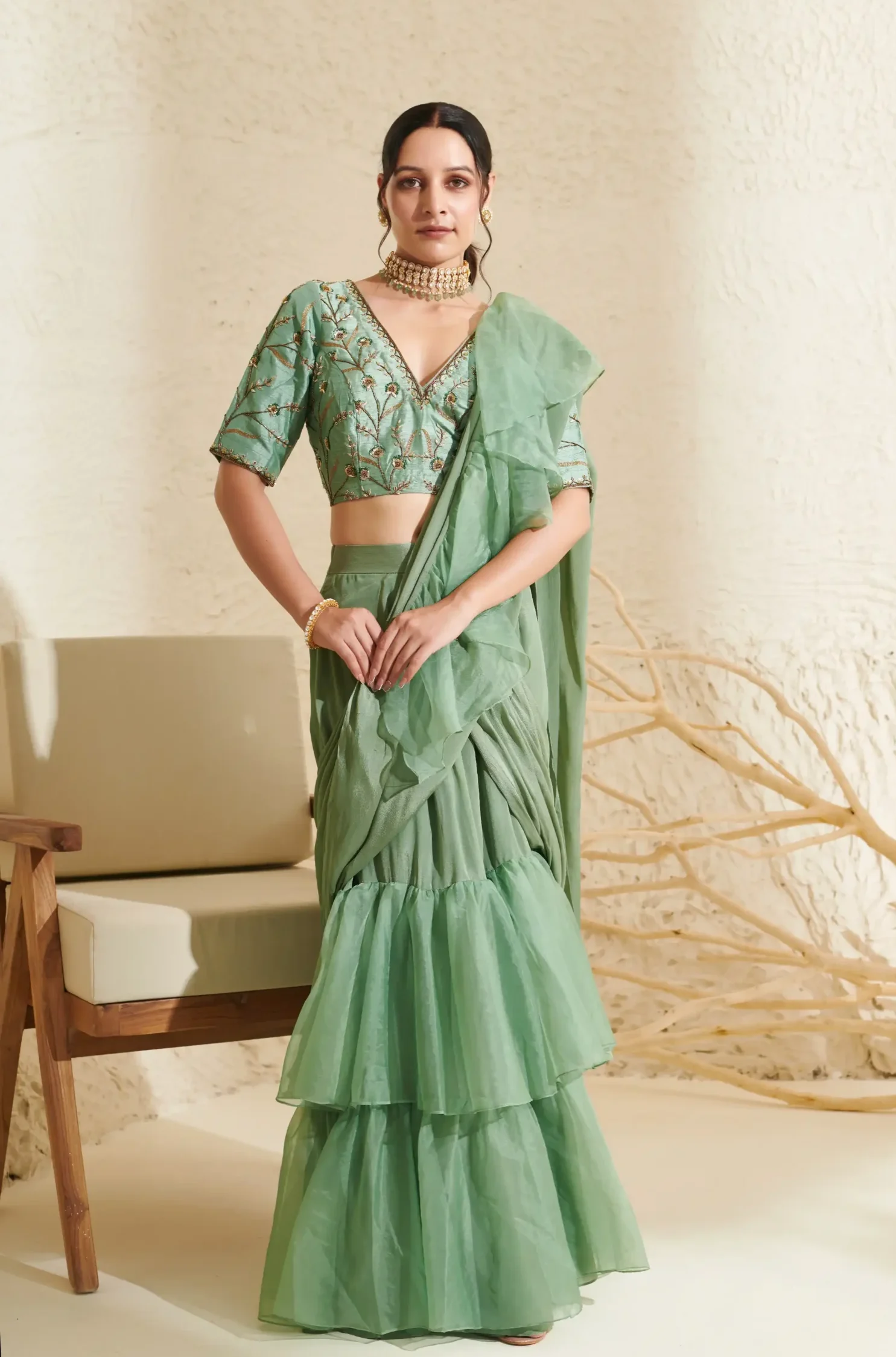 Green pure crepe silk saree with antique silver zari floral butis and ornate border from Golden Muslin By Naaritva Banaras