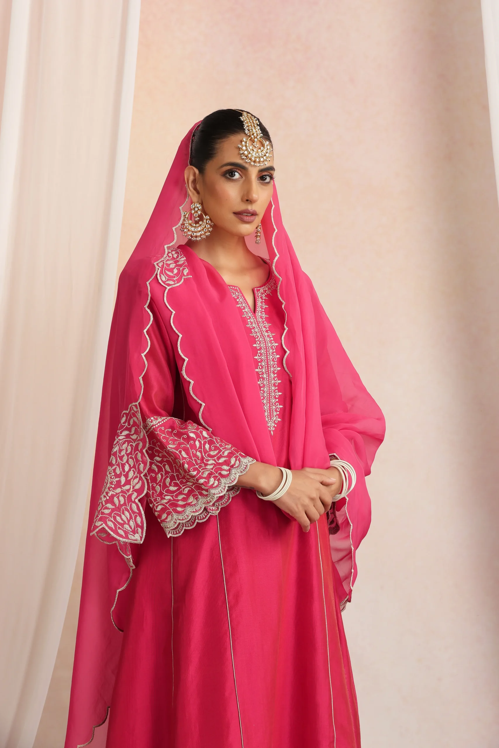 Radiant pink draped embroidered ensemble with cape sleeves from Golden Muslin By Suikala