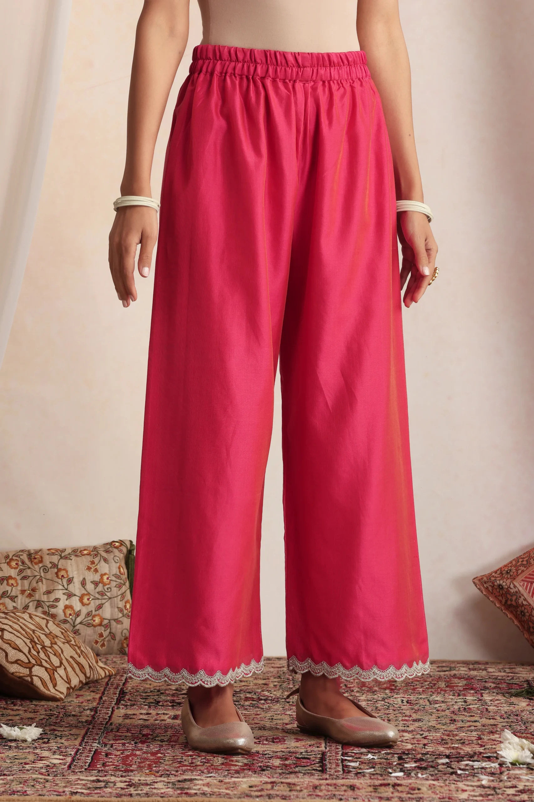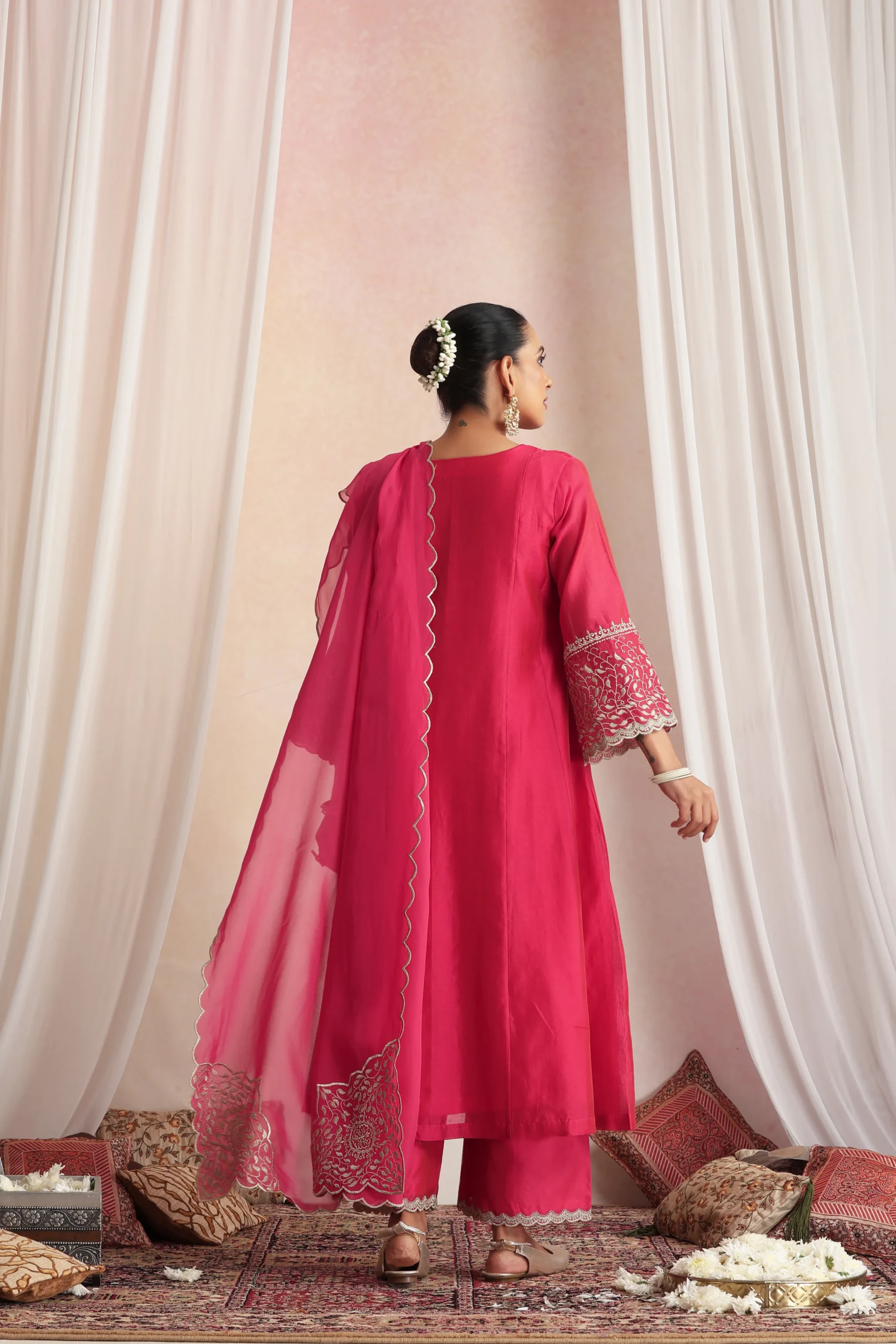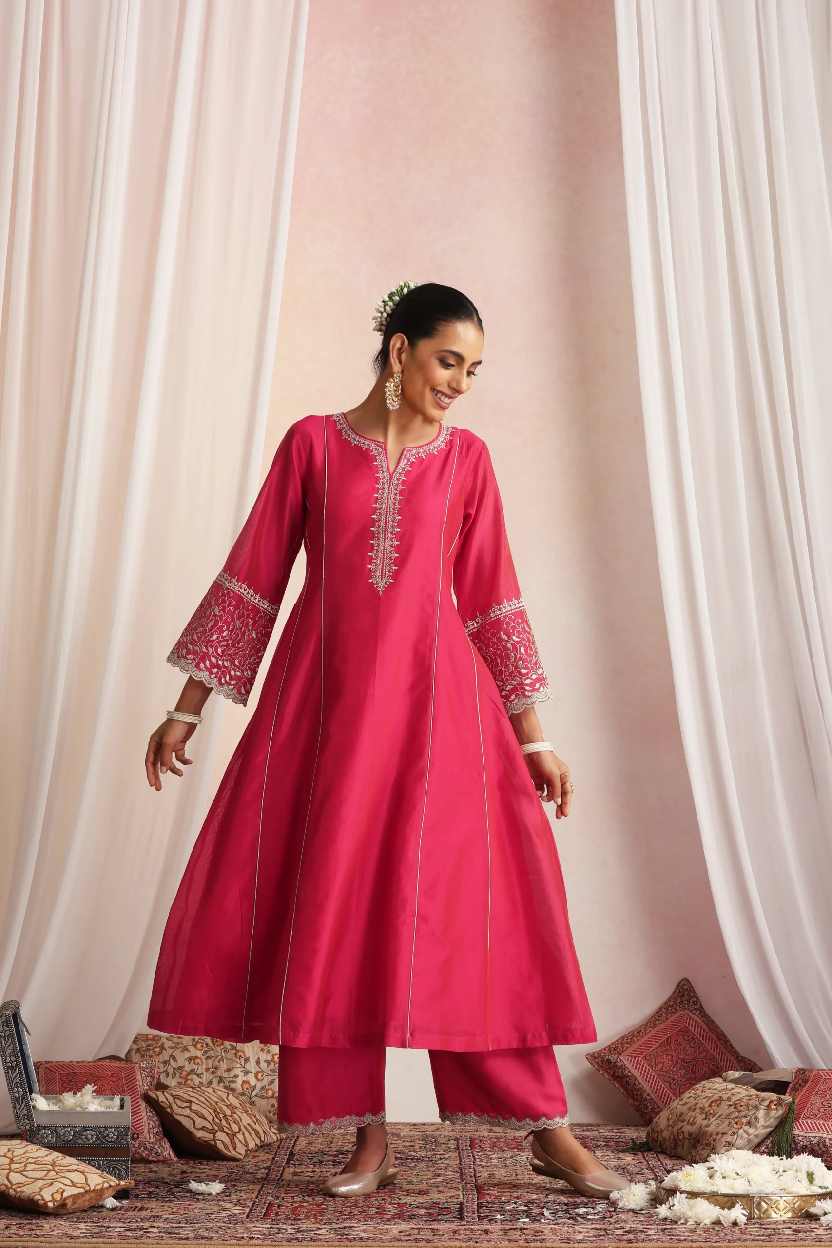 Style this deep pink kurta set with traditional gold or polki jewellery to enhance its rich, festive appeal. Pair it with metallic heels or embroidered juttis for a balanced ethnic look.