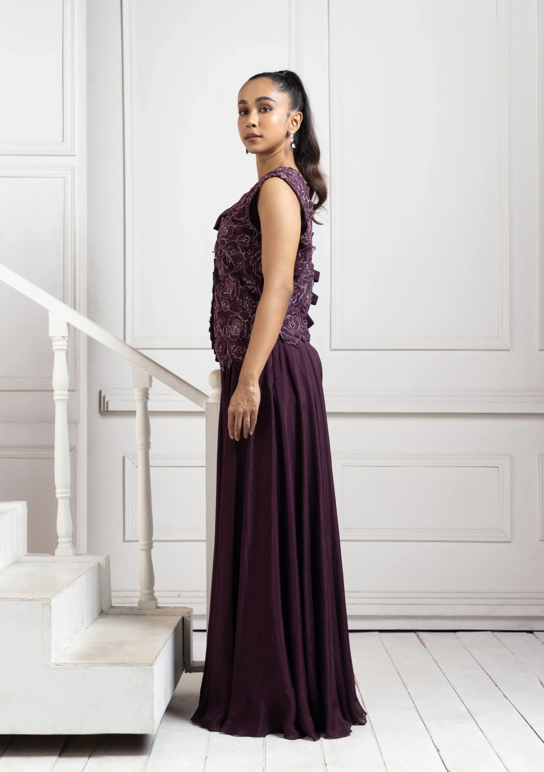 Introducing a refined deep plum set that blends artisanal detail with modern elegance. Featuring a sculpted bodice with tonal embroidery and textured floral appliqués, paired with fluid wide-leg trousers. The V-neckline, cap sleeves, and cinched waist create a flattering draped silhouette, making it ideal for evening galas and upscale celebrations.