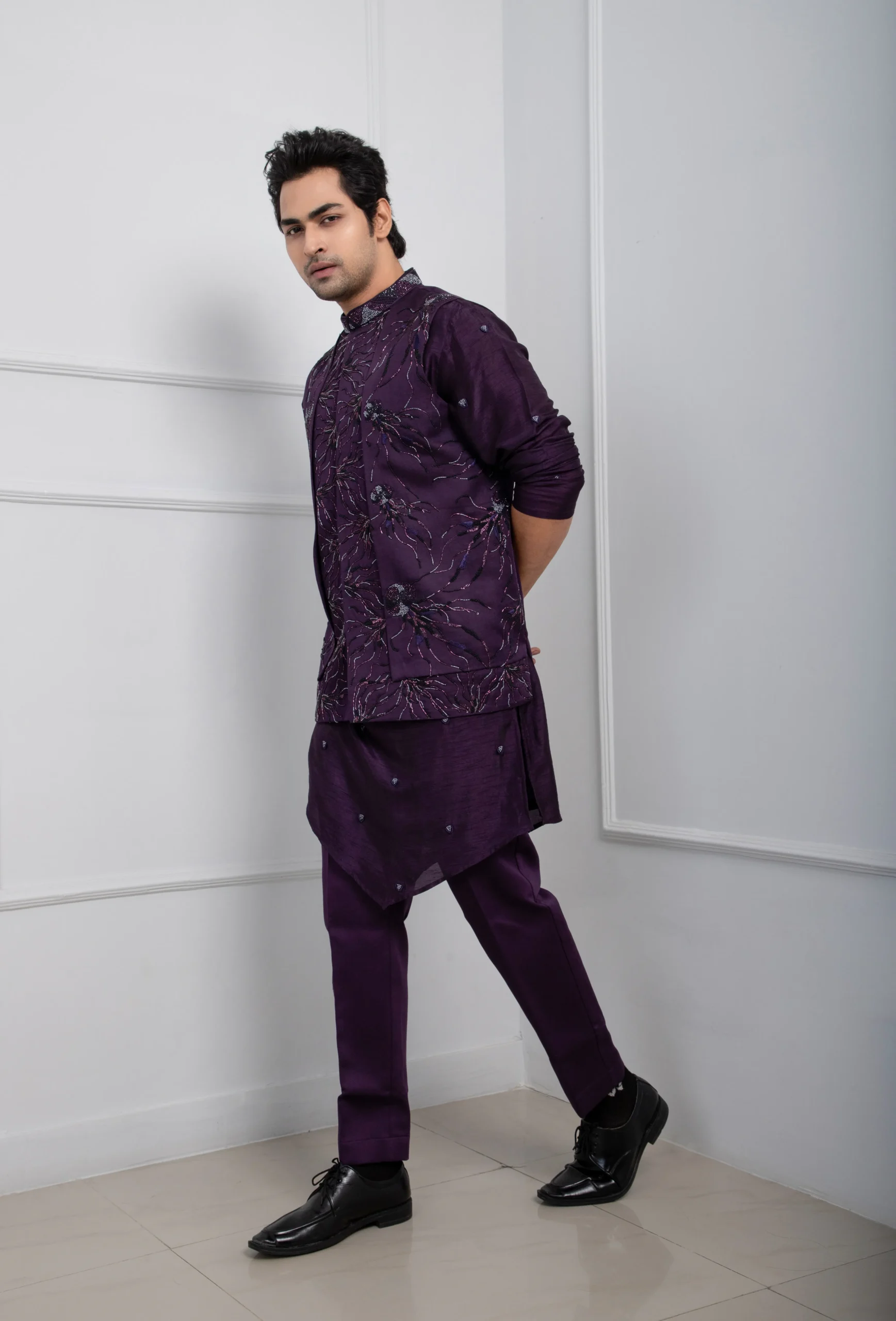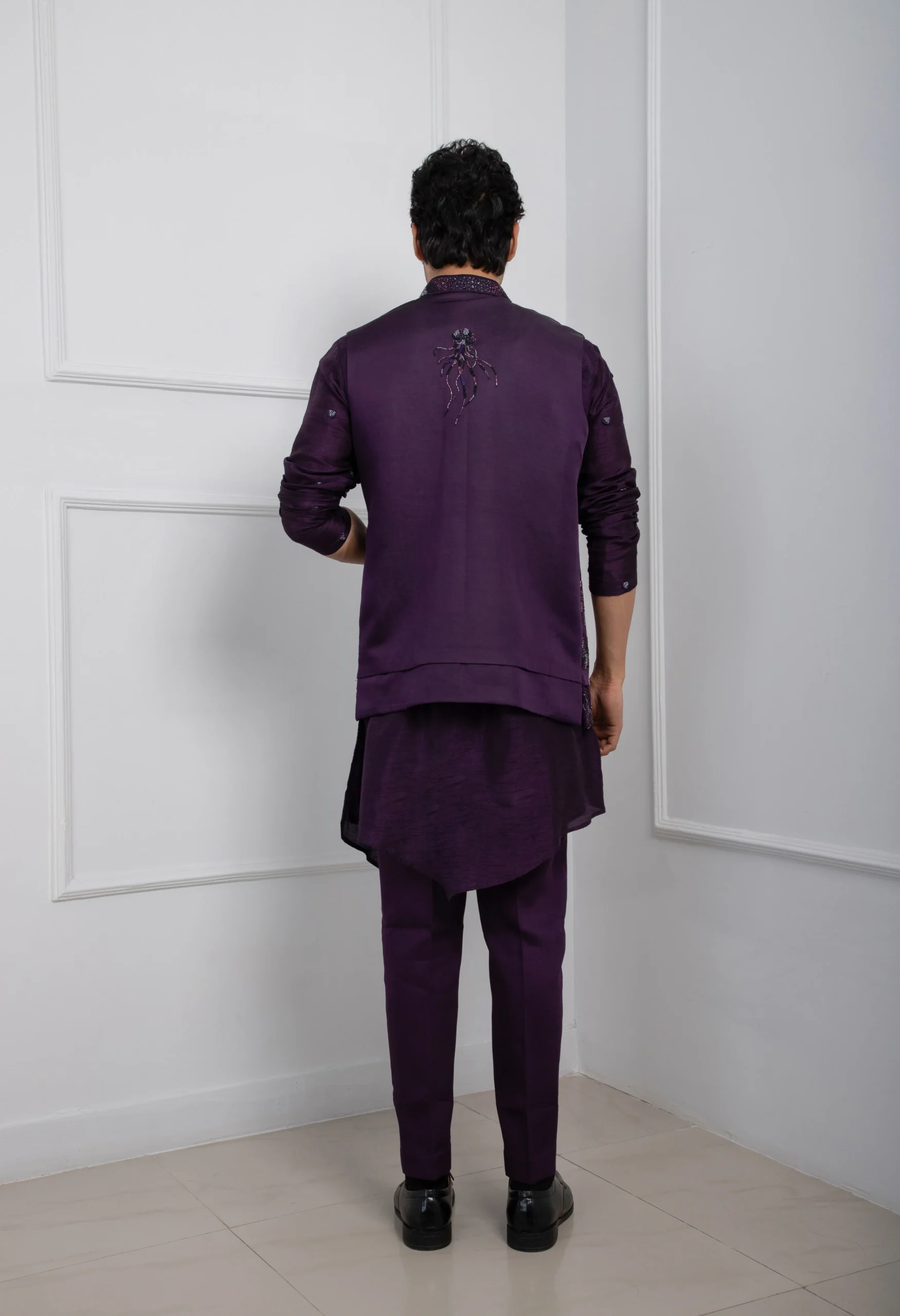 Introducing our exquisite deep purple Nehru Jacket set, a masterclass in modern ethnic wear. Crafted from premium silk, it features intricate tonal floral embroidery with subtle sequin highlights for a sophisticated shimmer. The structured silhouette is paired with a unique asymmetric kurta and slim-fit trousers, making it the perfect choice for weddings and festive celebrations.