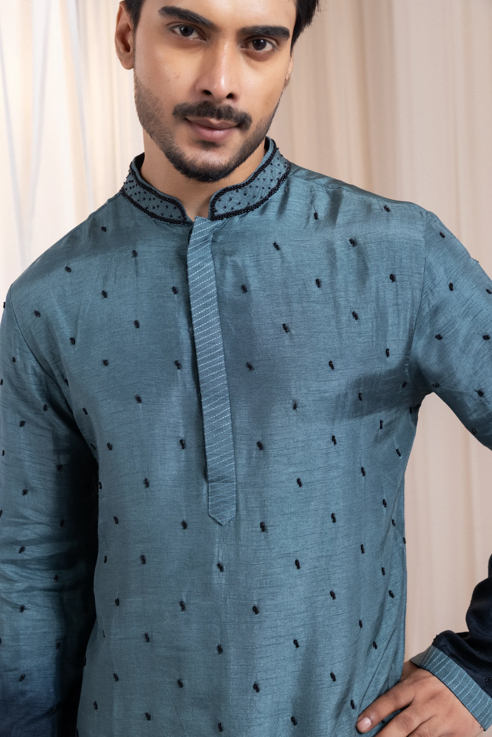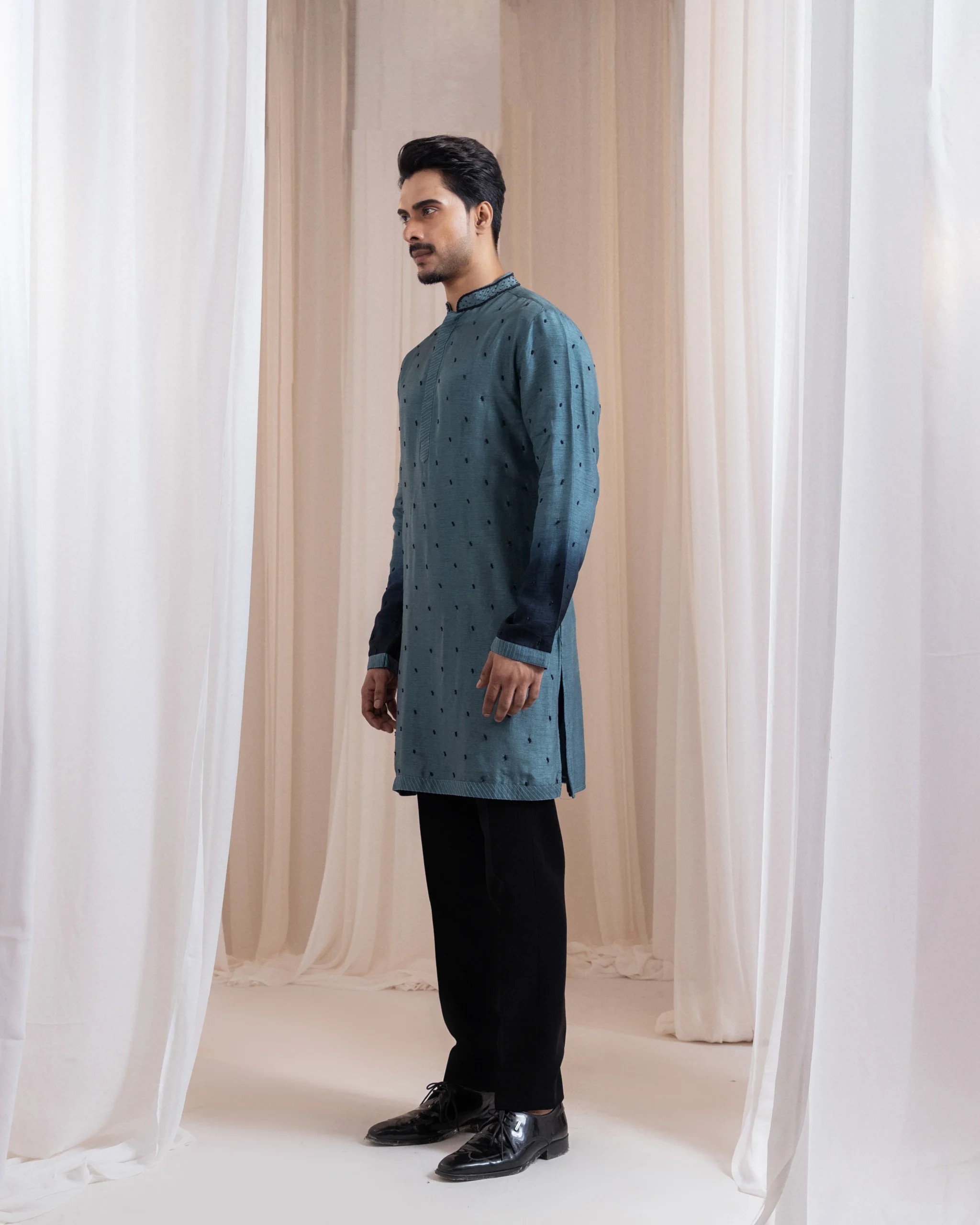 Introducing a deep teal two-piece kurta set designed with a subtle gradient effect on the cuffs and delicate scattered black bead embroidery throughout. The minimal detailing enhances its rich tone while preserving a clean, classic silhouette. Understated yet refined, this ensemble is perfect for festive gatherings and semi-formal occasions with effortless sophistication.
