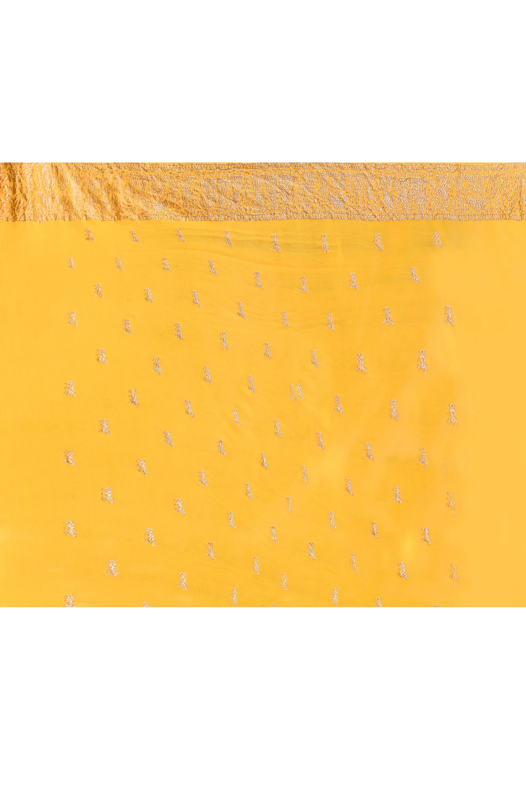 Introducing a luxurious deep wine pure Banarasi crepe chiffon silk saree, handwoven with dense all-over floral jaal weaving in antique gold zari. Accentuated by a richly woven traditional mustard border and contrasting pallu inspired by classic Banarasi motifs, this elegant drape comes with a matching running blouse piece perfect for grand festive occasions.